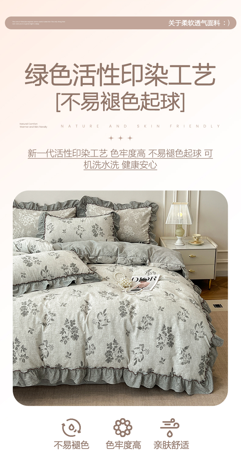 商品名称:逸林家纺《原希尔顿逸林》 2025秋冬新品加厚高克重亚麻复古原麻皱皱纱印花四件套法式花边 莱茵河畔