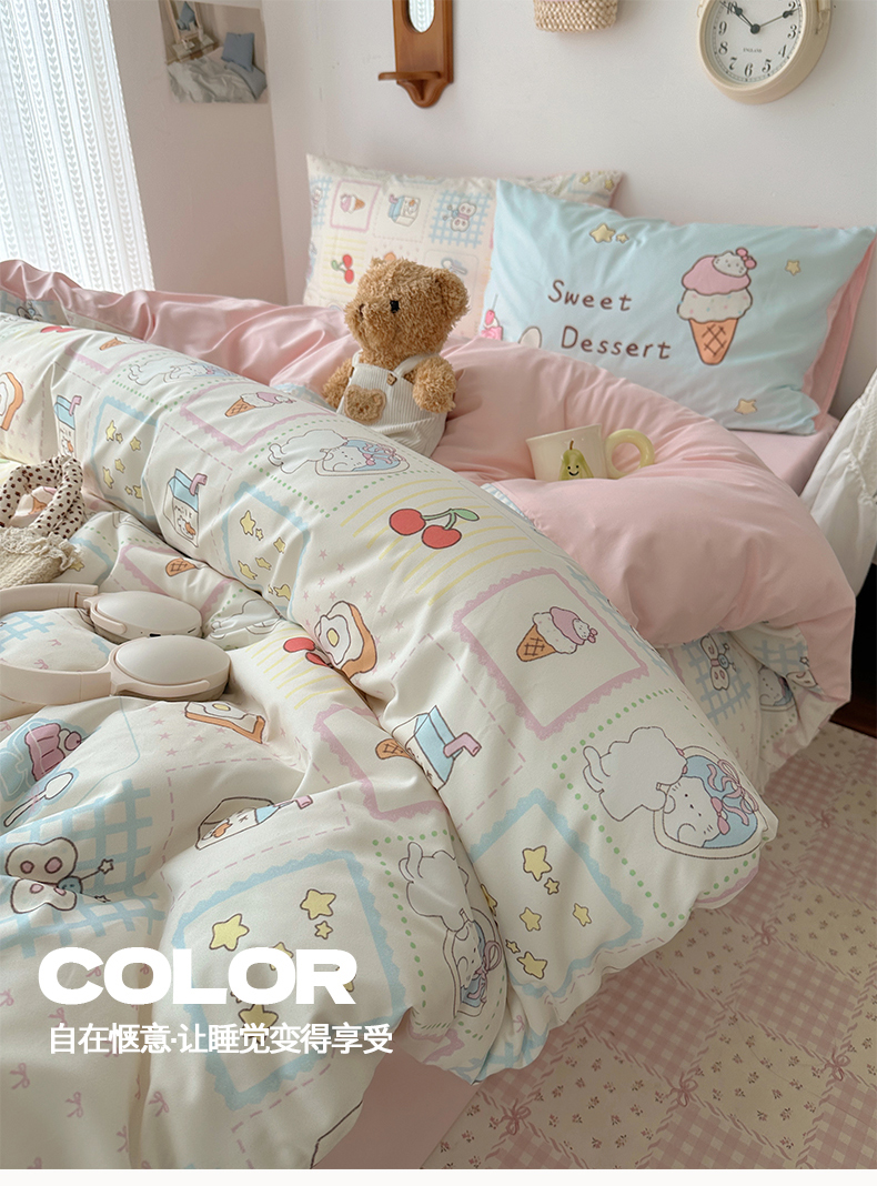 当前位置: 91家纺网 > 商品网购 > 床品套件 > 四件套 > 水洗棉四件套 > 桃心家居 2025新款A类亲肤舒适软糯云柔水洗棉数码印花混搭四件套-少女卡通奶乎乎 云柔水洗棉-混搭甜品屋