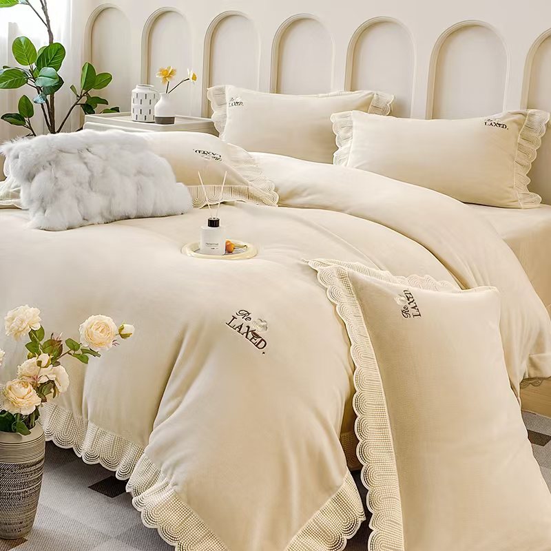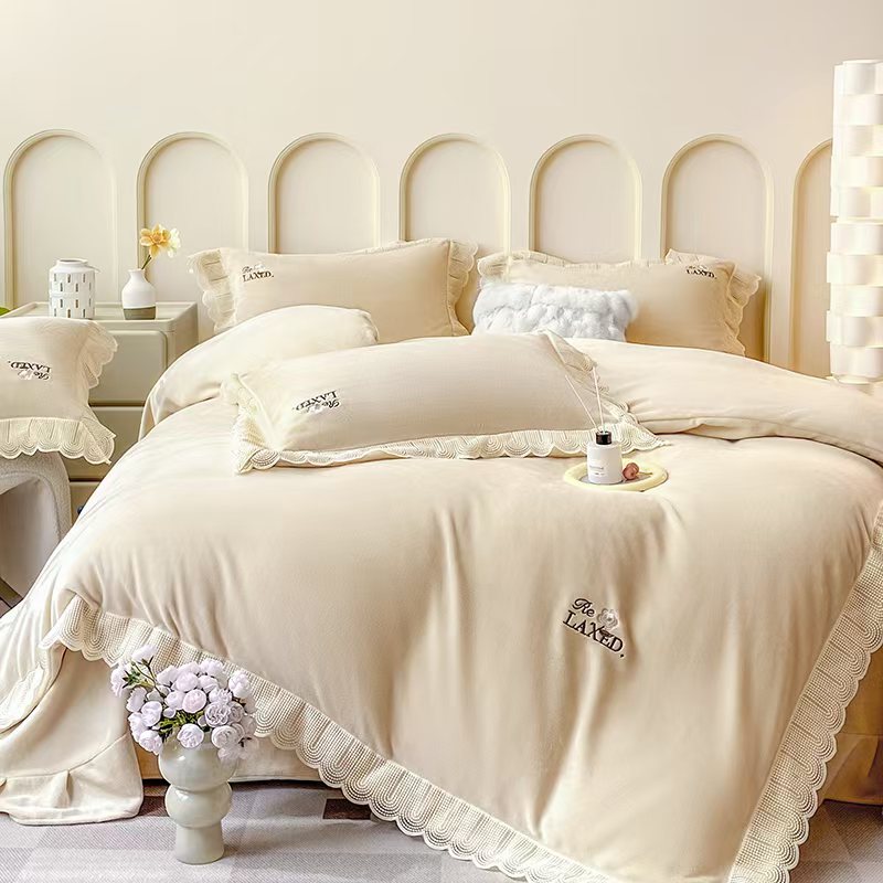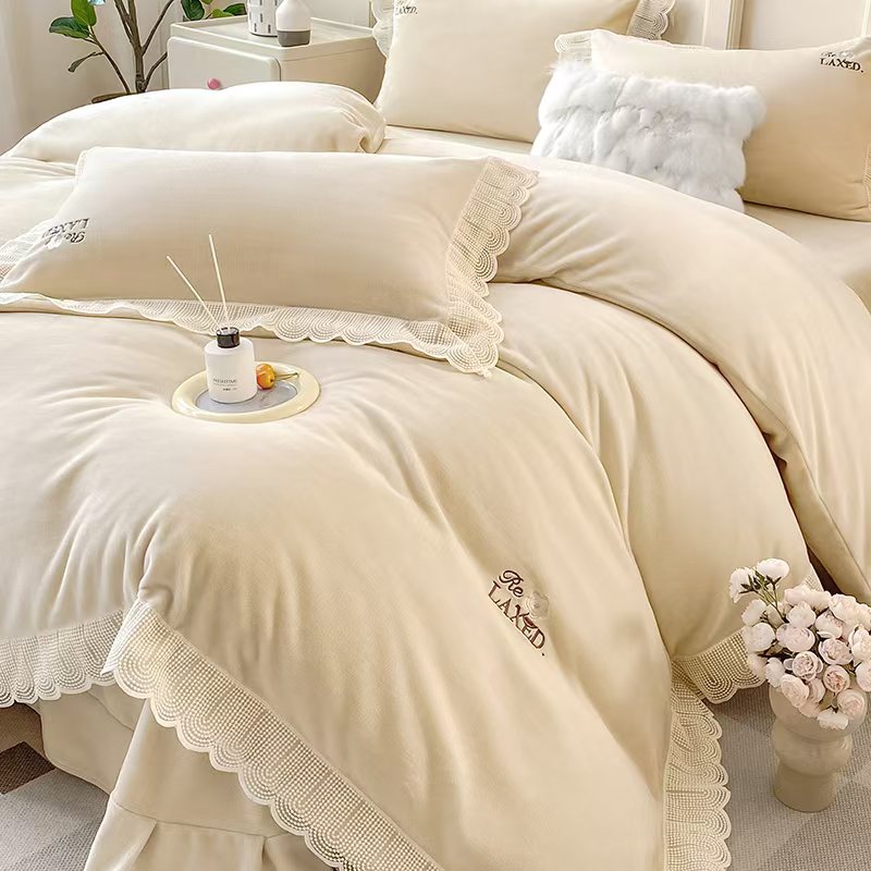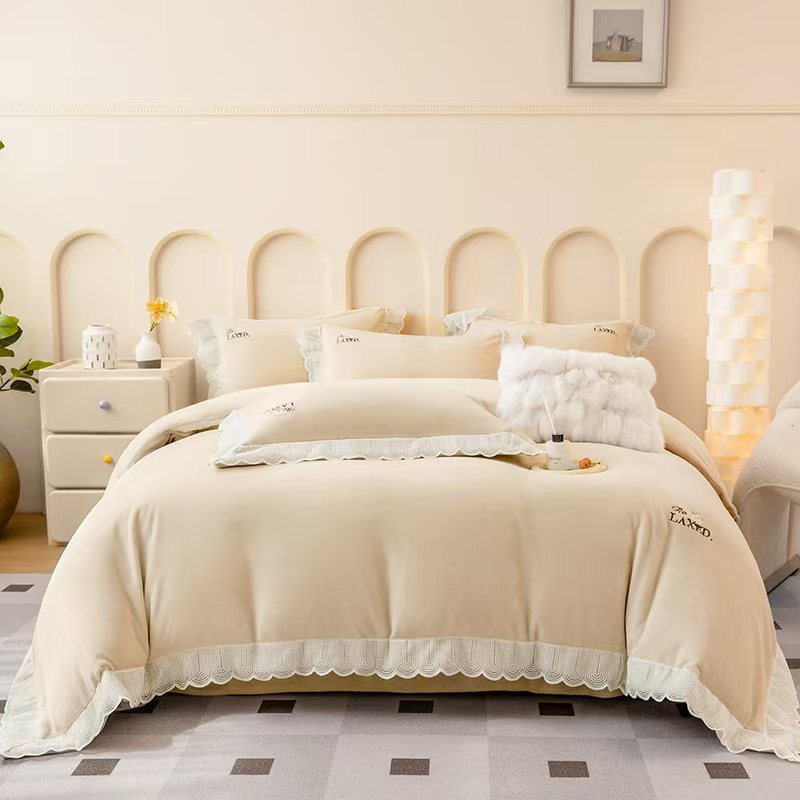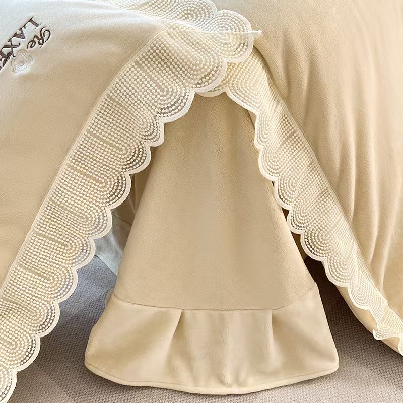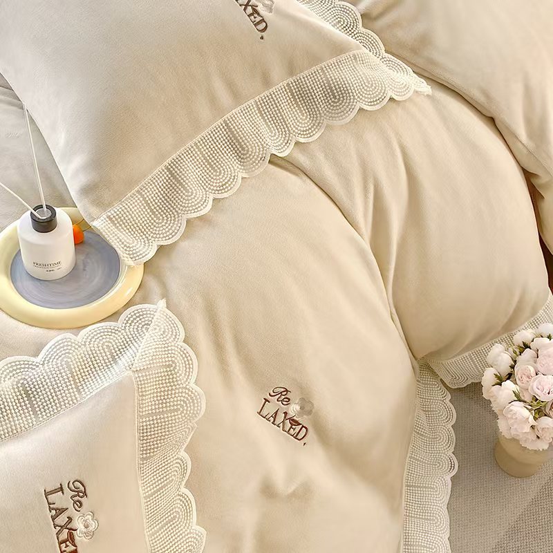 商品名称:2025新款公主风雷斯花边刺绣牛奶绒四件套 少女风-奶咖