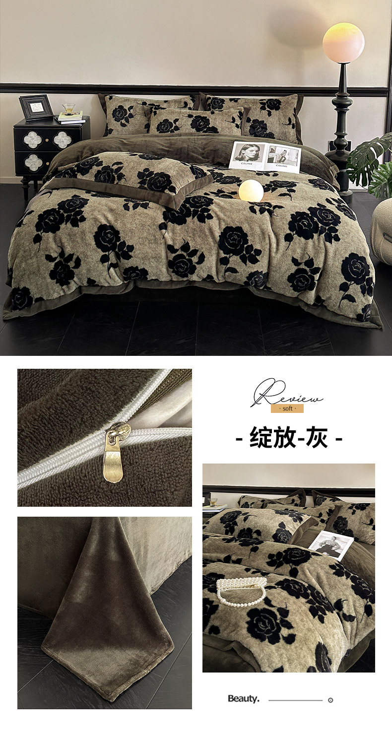 商品名称:绒世界 2025秋冬新款丹麦绒宽边牛奶绒四件套 宽边兔绒-绽放-灰