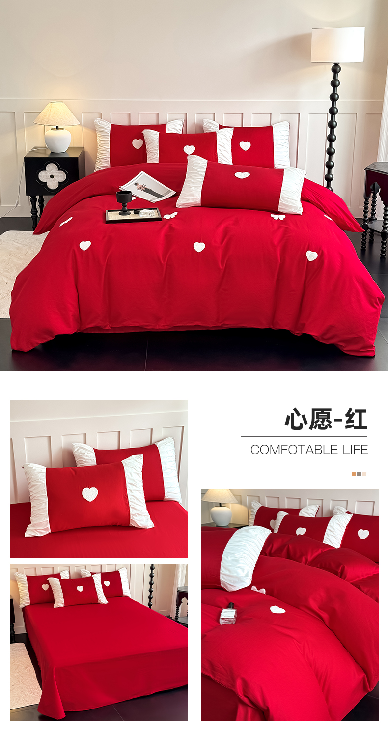 (总)理想家家纺 2025新款纯棉轻奢刺绣四件套--心愿系列场景二,心愿粉,心愿红,心愿黄,心愿蓝