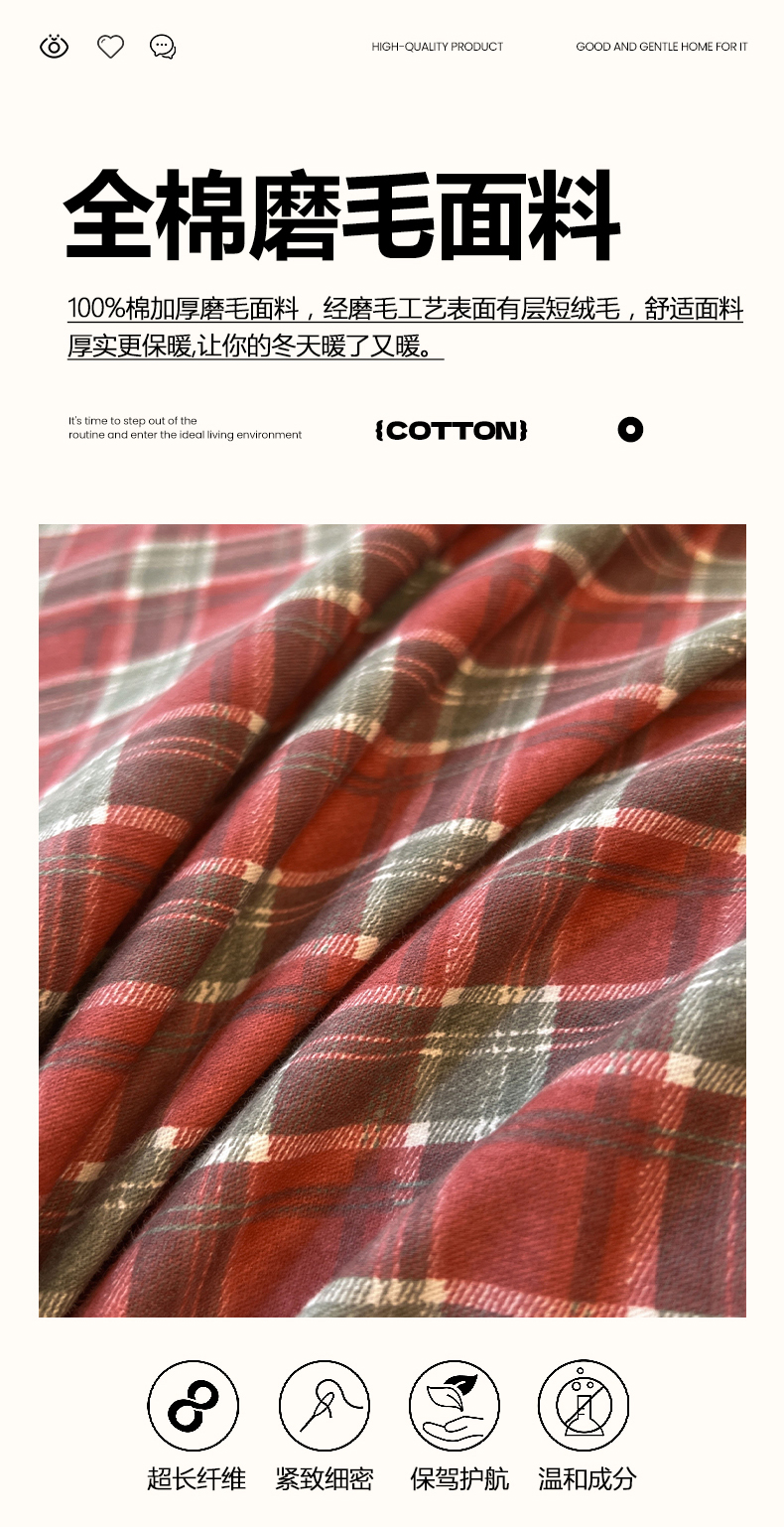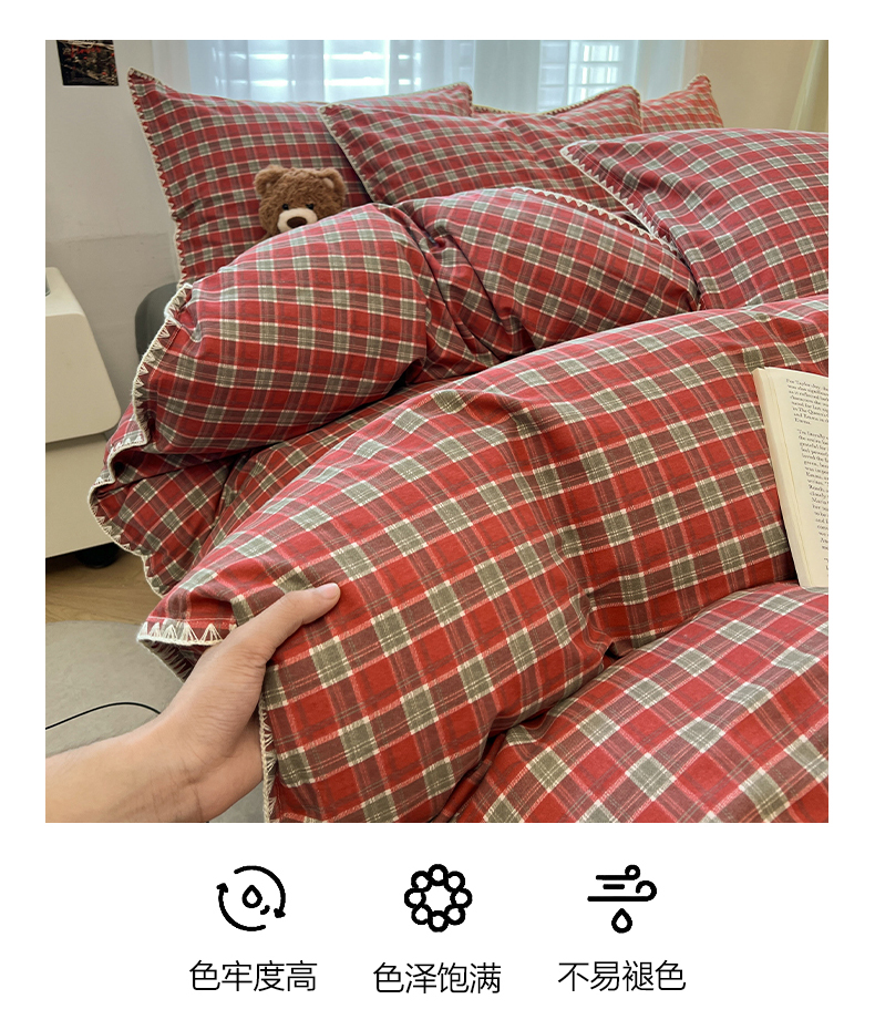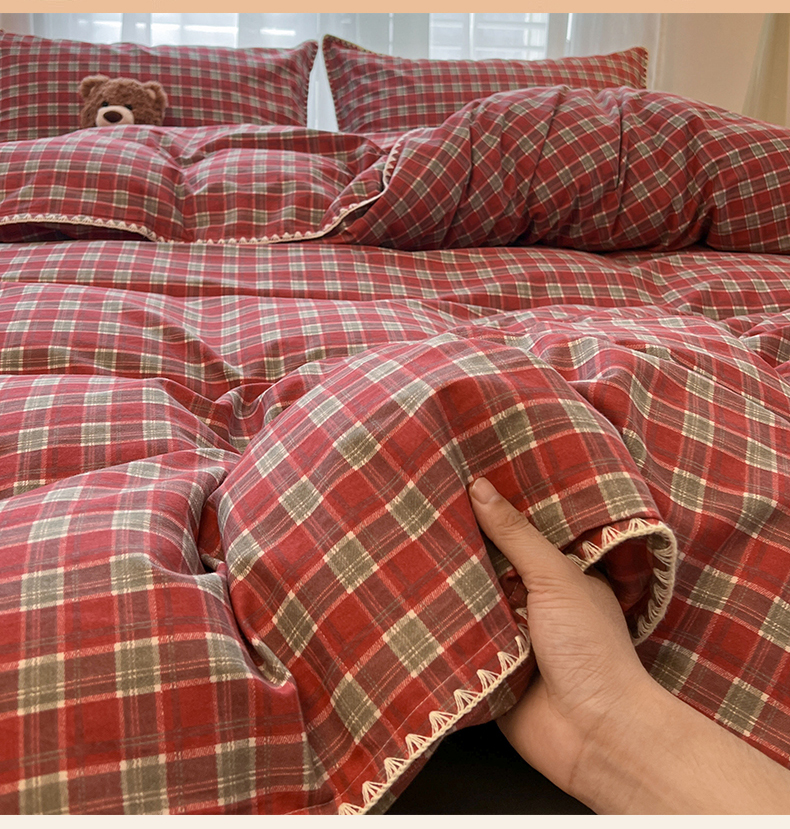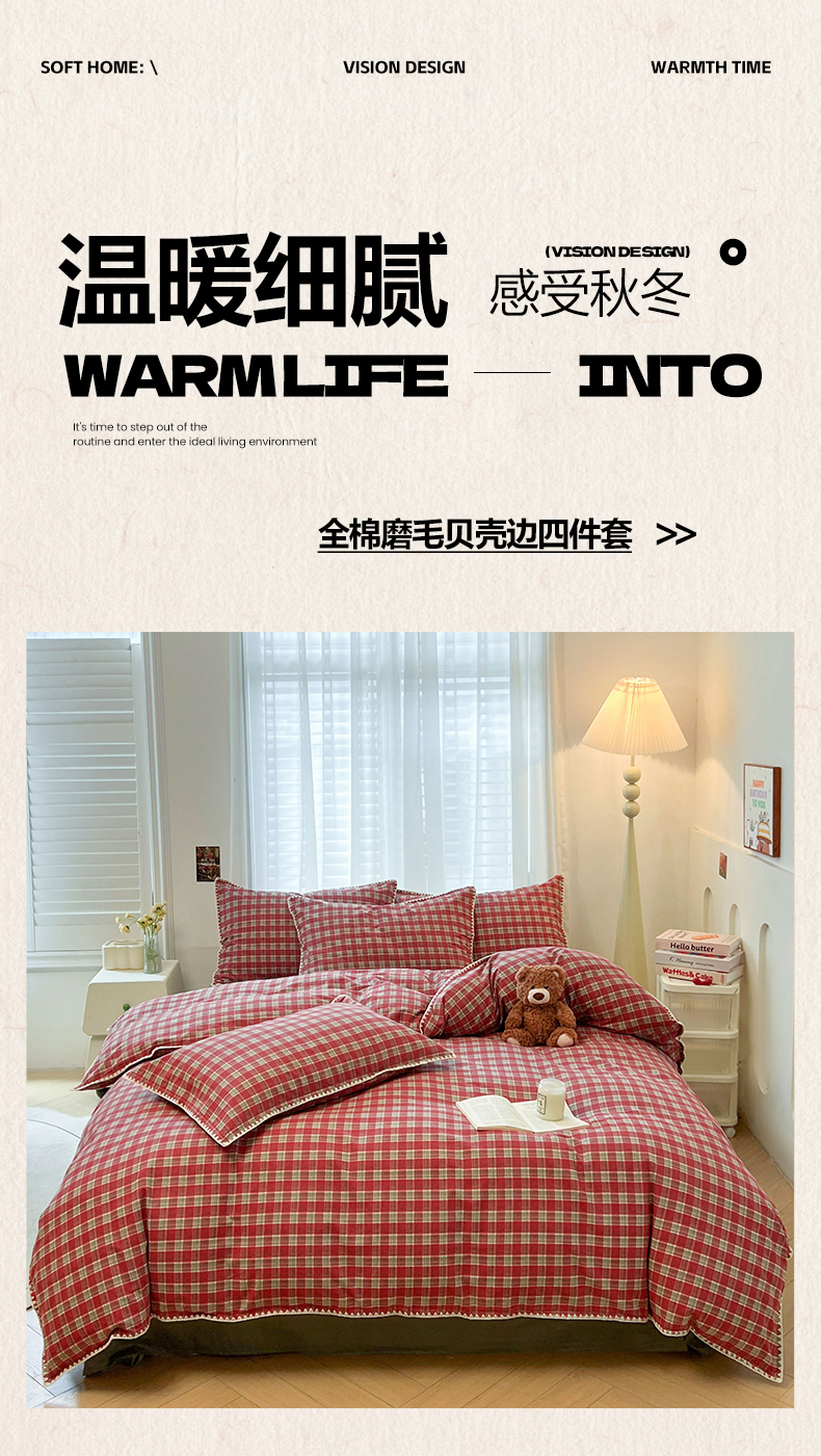 莱茵家居 2025新款全棉磨毛贝壳边四件套 暖红松影