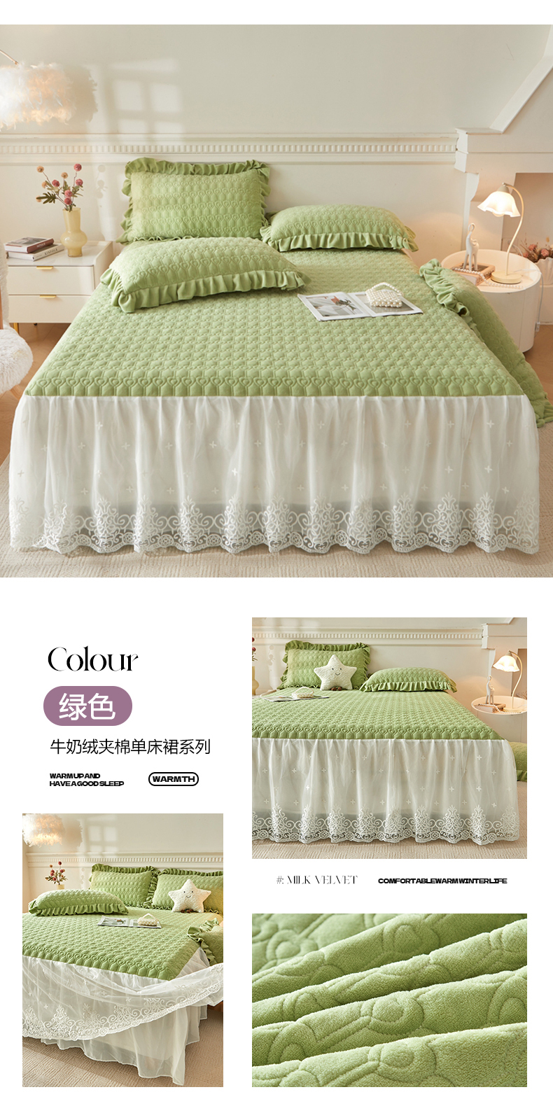 • 91家纺网 家纺一手货源 找家纺 (总)怡源梦 2025新款A类牛奶绒夹棉床裙单件-甜心公主系列,米白色,大红色,粉玉色,灰色,咖色,绿色,紫色