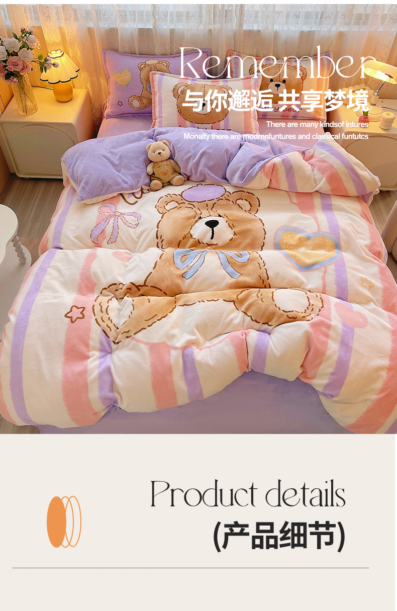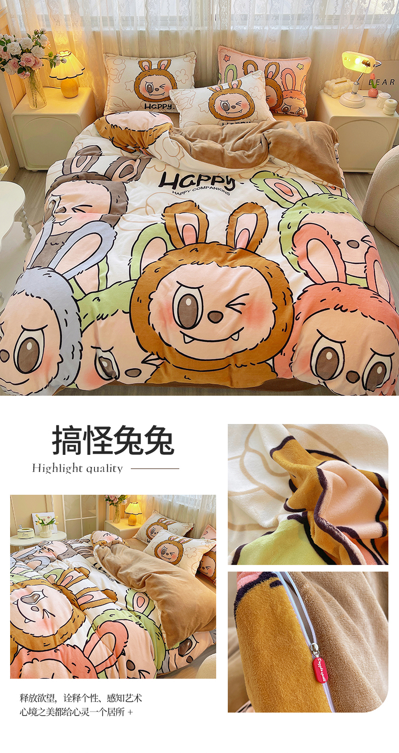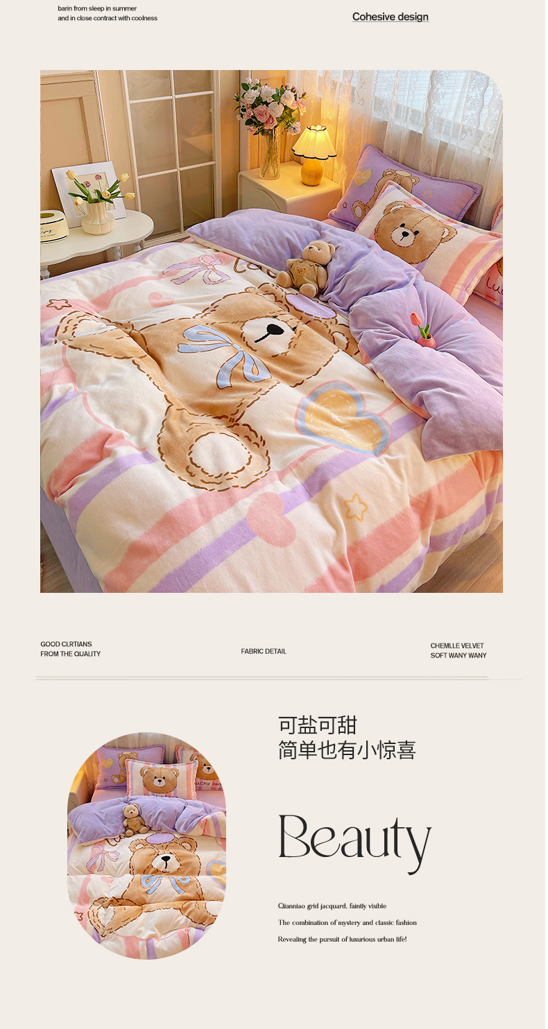 商品名称:炫拼家纺 2025新款大版数码印花卡通高克重牛奶绒四件套 啵啵熊