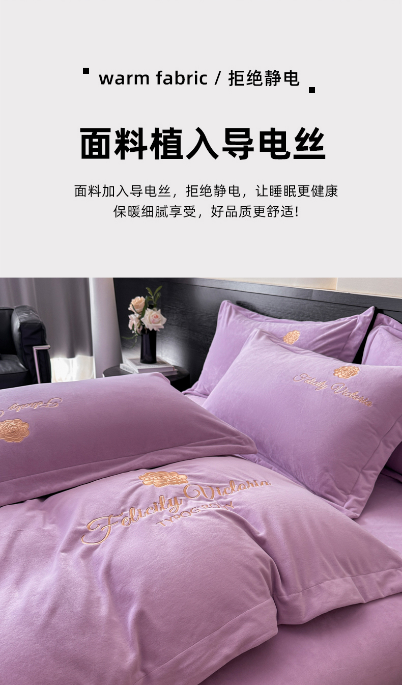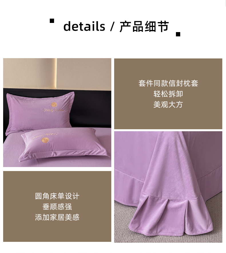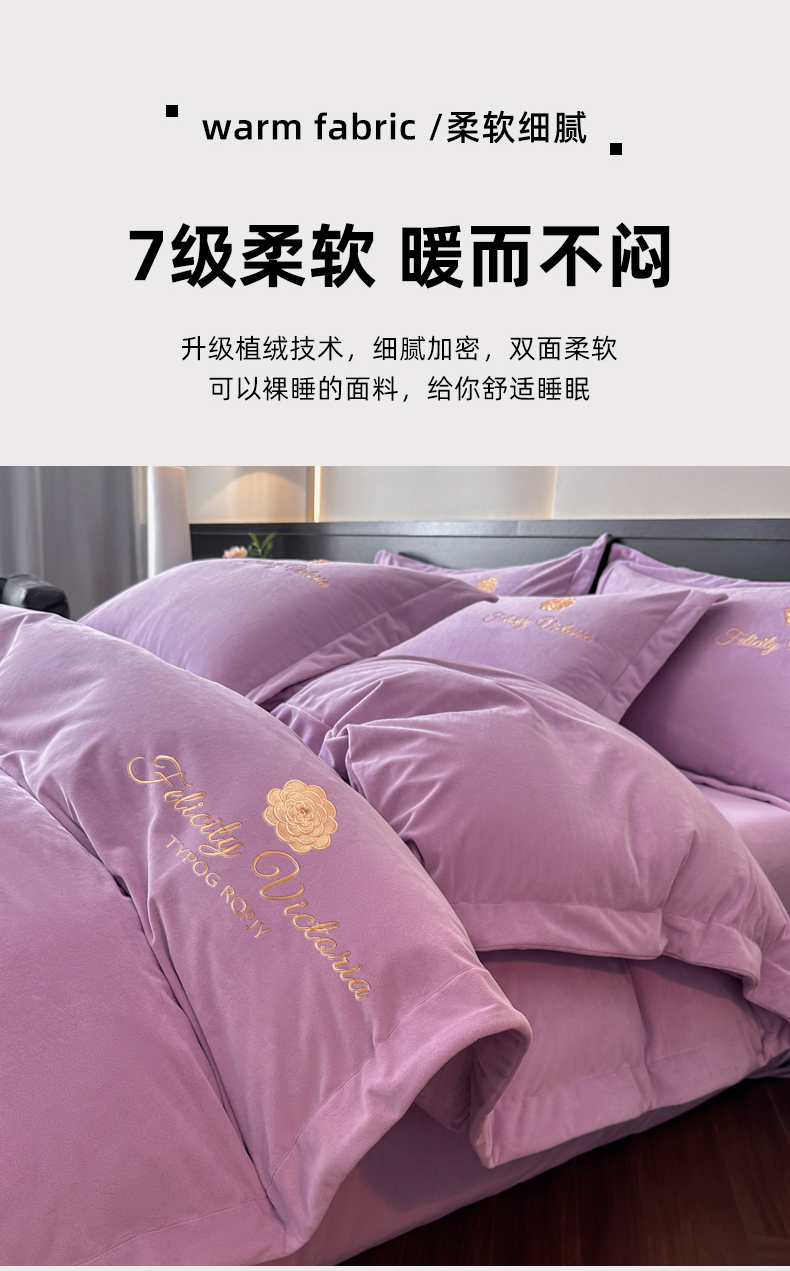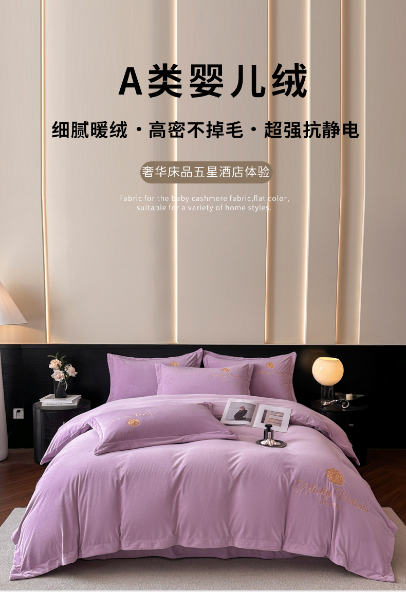 商品名称:鸿织源2025新款-茶颜系列 宝宝绒宽边四件套 茶颜-丁香紫
