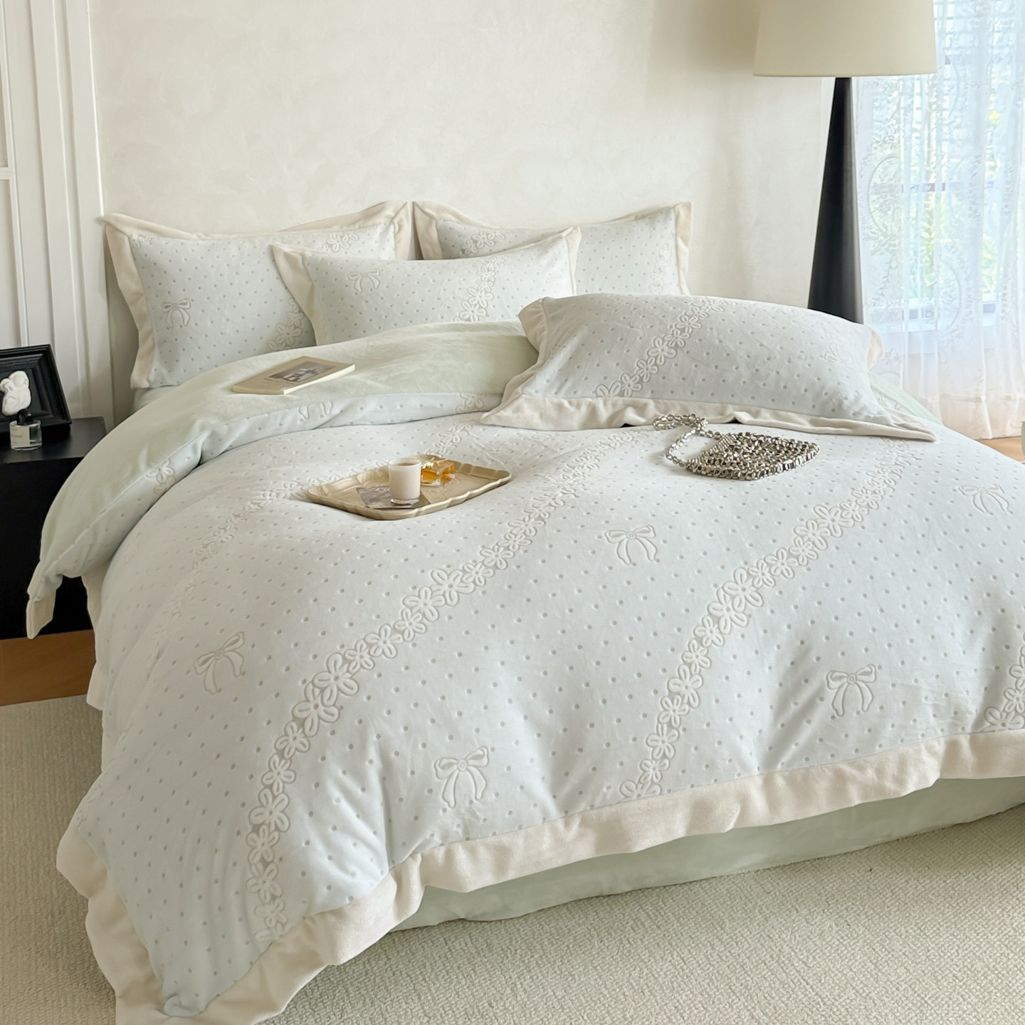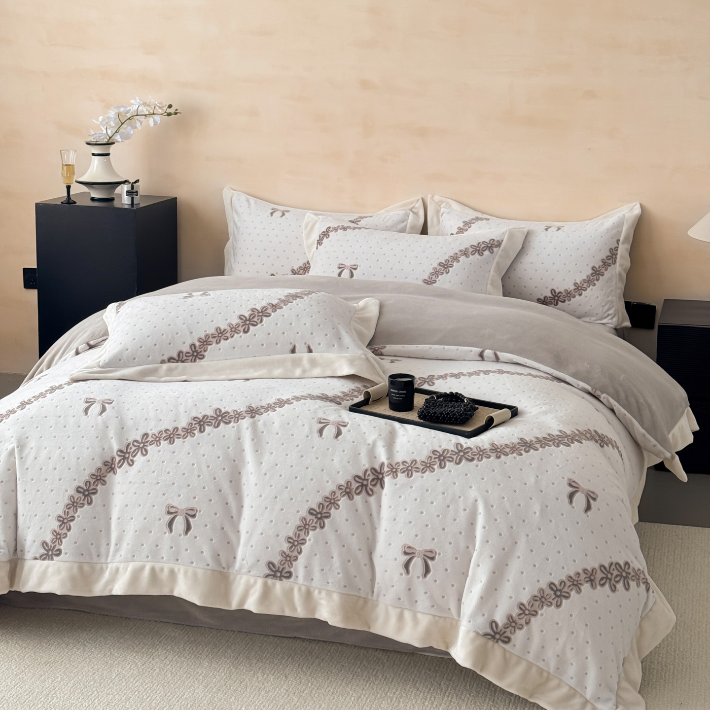 (总)若未家居 LOVEWE HOUSE 2025新款250克全消光数码印花和雕花大宽边全消光牛奶绒四件套-波点蝴蝶结