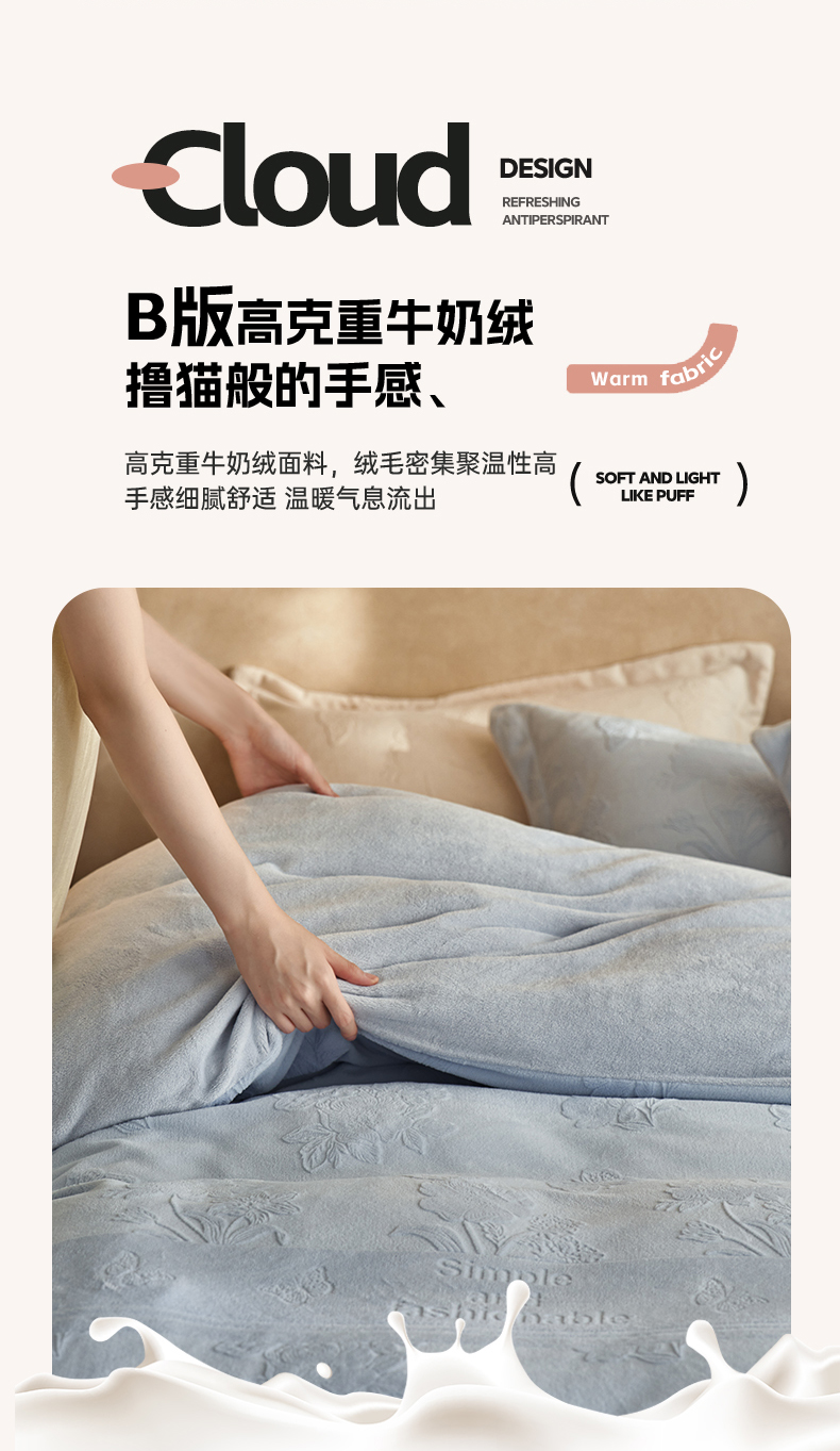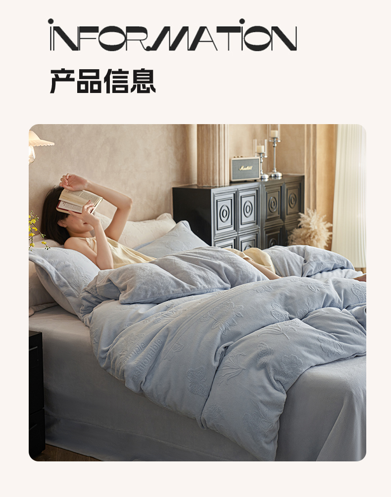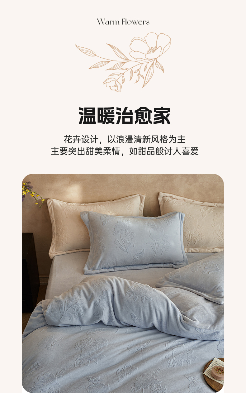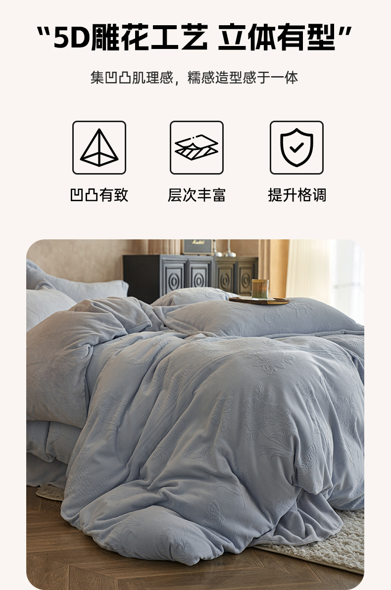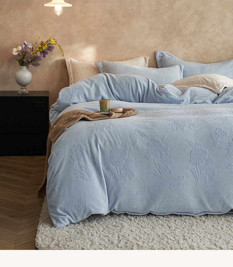 当前位置: 91家纺网 > 商品网购 > 床品套件 > 四件套 > 牛奶绒四件套 > 亿梵家居 2025秋冬新款A类全消光牛奶绒立体5D雕花绒四件套-风格一 (提供买家秀) 爱丽丝-天空蓝