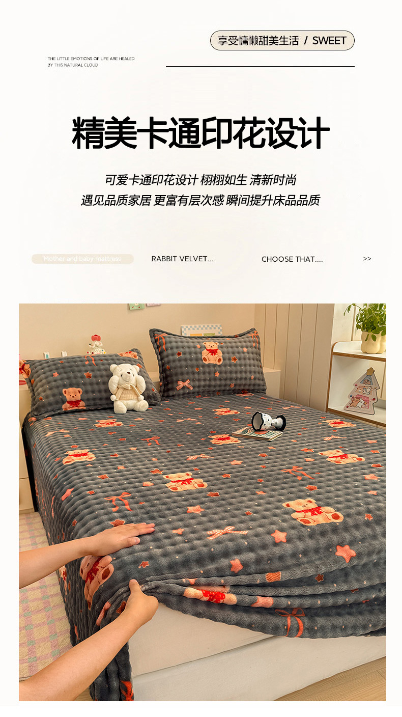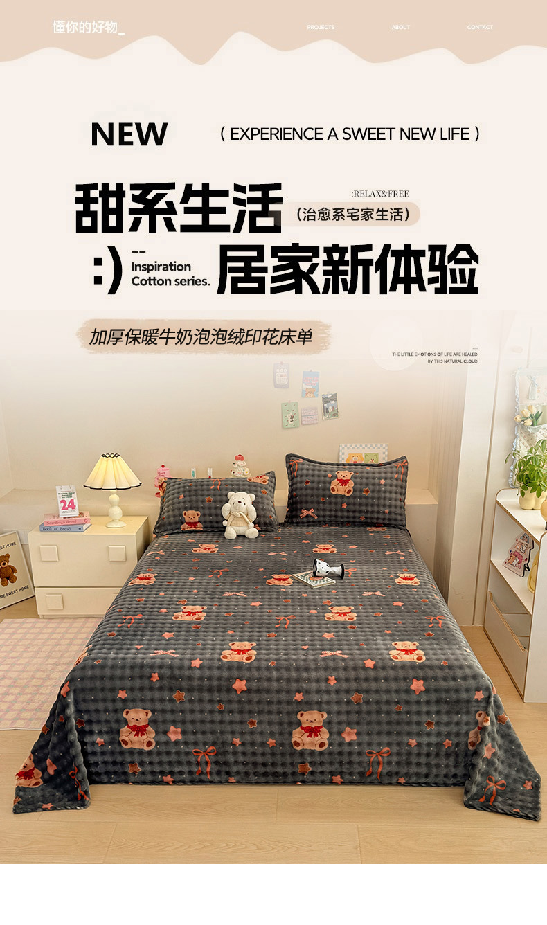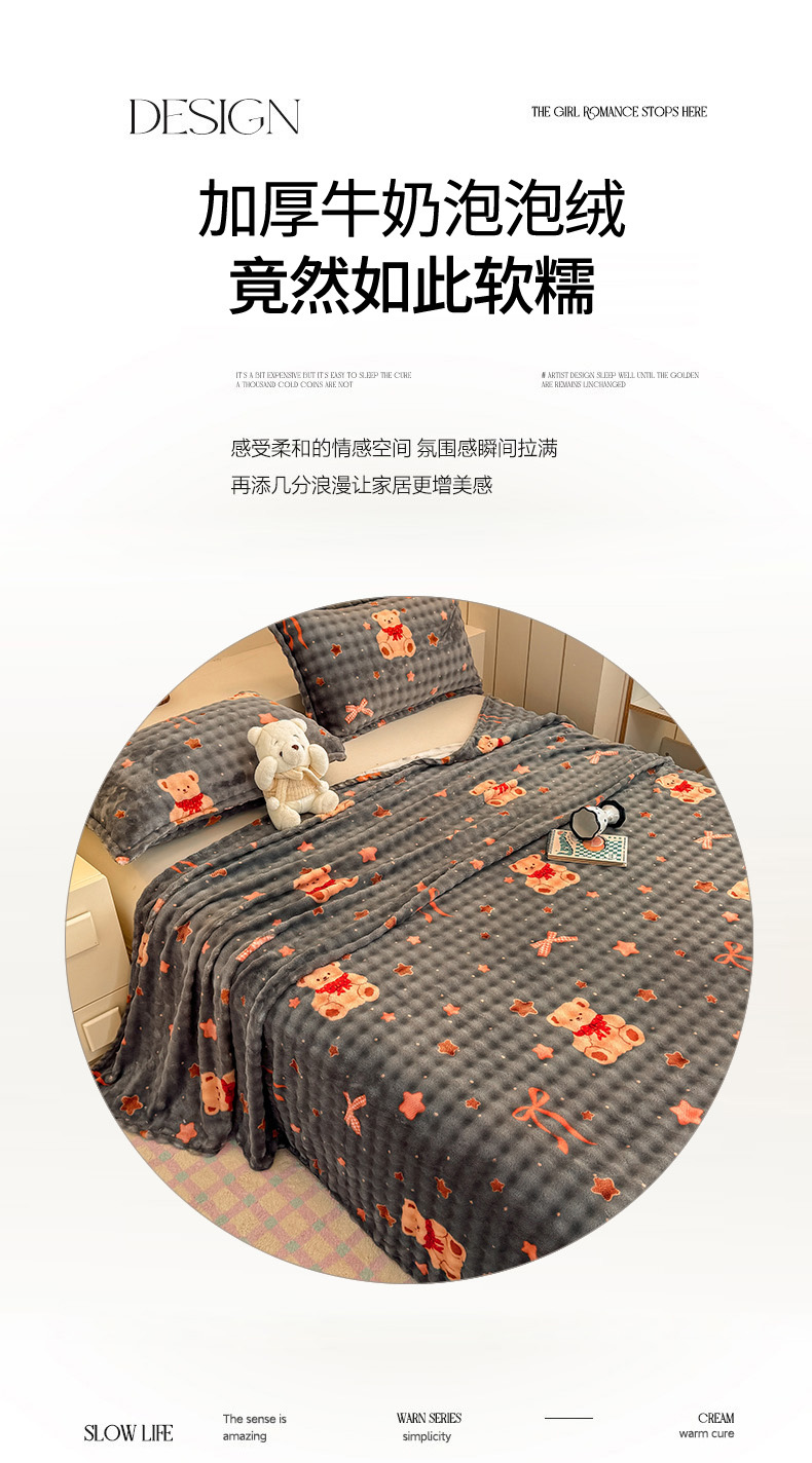 • 91家纺网 家纺一手货源 找家纺 绣女坊 2025新款A类高克重牛奶绒泡泡绒印花床单单件冬季保暖毛绒毯子绒床单三件套 星星小熊