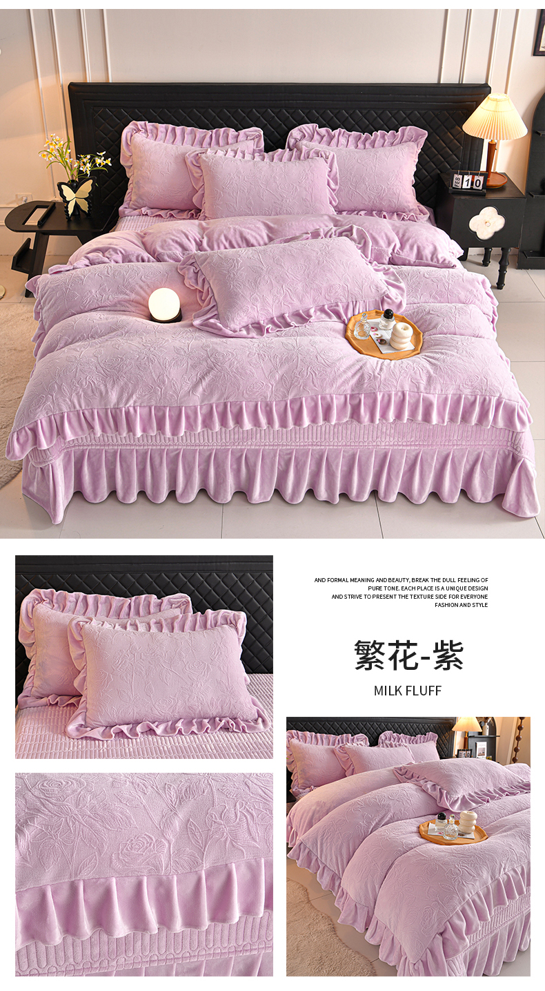 商品名称:赫本家纺 2025新款高克重纯色花边款雕花绒床盖款四件套 繁花-紫
