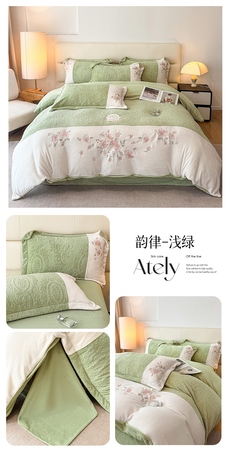 (总)金牛座家纺 2025新款立体雕花牛奶绒双拼角轻奢四件套-印象和叶影(最低售价不得低于178),印象-浅绿,印象-嫩粉,叶影-卡其