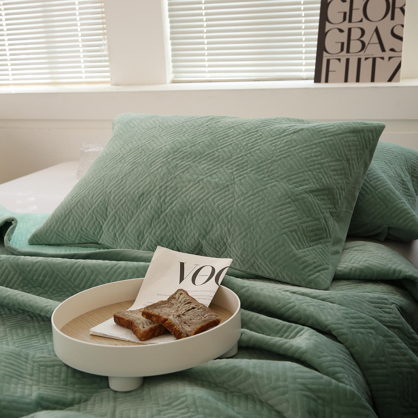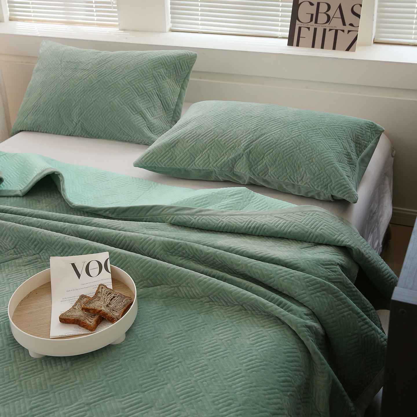 (总)期遇家居 2024新款出口韩国砂洗工艺床盖直条花边床盖纯棉三件套,流光白,琉璃黄,麦芽绿,燕麦咖