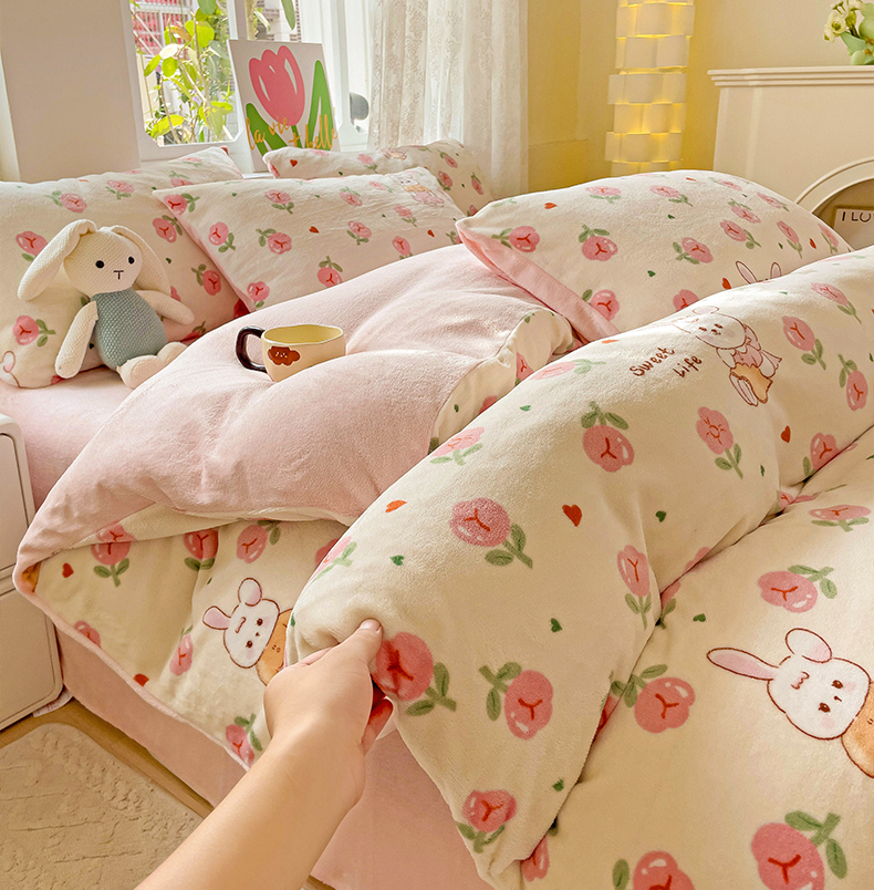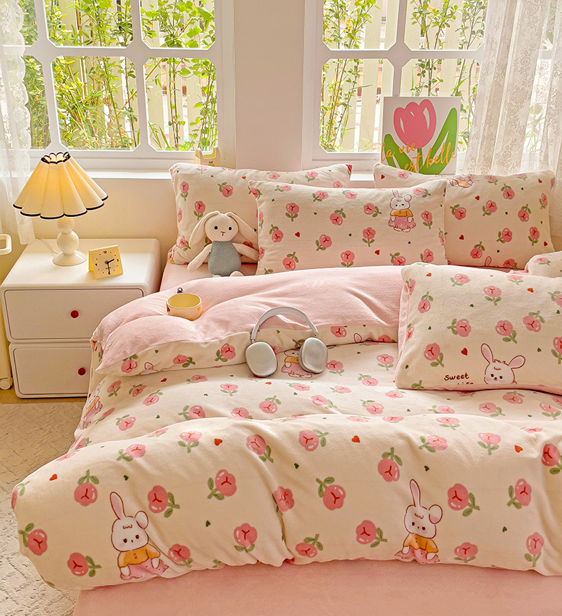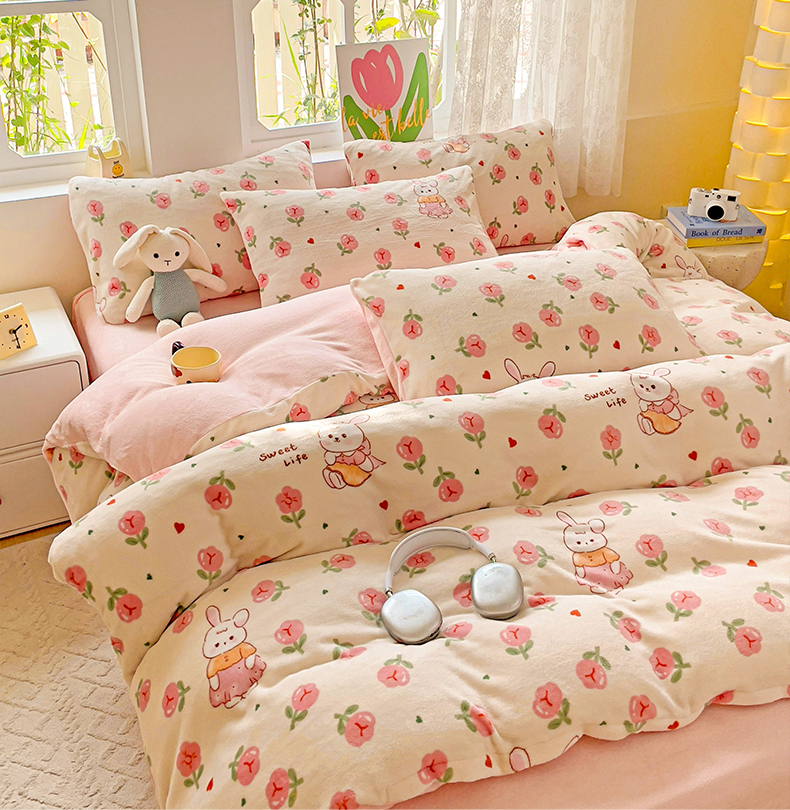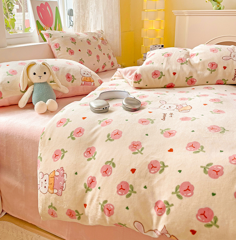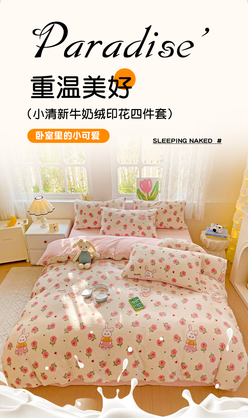 当前位置: 91家纺网 > 商品网购 > 床品套件 > 四件套 > 牛奶绒四件套 > 暖芯优选 2025新款小清新加厚高克重牛奶绒四件套直播热款电商热款 花园兔兔