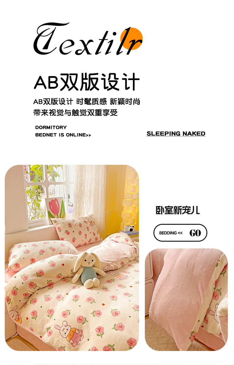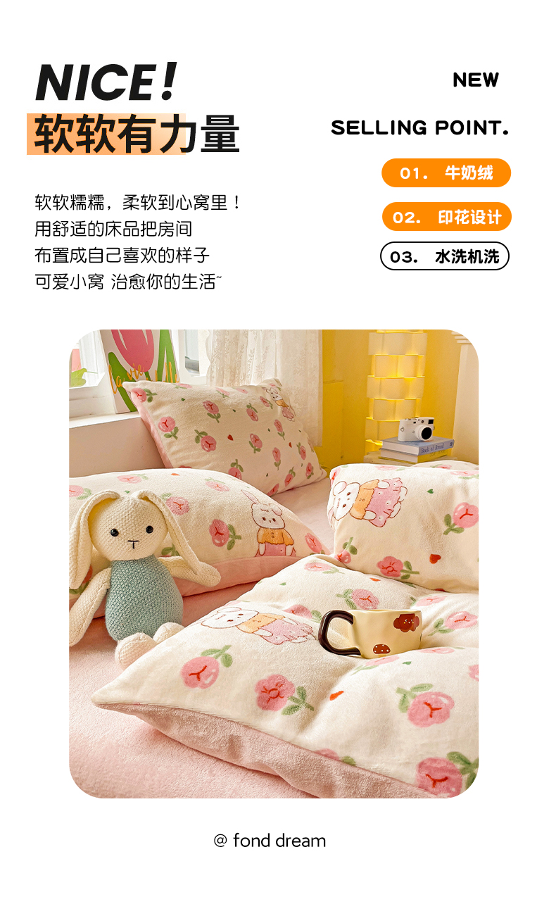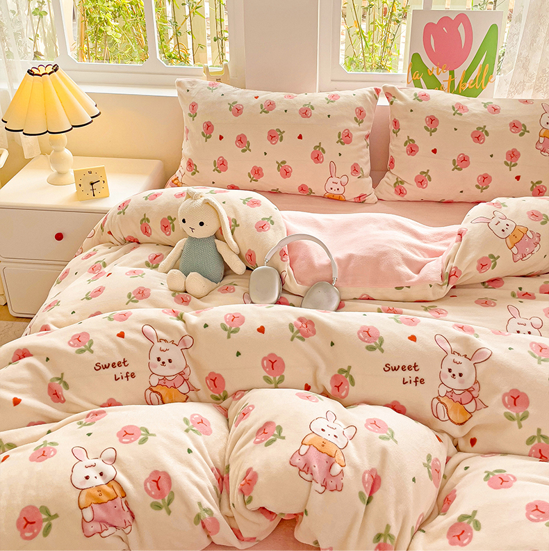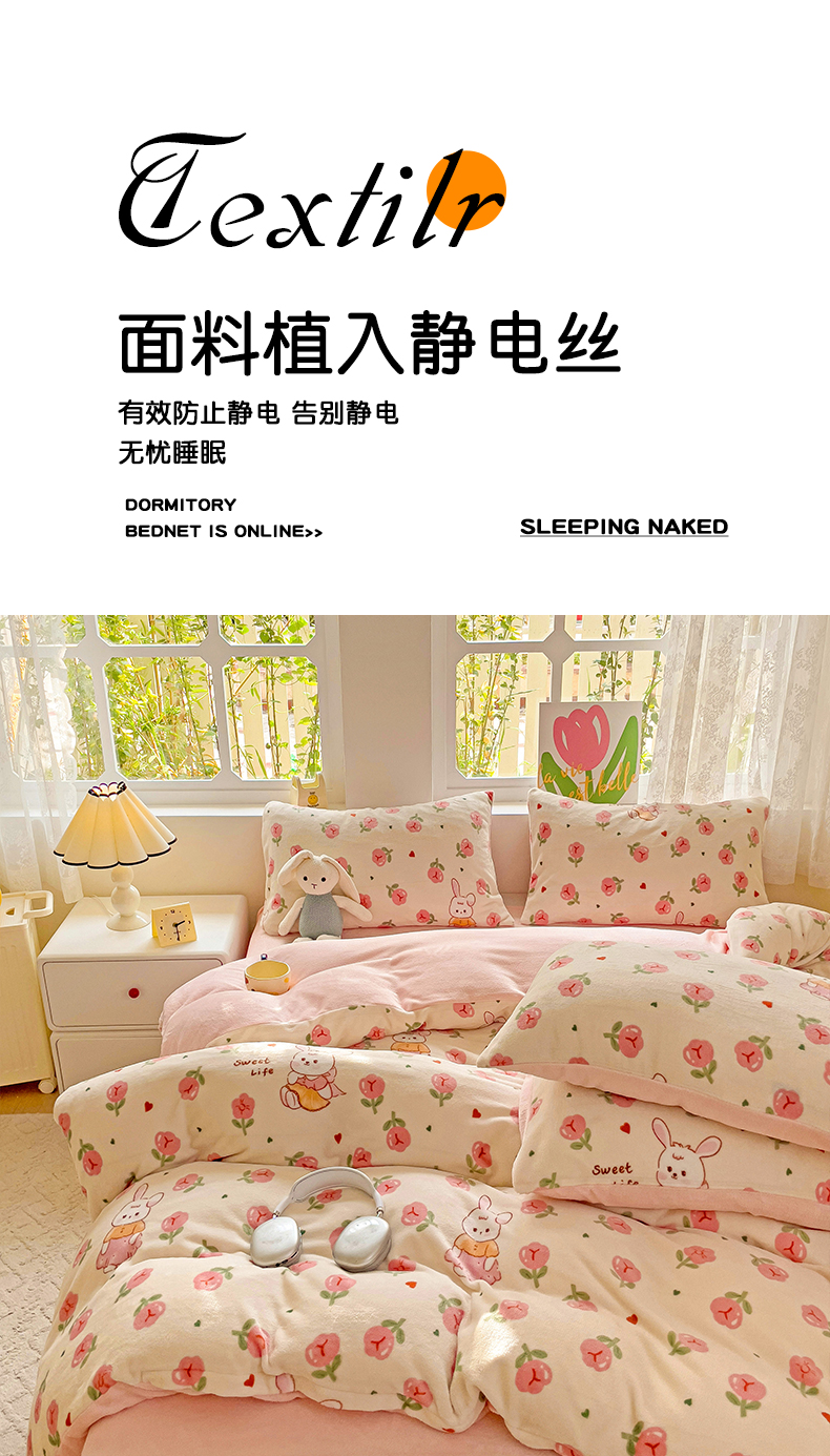 当前位置: 91家纺网 > 商品网购 > 床品套件 > 四件套 > 牛奶绒四件套 > 暖芯优选 2025新款小清新加厚高克重牛奶绒四件套直播热款电商热款 花园兔兔