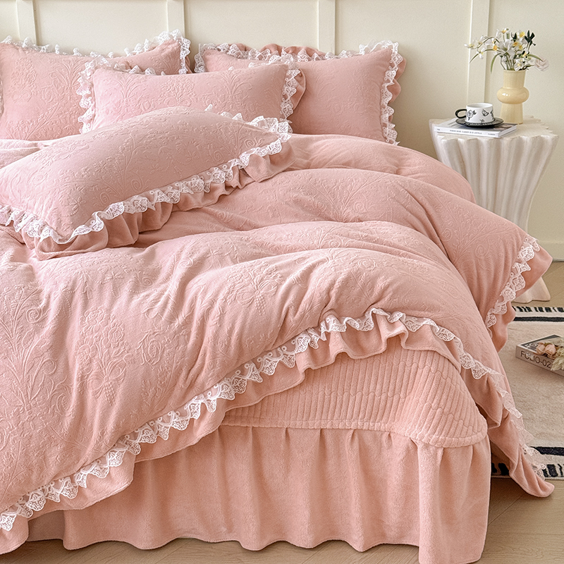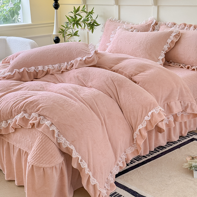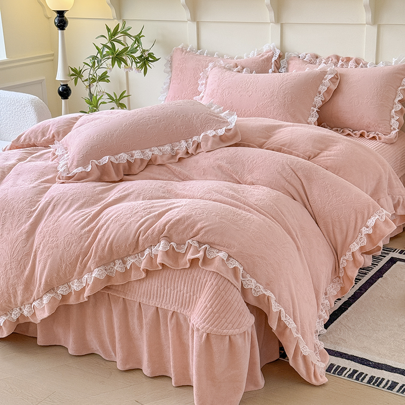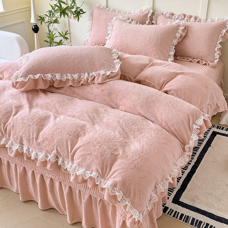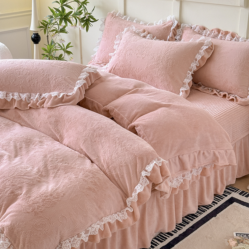 雅眠居 2025新款韩版花边高克重雕花绒牛奶绒床盖四件套 安娜花园-樱花粉