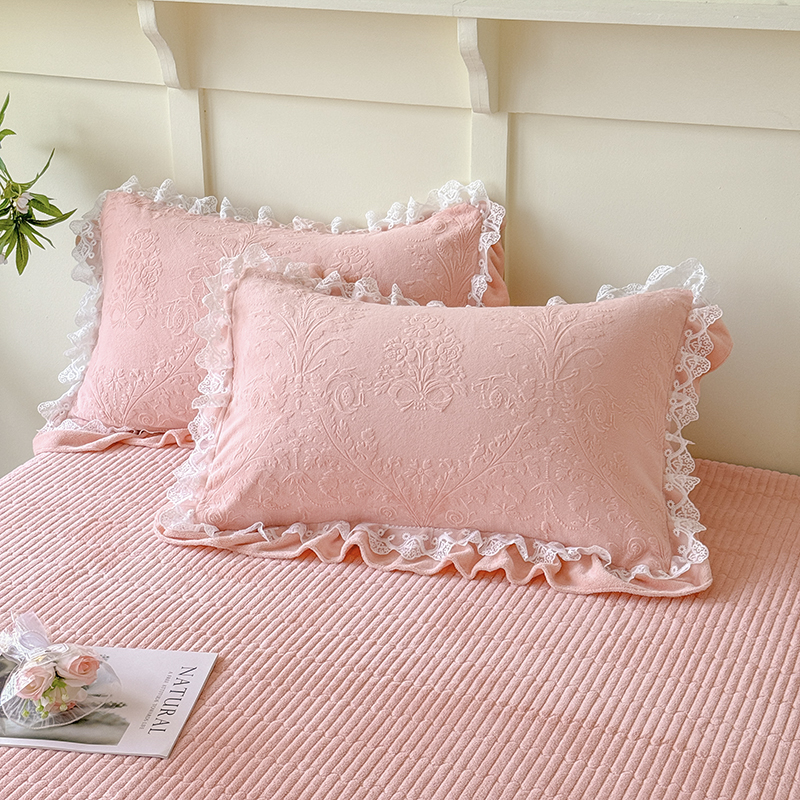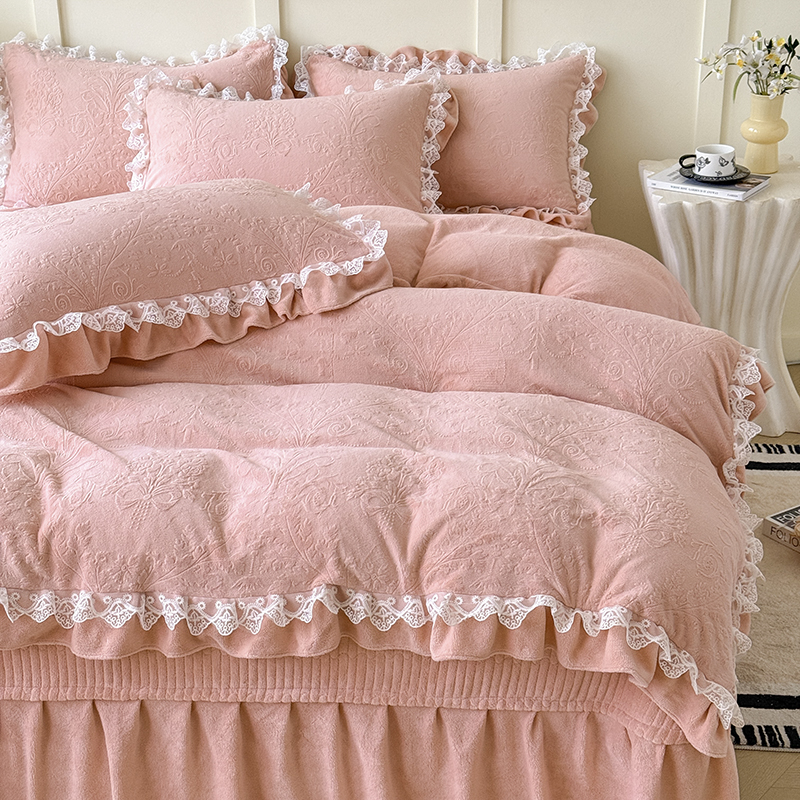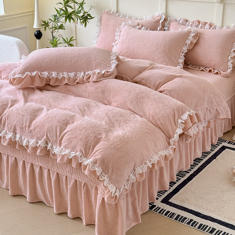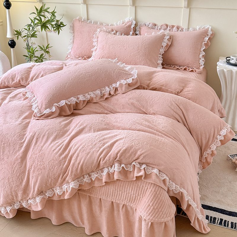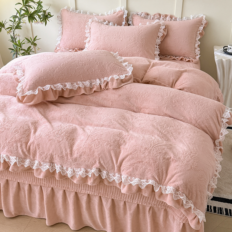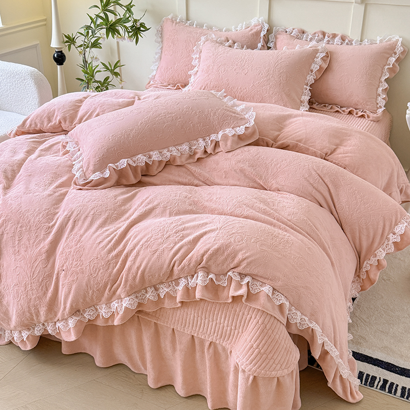 雅眠居 2025新款韩版花边高克重雕花绒牛奶绒床盖四件套 安娜花园-樱花粉