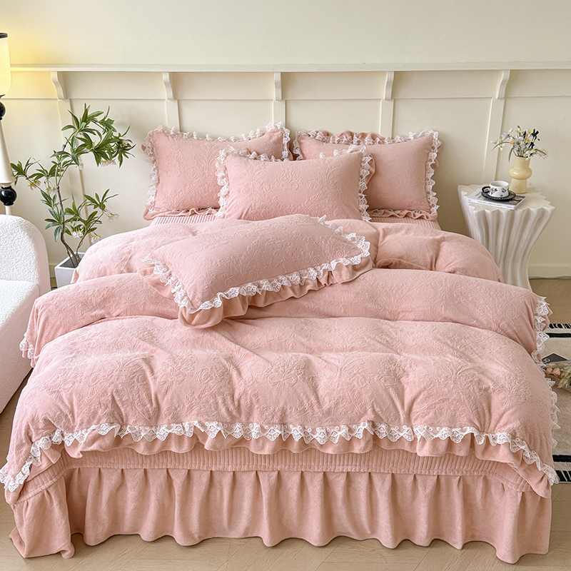 商品名称:雅眠居 2025新款韩版花边高克重雕花绒牛奶绒床盖四件套 安娜花园-樱花粉