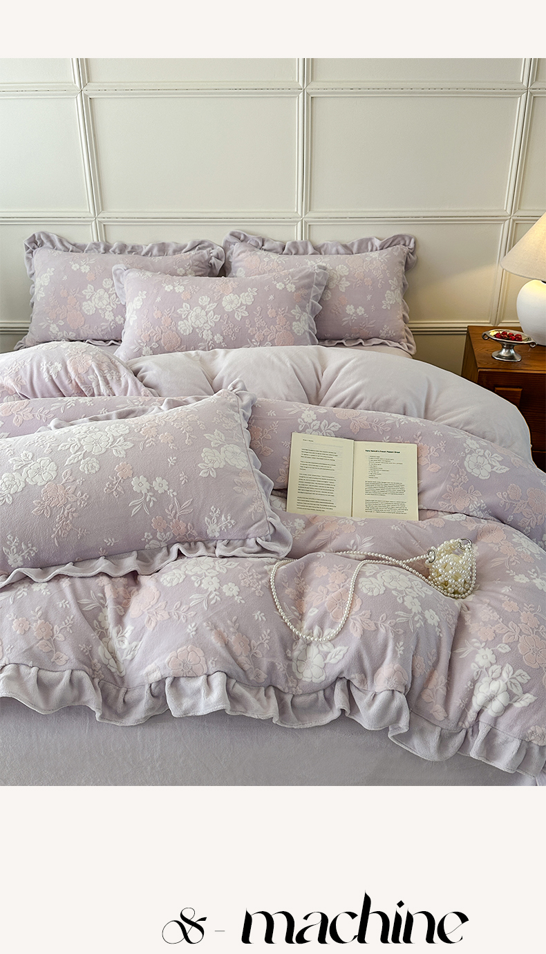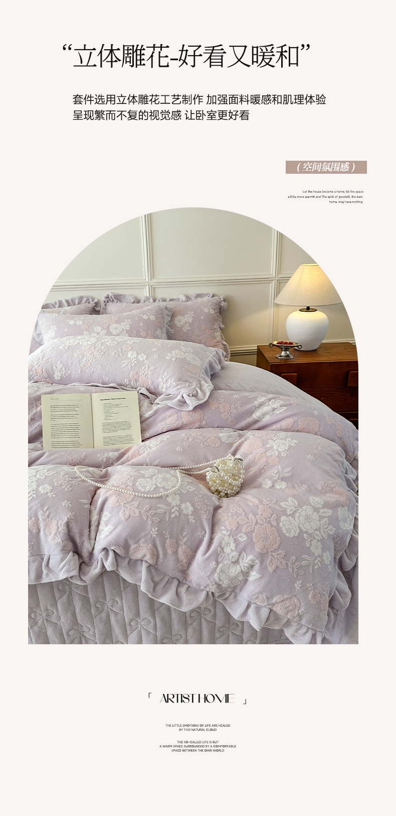 当前位置: 91家纺网 > 商品网购 > 床品套件 > 四件套 > 牛奶绒四件套 > 野合家纺 2025新款法式A类雕花牛奶绒韩版公主风四件套床盖款床单款床笠款 花海-玫红