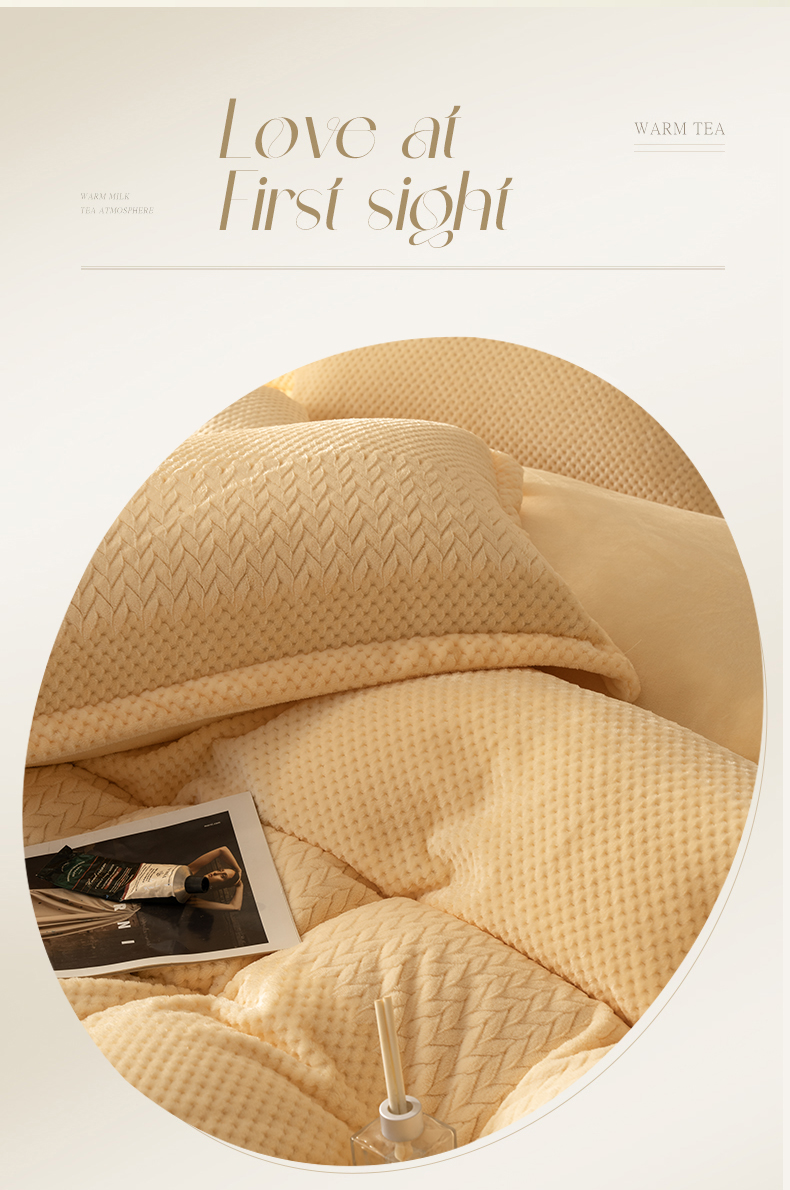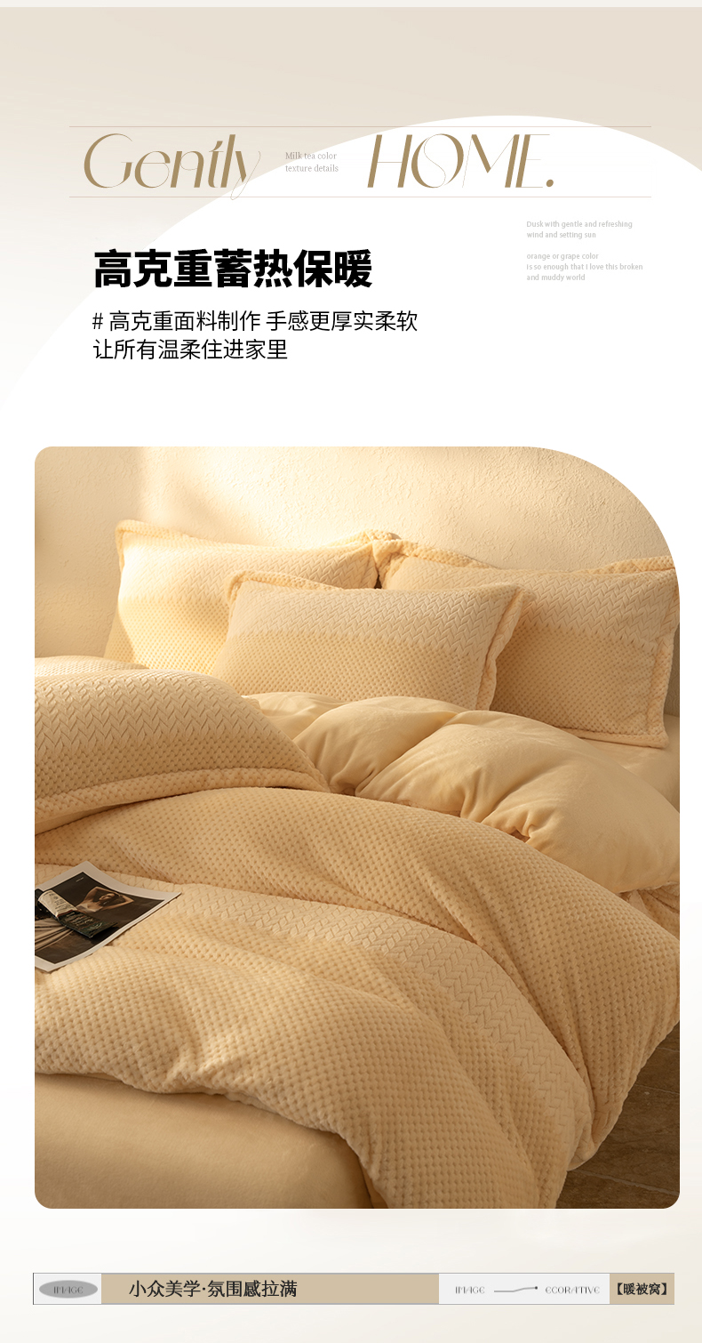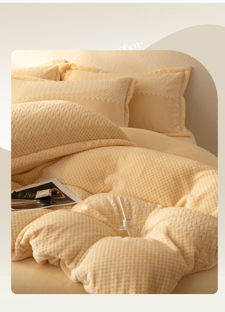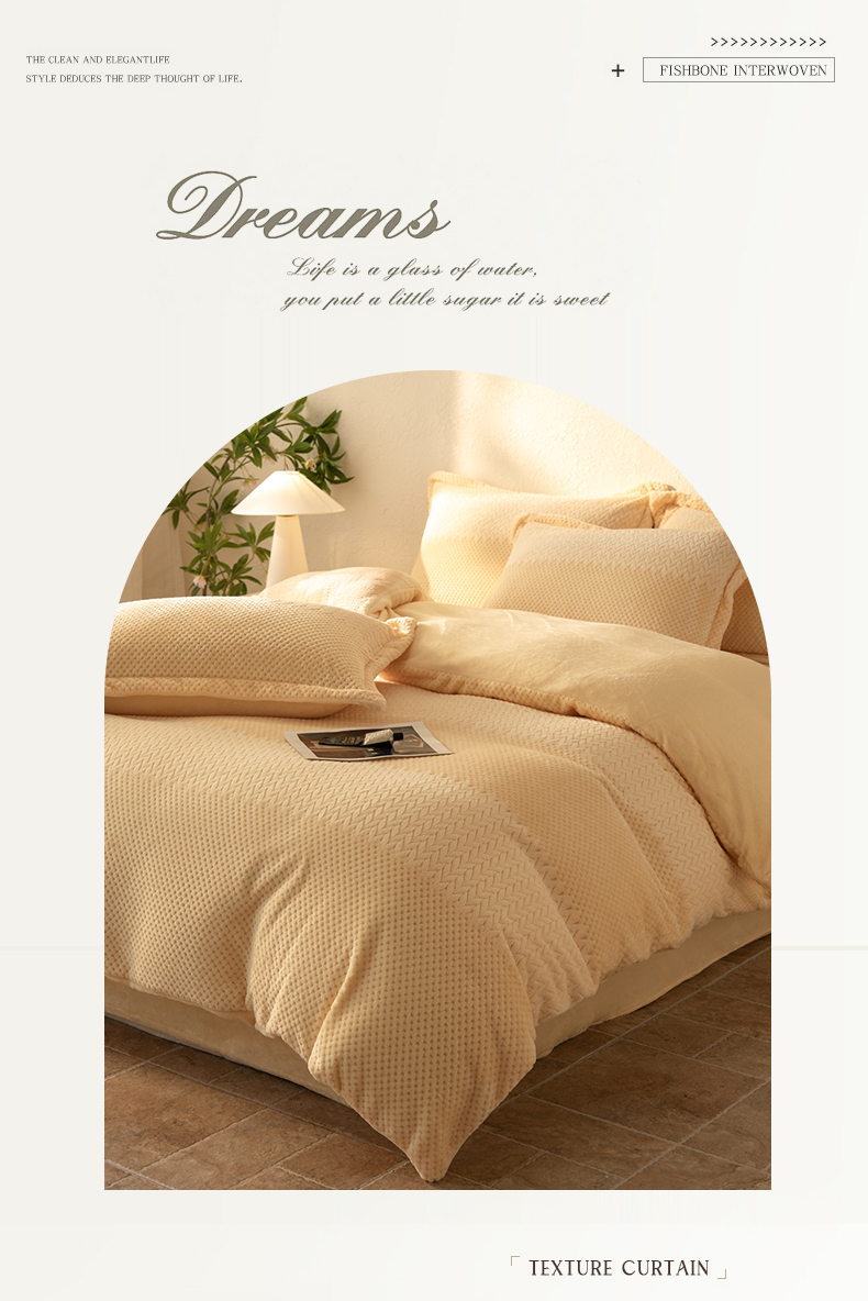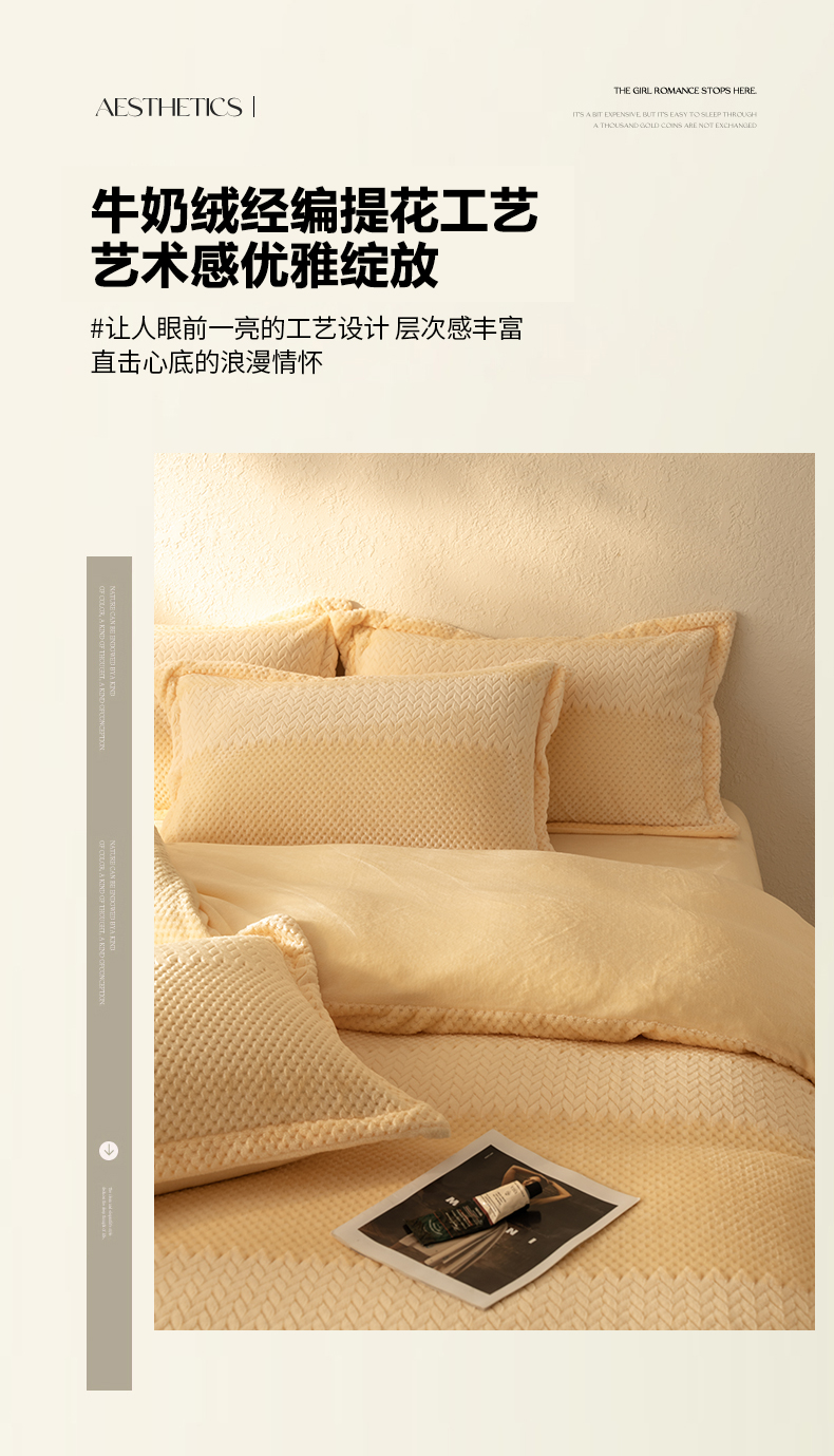 当前位置: 91家纺网 > 商品网购 > 床品套件 > 四件套 > 牛奶绒四件套 > 源舍家纺 2025新款色织拼色编织提花轻奢牛奶绒四件套(场景二) 织锦-暖阳