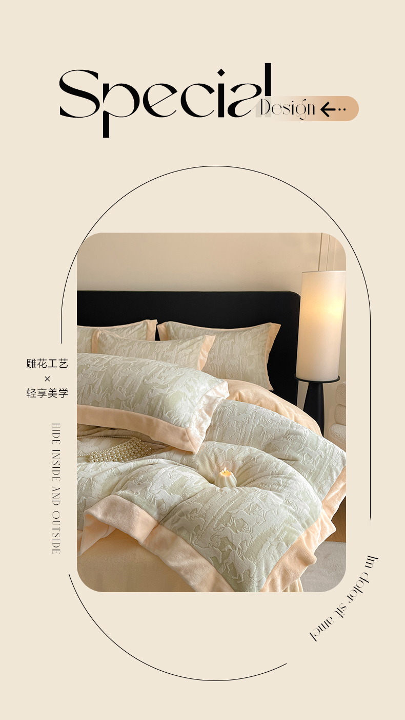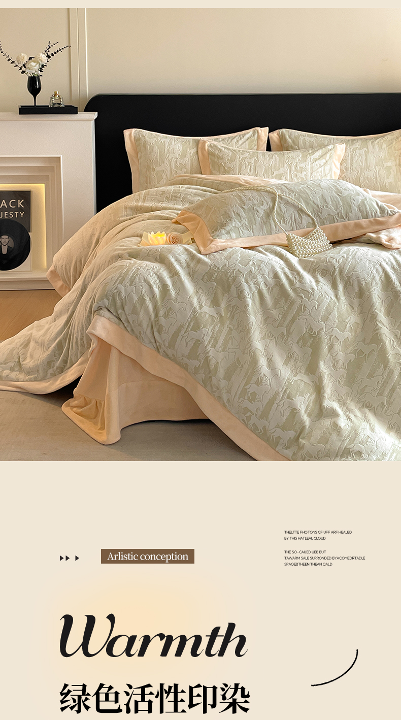 商品名称:畅畅家纺 2025新款冬季拼角雕花牛奶绒宽包边床单床笠四件套 英伦骑士-浅绿