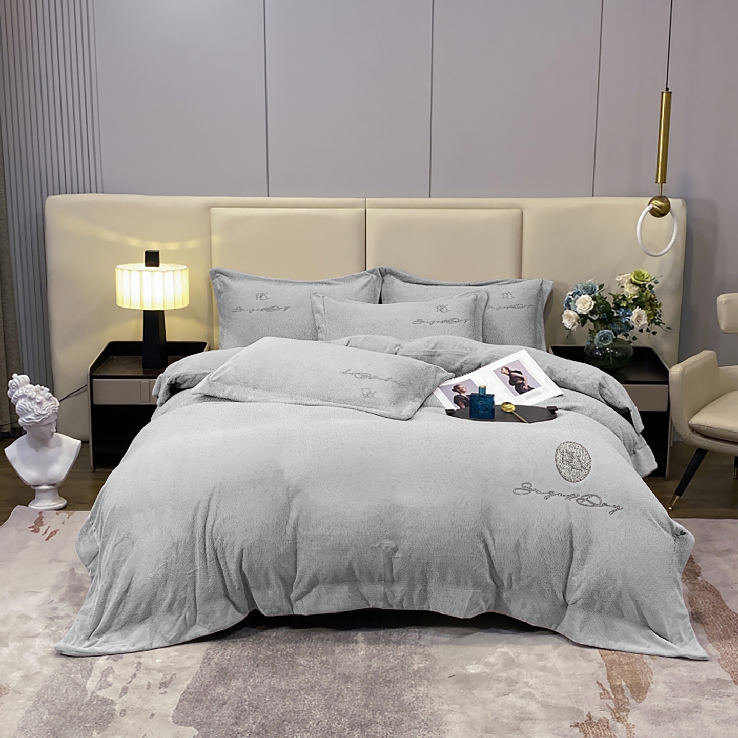 总玖玖爱家纺 纯棉100支贡缎长绒棉刺绣被套三件套四件套加大四件套,白色,高级灰,卡其,蓝灰,绿色,浅桔,深蓝,紫豆沙