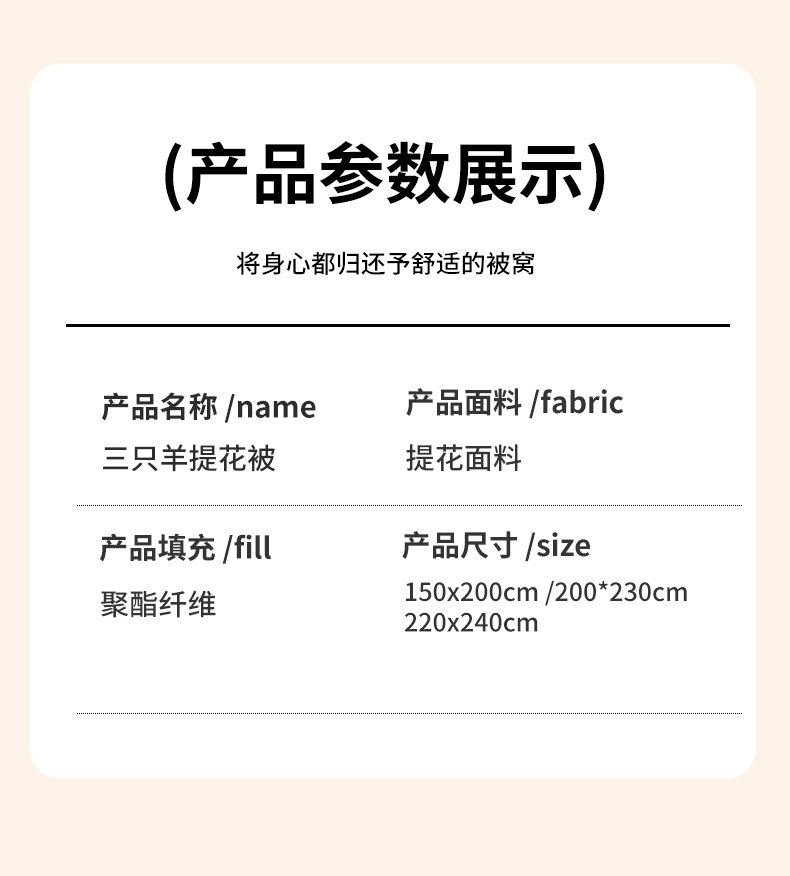 [{"sp_id":11,"sp_name":"\u989c\u8272","sp_format":2,"sp_list":[{"sp_value_id":1666,"sp_value_name":"\u4e09\u53ea\u7f8a-\u6c34\u7eff\u8272","sp_value_image":{"id":999,"path":"https:\/\/img3.91jf.com\/ghelp\/2025\/20251003\/20251003095534_126248.jpeg"},"sp_value_video":{"id":0,"img":"","path":"","time":0,"download_num":0,"play_num":0},"price":"46.00","storage":4000,"weight":"2.000","is_check_weight":0,"plus_price":"","sp_sort":0}]},{"sp_id":27,"sp_name":"\u5c3a\u5bf8","sp_format":1,"sp_list":[{"sp_value_id":302,"sp_value_name":"150x200cm4\u65a4","sp_value_image":{"id":0,"path":""},"sp_value_video":{"id":0,"img":"","path":"","time":0,"download_num":0,"play_num":0},"price":"46.00","storage":500,"weight":"2.000","is_check_weight":0,"plus_price":"","sp_sort":5},{"sp_value_id":303,"sp_value_name":"150x200cm5\u65a4","sp_value_image":{"id":0,"path":""},"sp_value_video":{"id":0,"img":"","path":"","time":0,"download_num":0,"play_num":0},"price":"51.00","storage":500,"weight":"2.500","is_check_weight":0,"plus_price":"","sp_sort":6},{"sp_value_id":304,"sp_value_name":"150x200cm6\u65a4","sp_value_image":{"id":0,"path":""},"sp_value_video":{"id":0,"img":"","path":"","time":0,"download_num":0,"play_num":0},"price":"57.00","storage":500,"weight":"3.000","is_check_weight":0,"plus_price":"","sp_sort":7},{"sp_value_id":305,"sp_value_name":"200x230cm4\u65a4","sp_value_image":{"id":0,"path":""},"sp_value_video":{"id":0,"img":"","path":"","time":0,"download_num":0,"play_num":0},"price":"49.00","storage":500,"weight":"2.000","is_check_weight":0,"plus_price":"","sp_sort":8},{"sp_value_id":306,"sp_value_name":"200x230cm6\u65a4","sp_value_image":{"id":0,"path":""},"sp_value_video":{"id":0,"img":"","path":"","time":0,"download_num":0,"play_num":0},"price":"59.00","storage":500,"weight":"3.000","is_check_weight":0,"plus_price":"","sp_sort":9},{"sp_value_id":307,"sp_value_name":"200x230cm8\u65a4","sp_value_image":{"id":0,"path":""},"sp_value_video":{"id":0,"img":"","path":"","time":0,"download_num":0,"play_num":0},"price":"69.00","storage":500,"weight":"4.000","is_check_weight":0,"plus_price":"","sp_sort":10},{"sp_value_id":308,"sp_value_name":"200x230cm10\u65a4","sp_value_image":{"id":0,"path":""},"sp_value_video":{"id":0,"img":"","path":"","time":0,"download_num":0,"play_num":0},"price":"79.00","storage":500,"weight":"5.000","is_check_weight":0,"plus_price":"","sp_sort":11},{"sp_value_id":309,"sp_value_name":"220x240cm10\u65a4","sp_value_image":{"id":0,"path":""},"sp_value_video":{"id":0,"img":"","path":"","time":0,"download_num":0,"play_num":0},"price":"83.00","storage":500,"weight":"5.000","is_check_weight":0,"plus_price":"","sp_sort":12}]}]