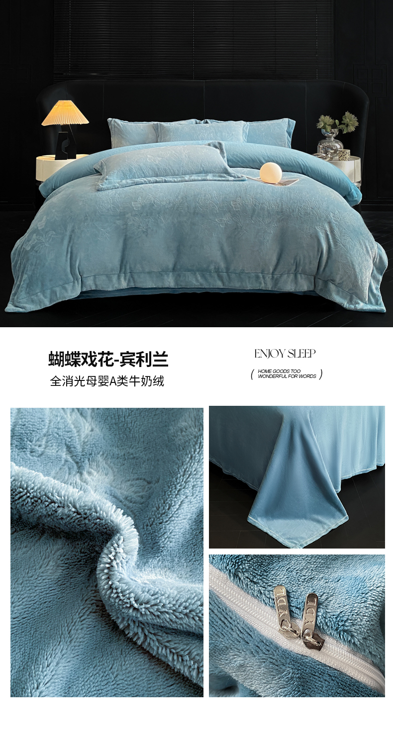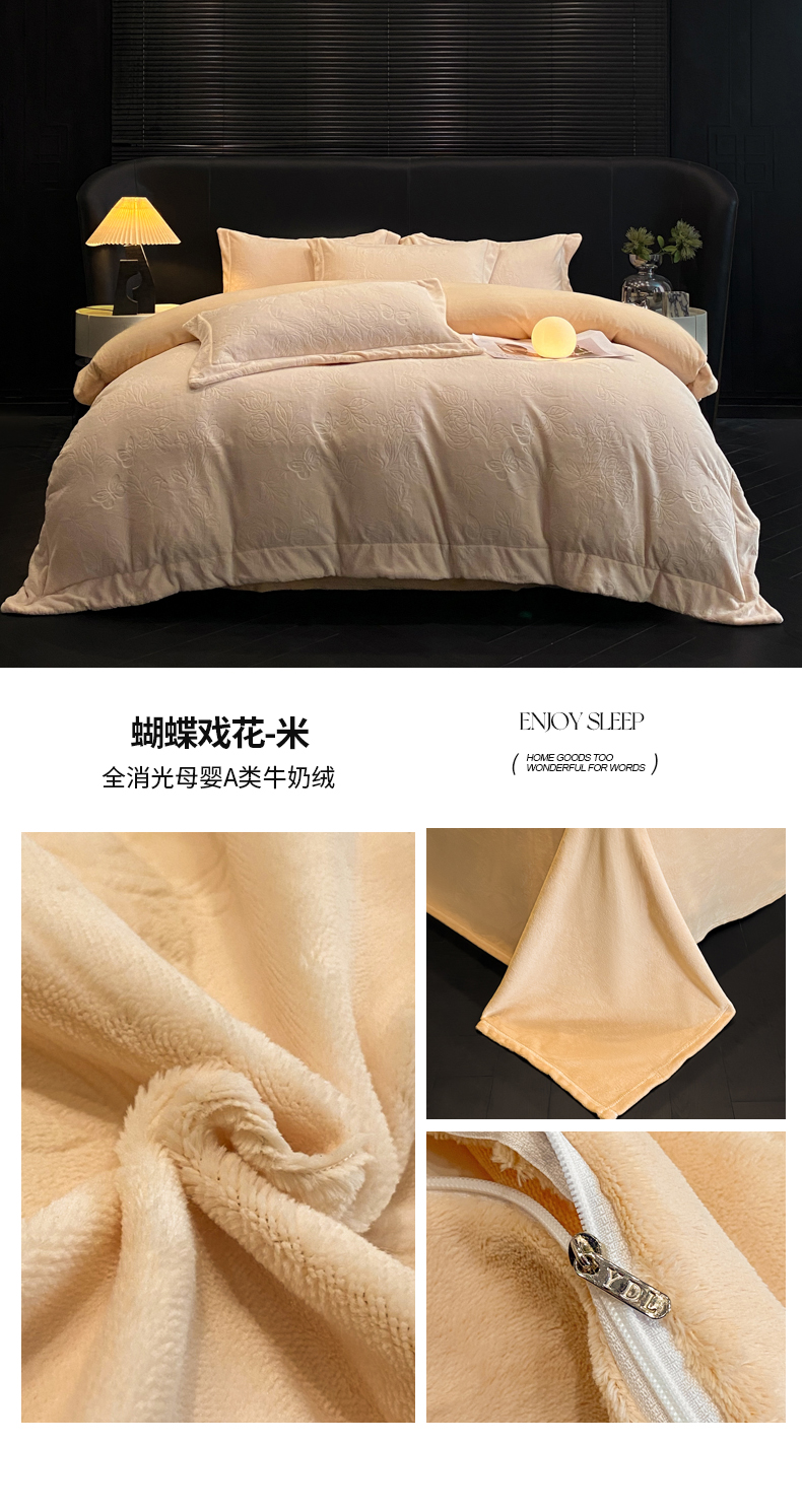 商品名称:(总)专版花型 2025年新款高克重 9.2斤全消光A类烂花牛奶绒四件套-蝴蝶戏花