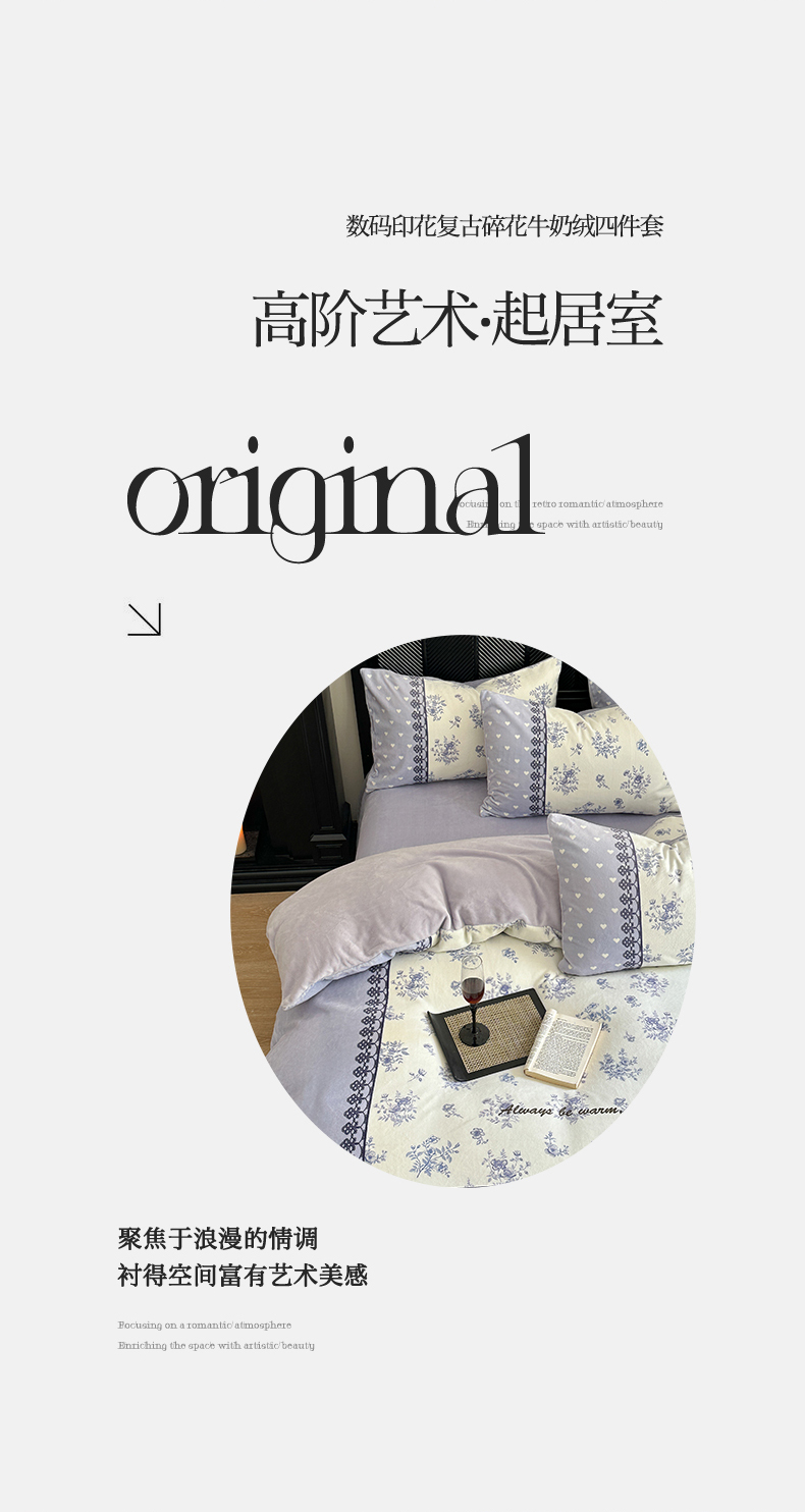 商品名称:Sweet dreams甜梦 2025新款全消光数码印花加厚复古碎花牛奶绒四件套-实拍图 蓝枚