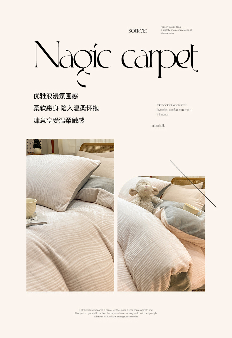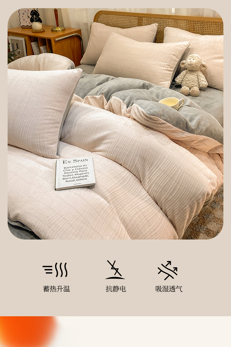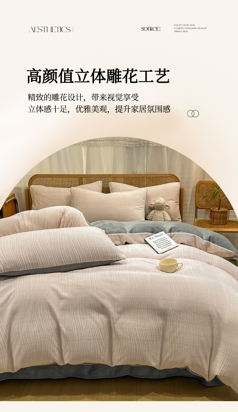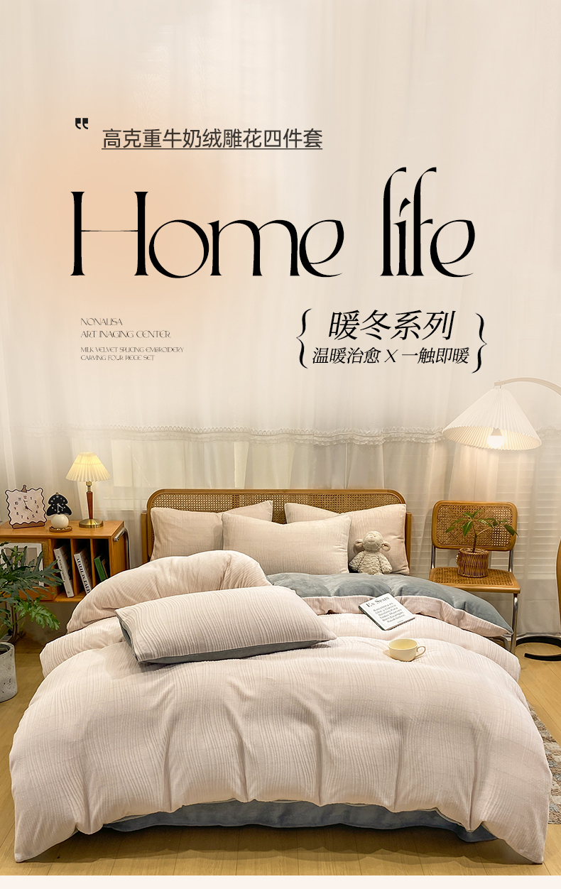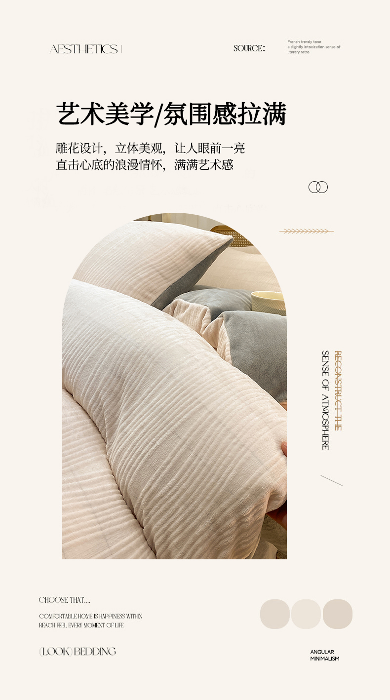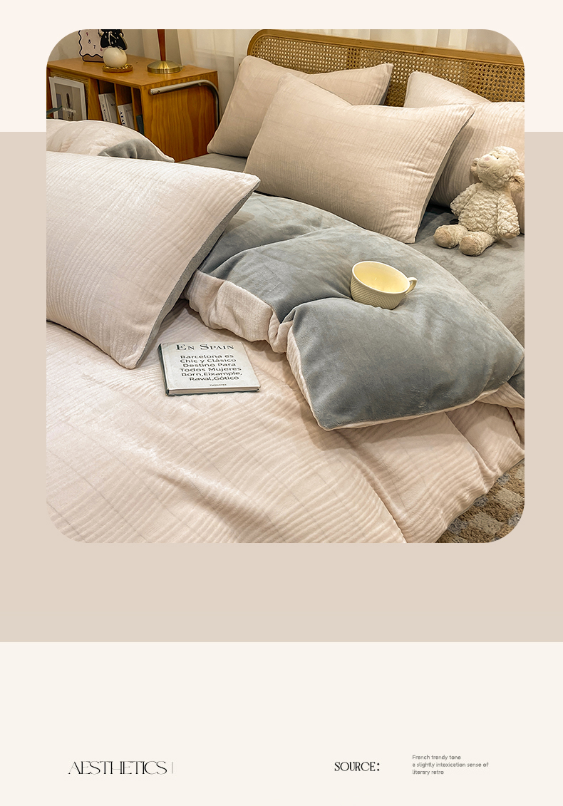 当前位置: 91家纺网 > 商品网购 > 床品套件 > 四件套 > 牛奶绒四件套 > 灰鲸 2025新款高克重牛奶绒雕花简约纯色四件套 温妮-奶茶+绅士灰