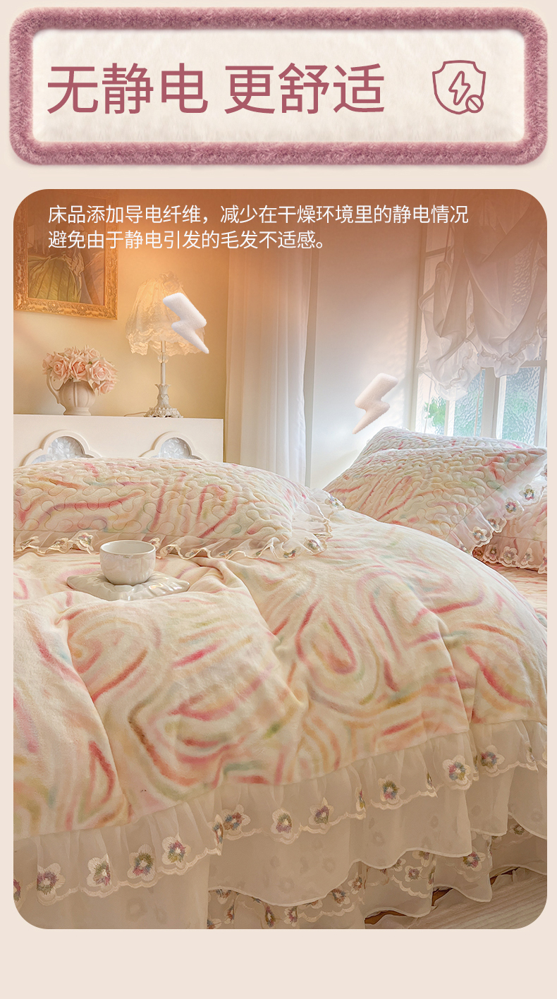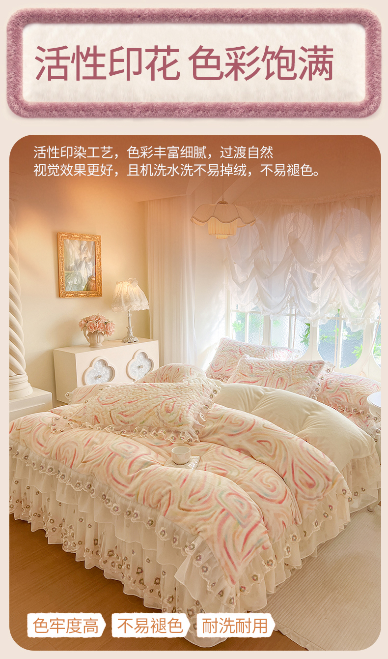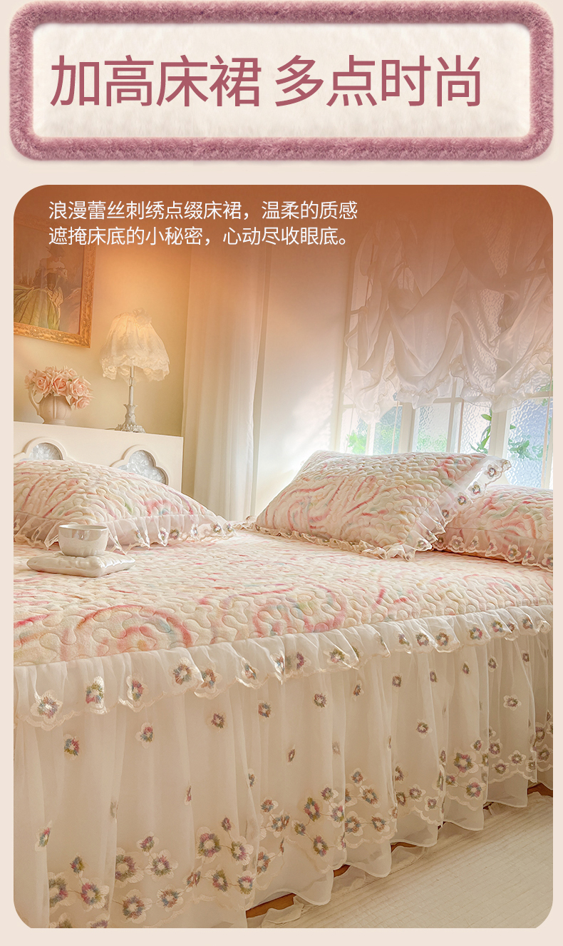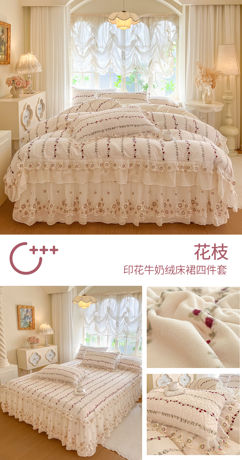 商品名称:网红馆(ck家纺) 2025新款亲肤舒适印花牛奶绒蕾丝边床裙系列四件套 星晴