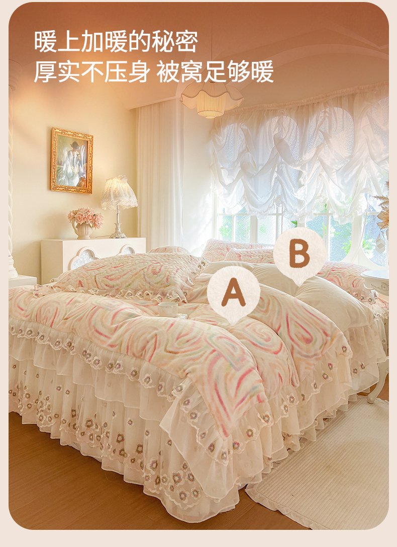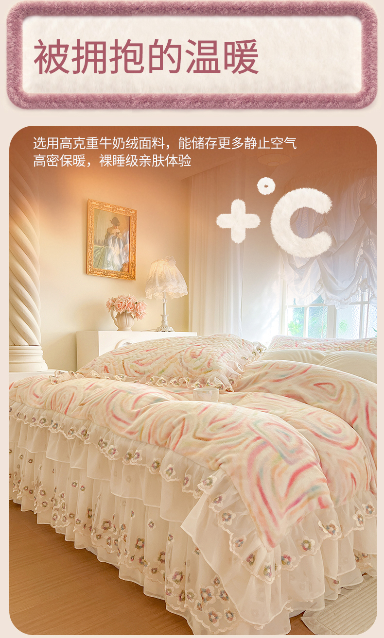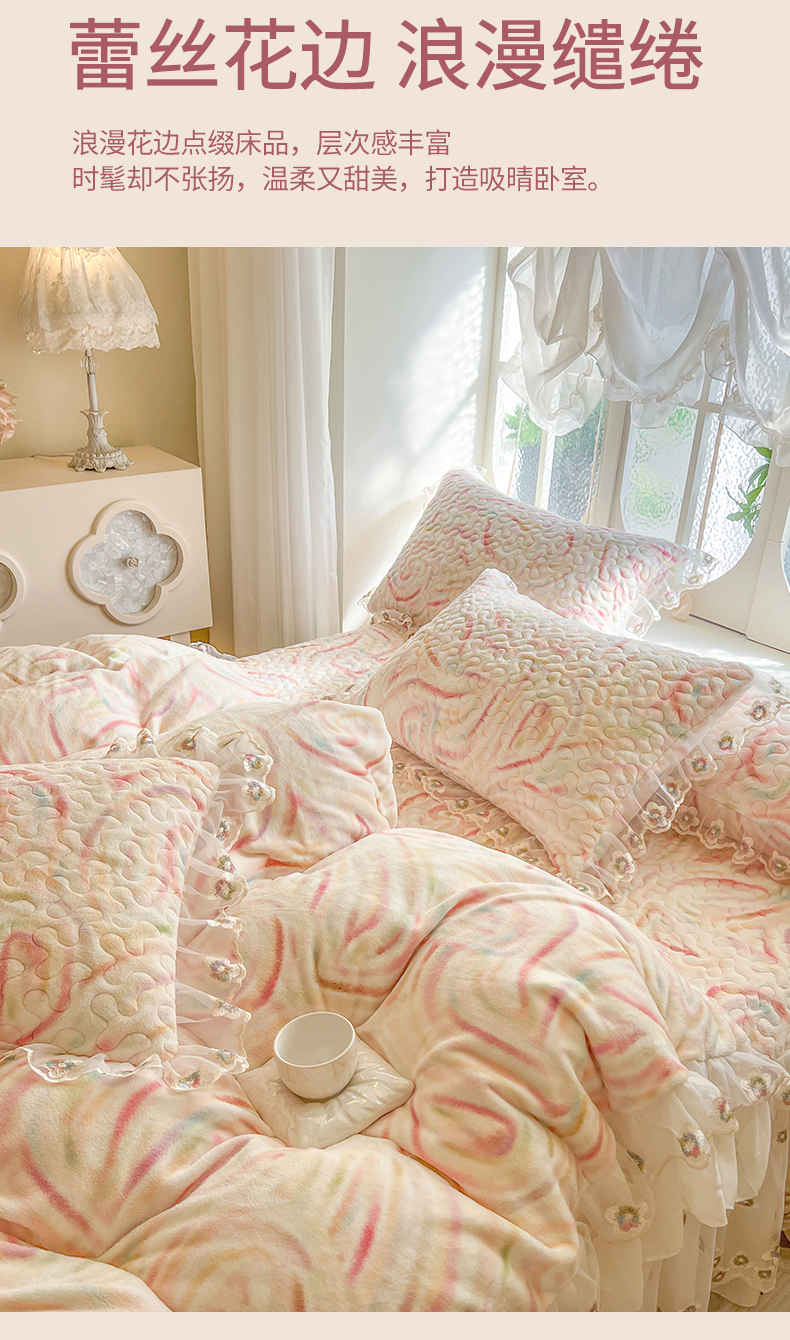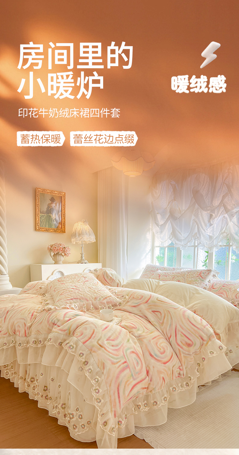 商品名称:网红馆(ck家纺) 2025新款亲肤舒适印花牛奶绒蕾丝边床裙系列四件套 星晴