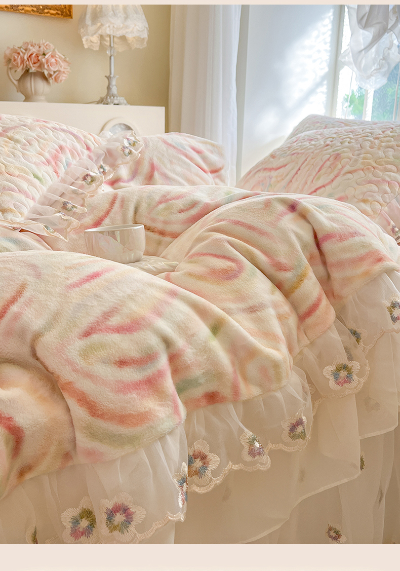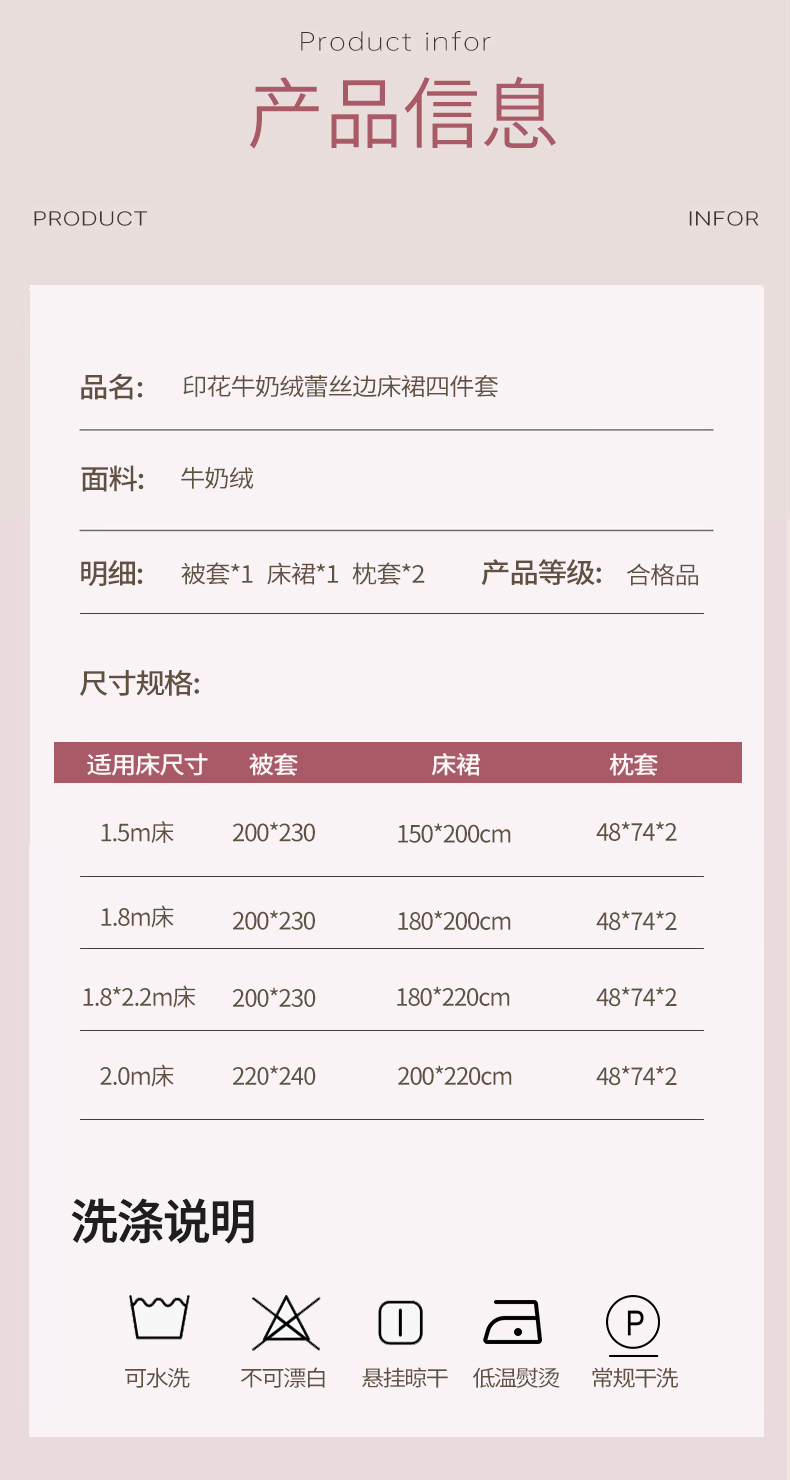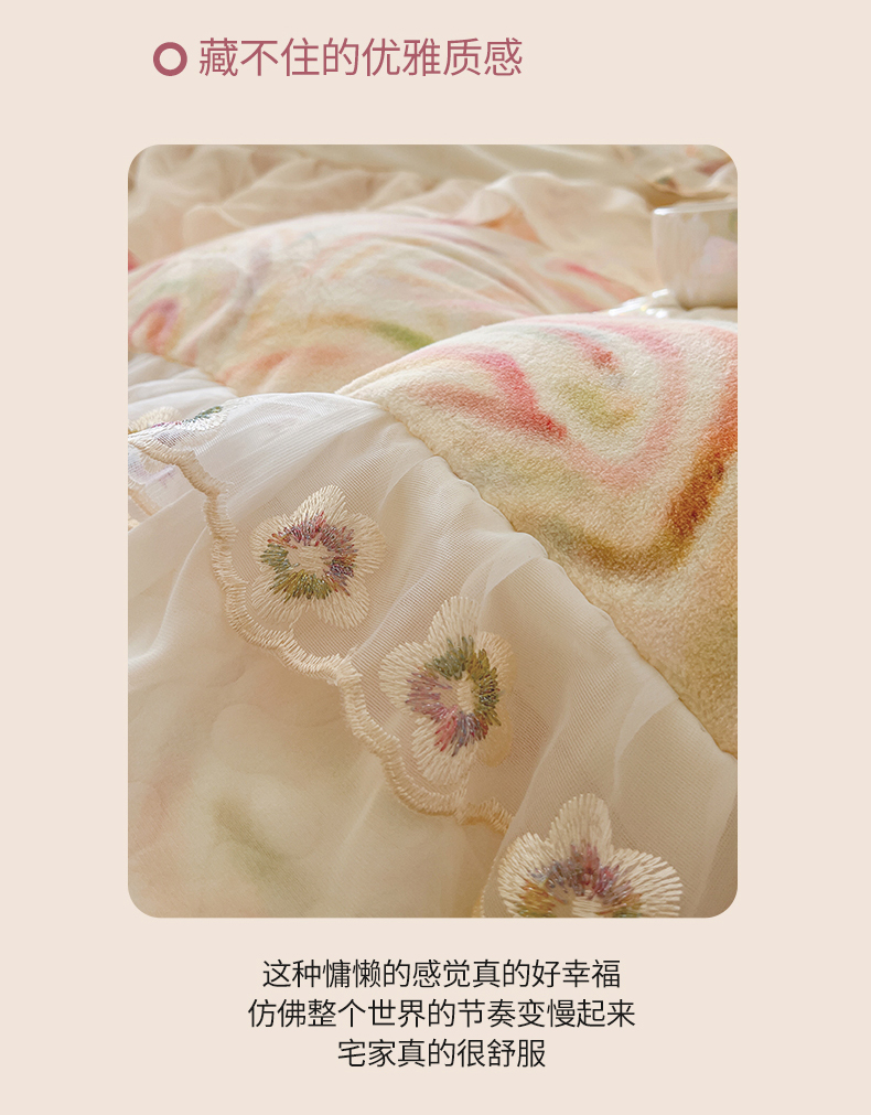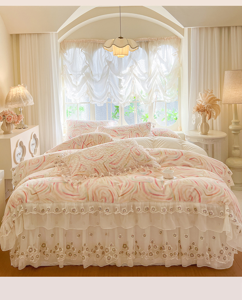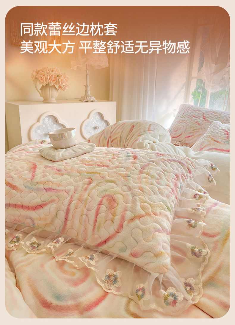 商品名称:网红馆(ck家纺) 2025新款亲肤舒适印花牛奶绒蕾丝边床裙系列四件套 星晴