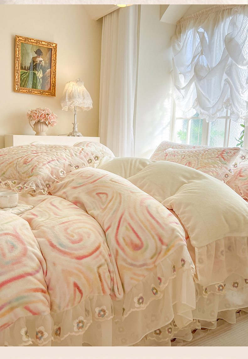 网红馆(ck家纺) 2025新款亲肤舒适印花牛奶绒蕾丝边床裙系列四件套 星晴