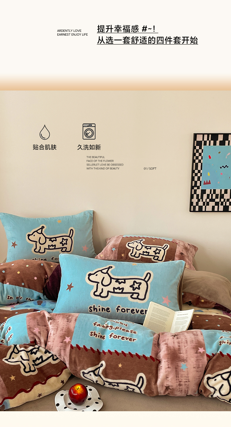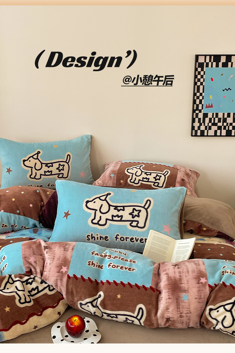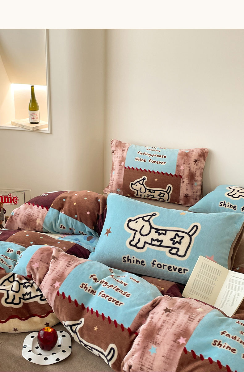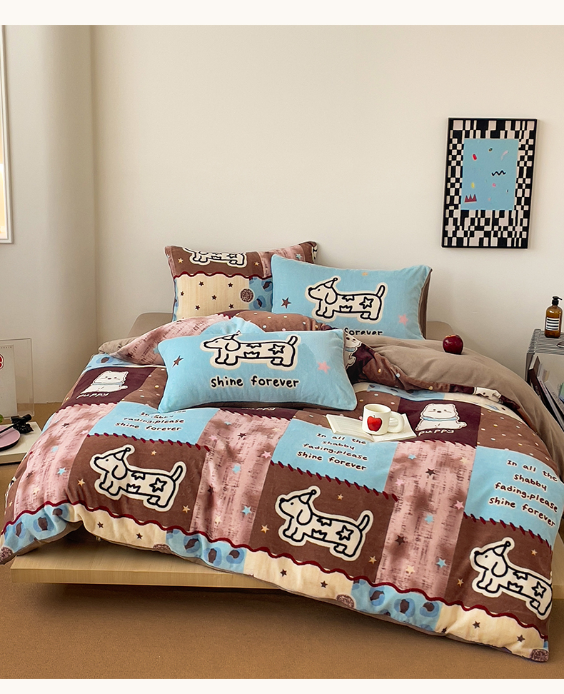 当前位置: 91家纺网 > 商品网购 > 床品套件 > 四件套 > 牛奶绒四件套 > 摩妮卡 2025新款牛奶绒枕套混搭卡通复古四件套 线条腊肠狗