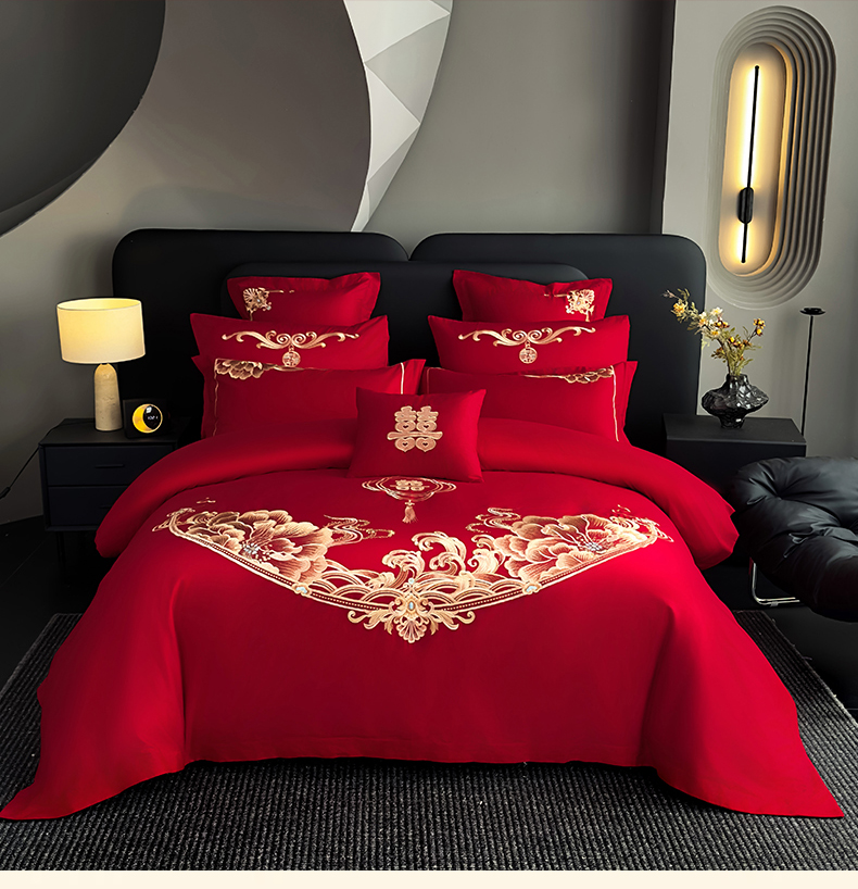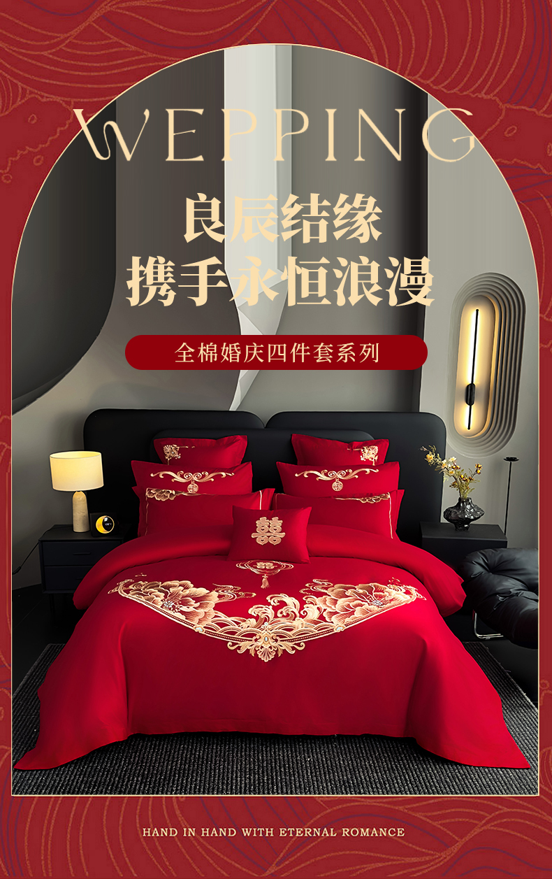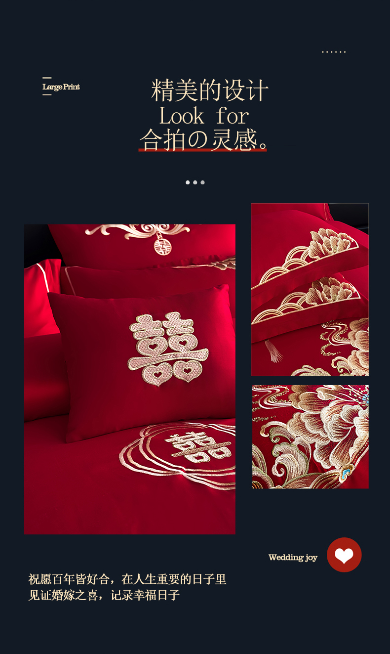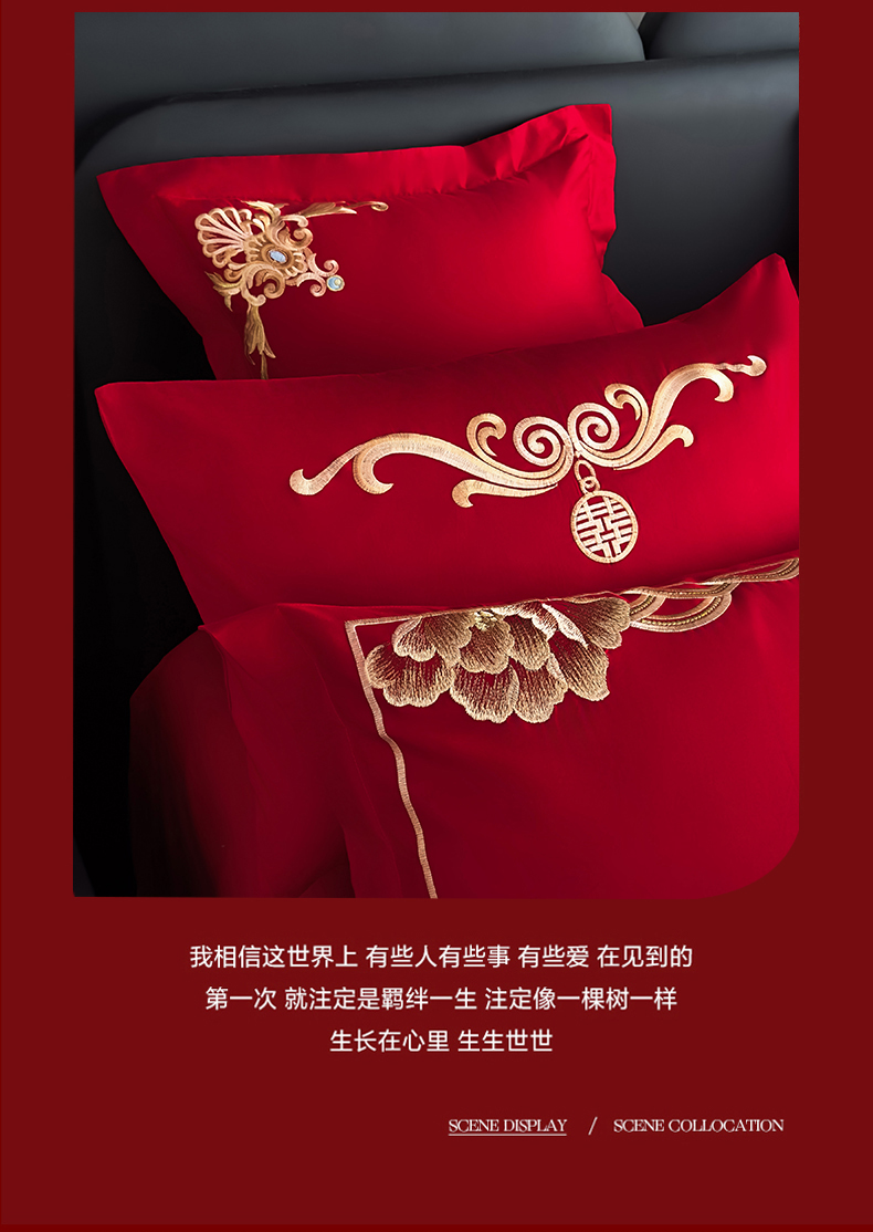 娇伊诗婚庆 2025新款刺绣工艺全棉婚庆四件套系列 幸福美满红,幸福美满红