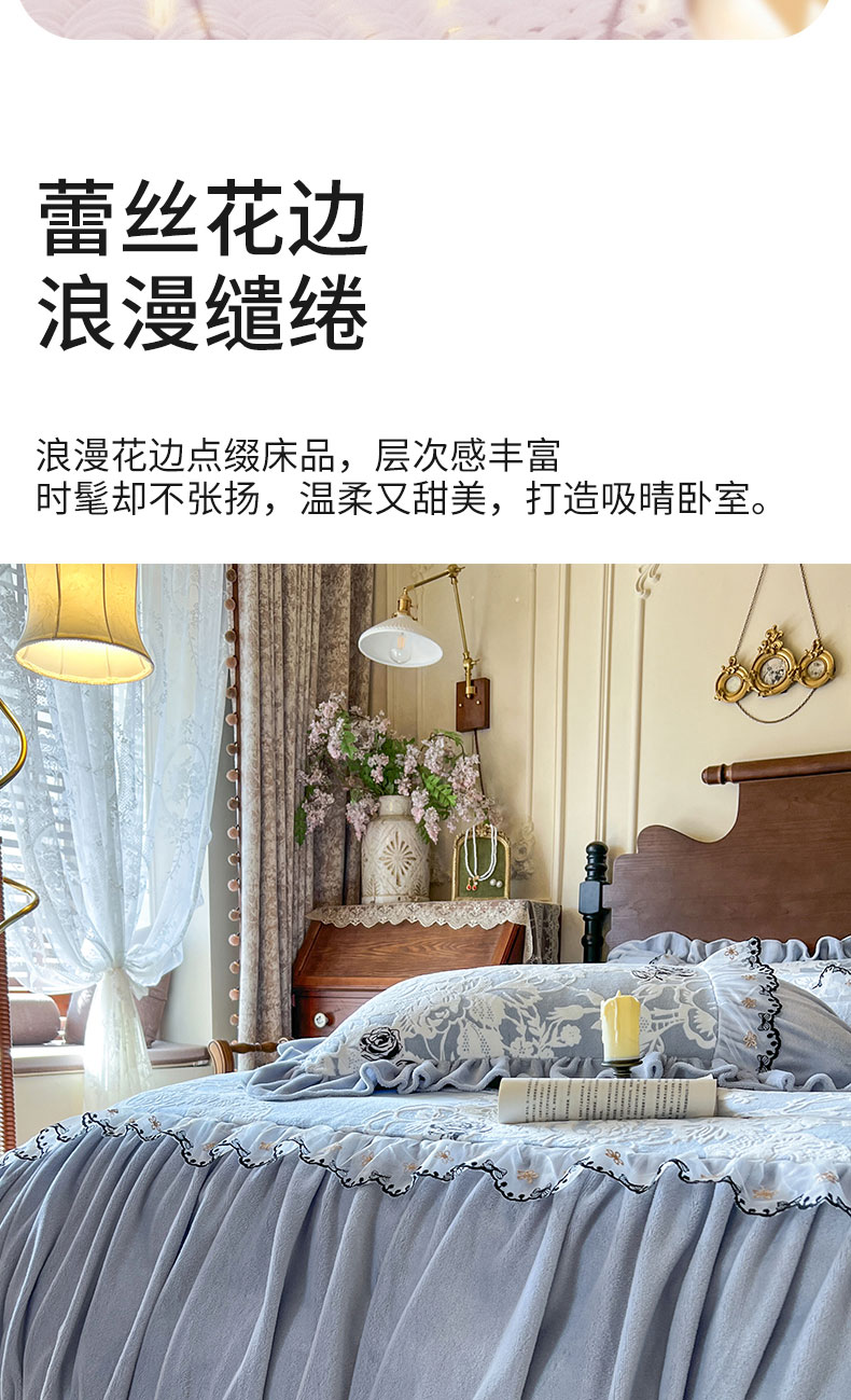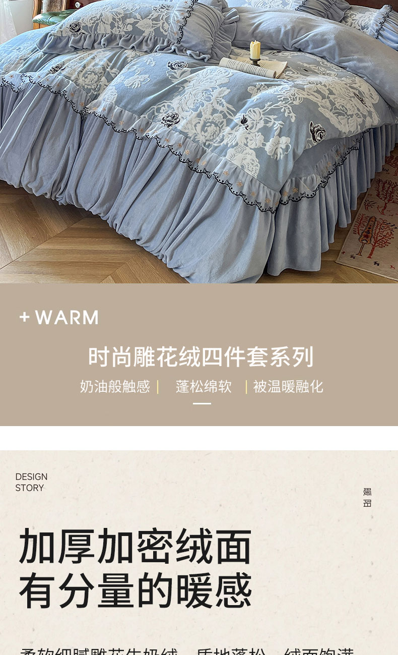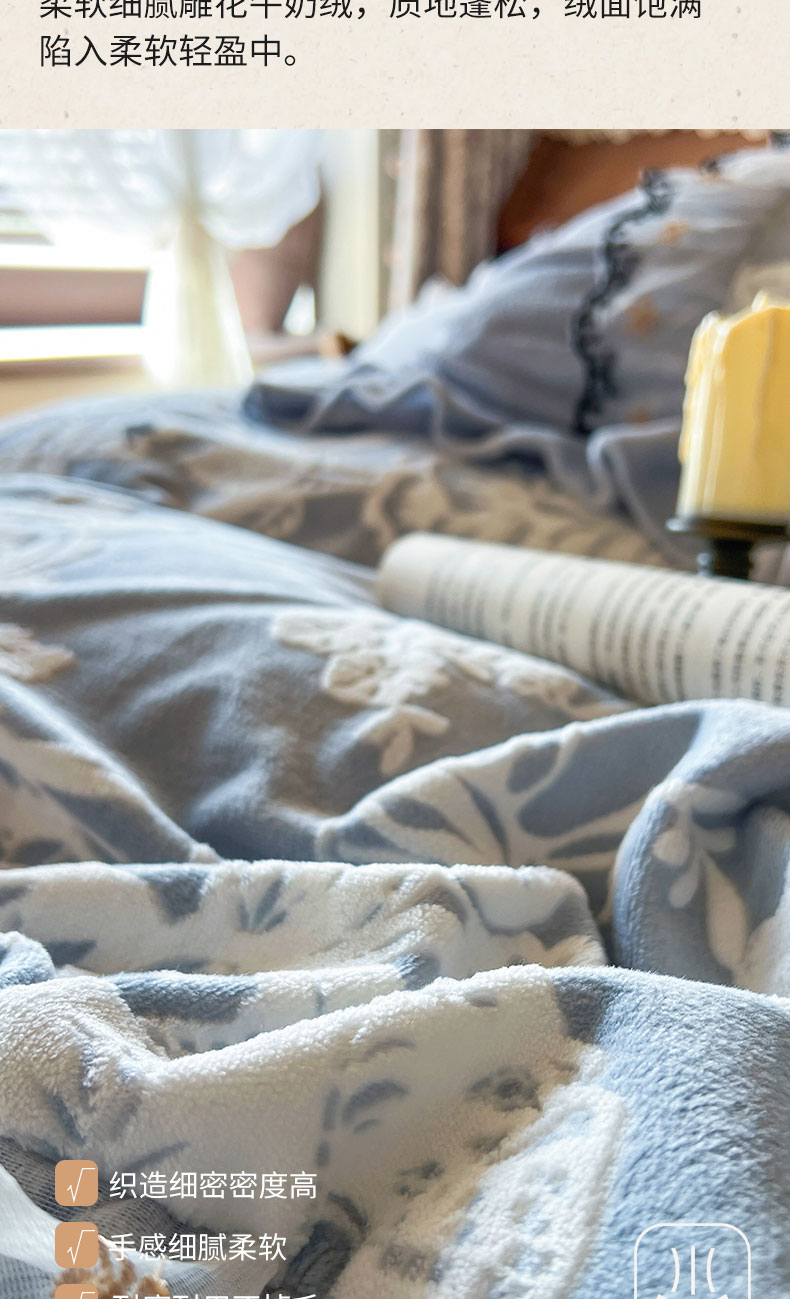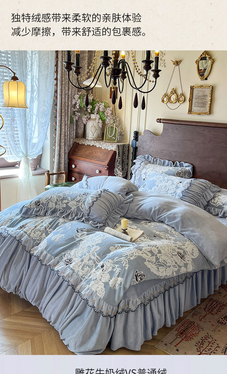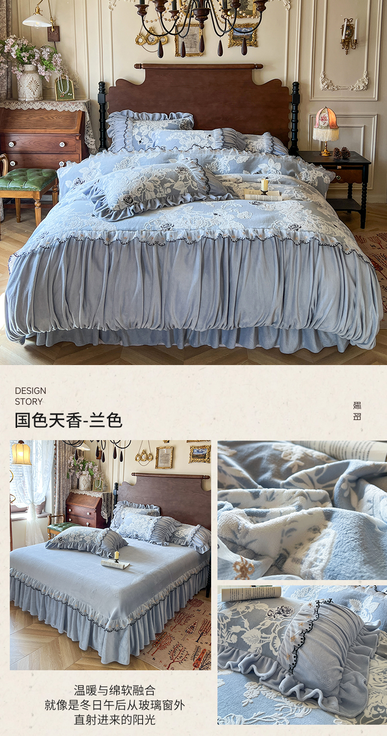 当前位置: 91家纺网 > 商品网购 > 床品套件 > 四件套 > 牛奶绒四件套 > 网红馆(ck家纺) 2025新款牛奶绒雕花花边四件套--国色天香 国色天香 兰色