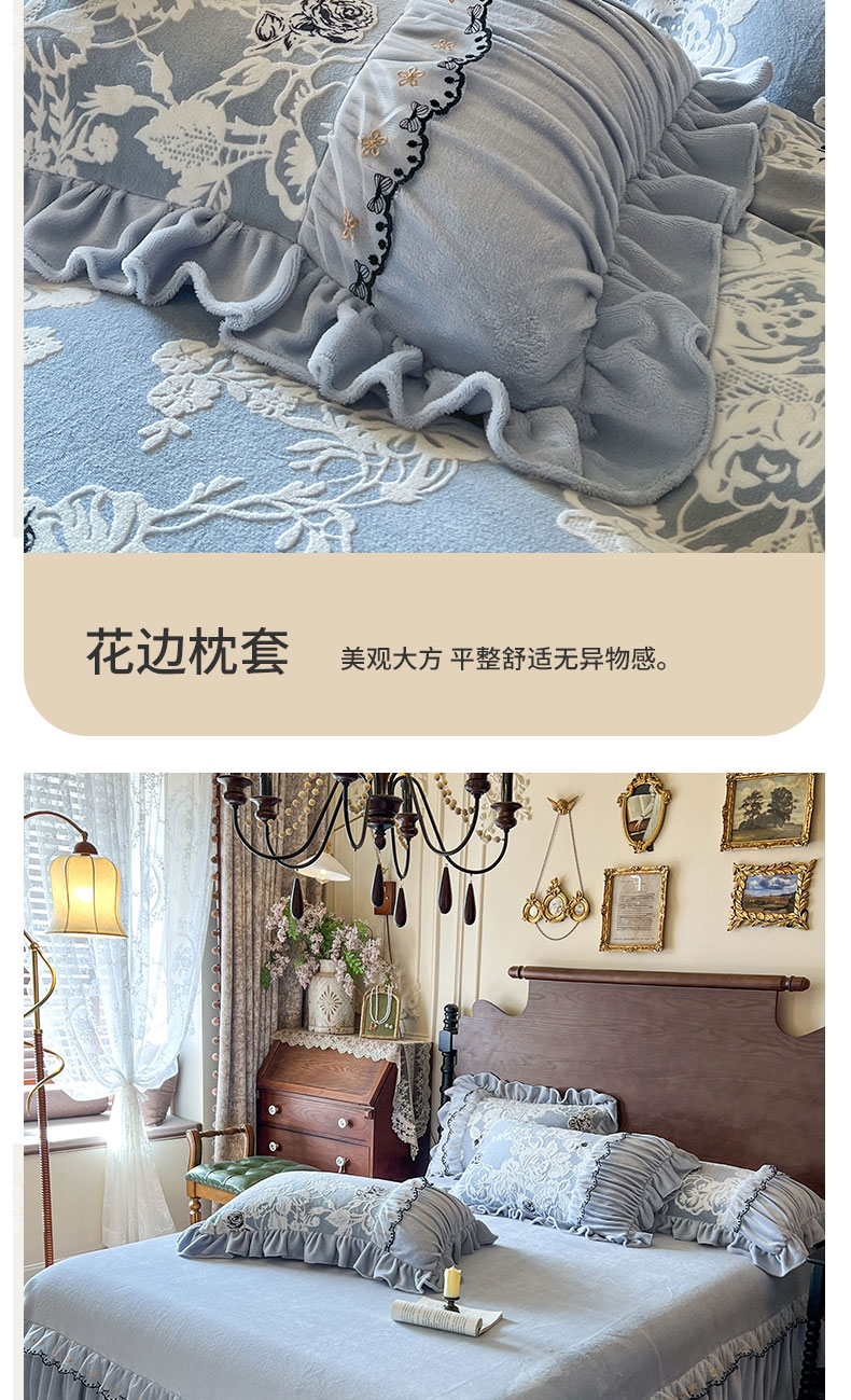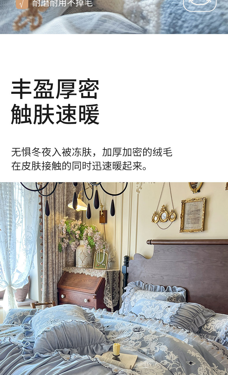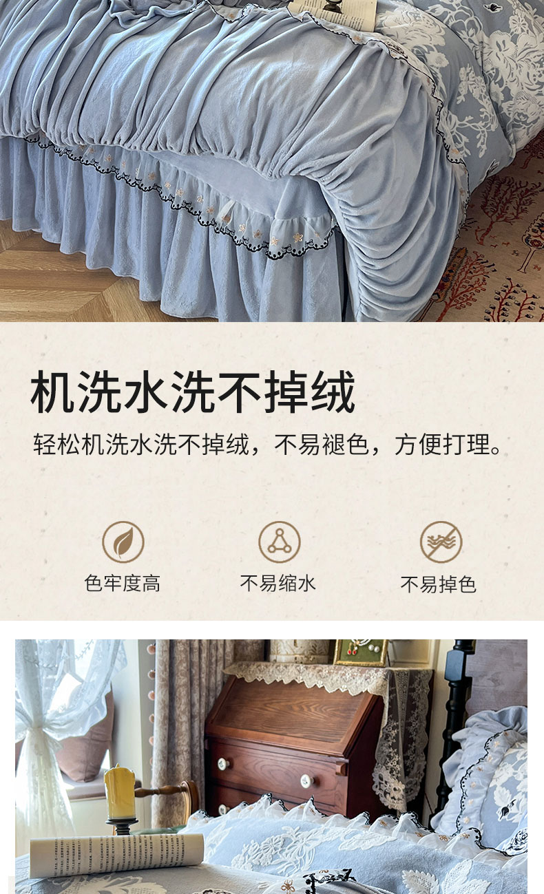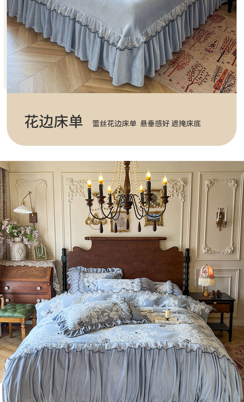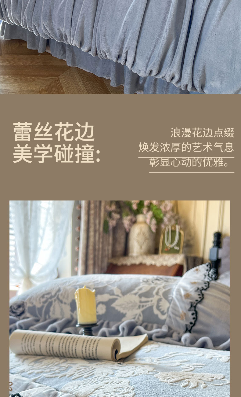 当前位置: 91家纺网 > 商品网购 > 床品套件 > 四件套 > 牛奶绒四件套 > 网红馆(ck家纺) 2025新款牛奶绒雕花花边四件套--国色天香 国色天香 兰色