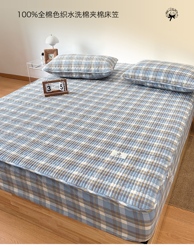 (总)居眠 2026新款全棉色织水洗棉格子夹棉棉花床笠,夹棉款-摩登蓝卡条,夹棉款-摩登绿卡条