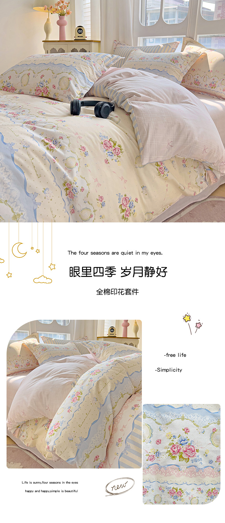 商品名称:曲之慕 2026春夏新款全棉纯棉小清新印花系列四件套床单床笠 时光漫旅