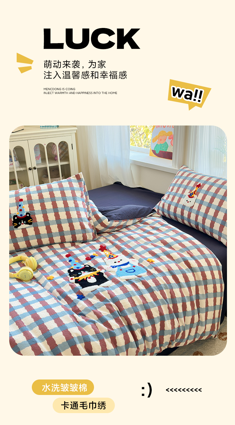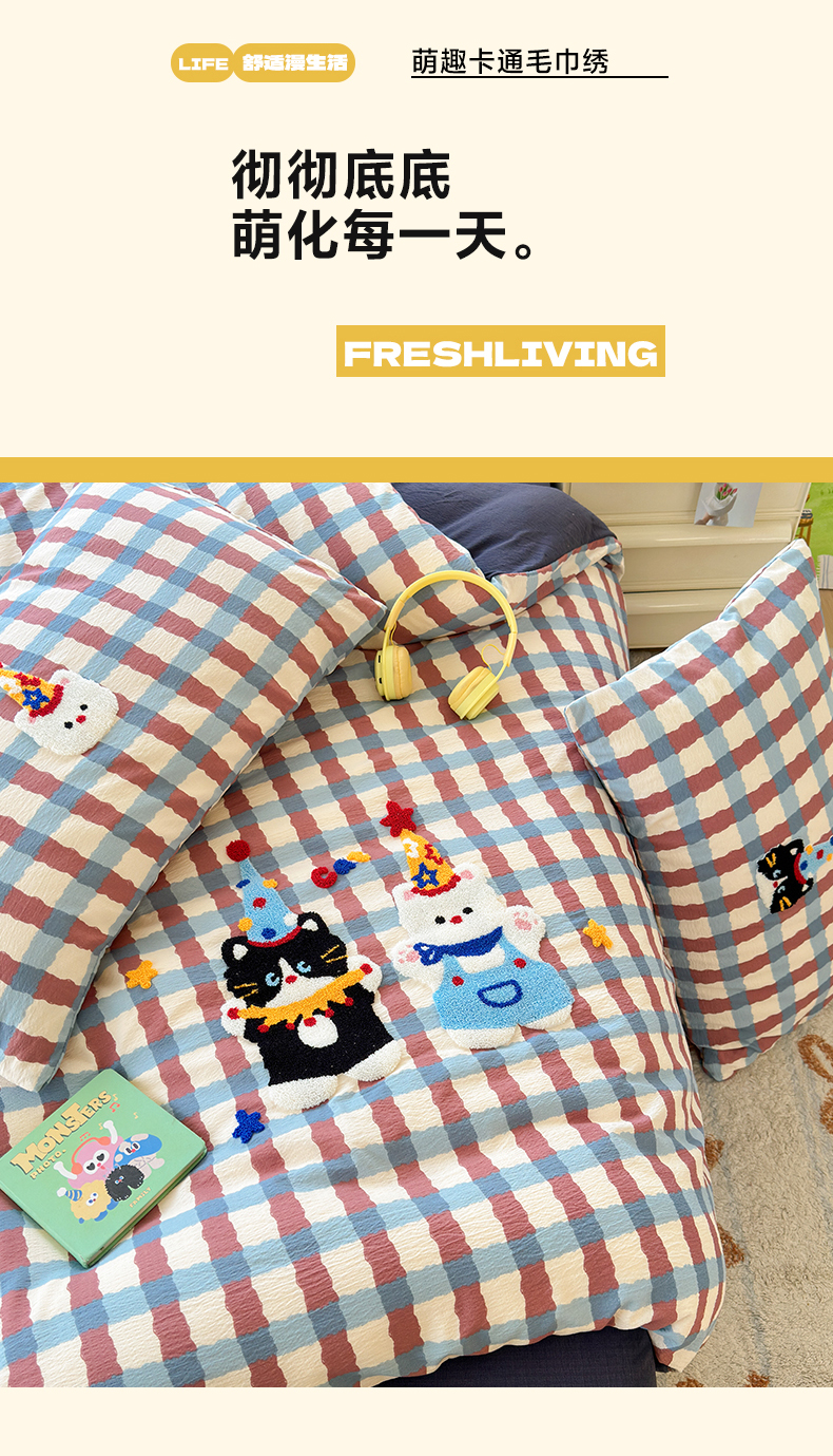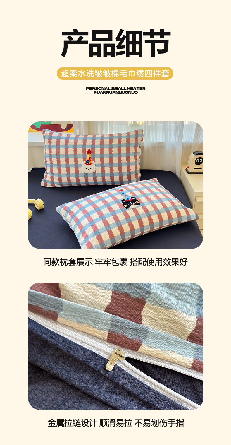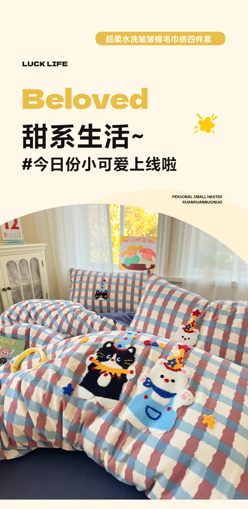 当前位置: 91家纺网 > 商品网购 > 床品套件 > 四件套 > 水洗棉四件套 > 奈颜 2026新款超柔水洗皱皱棉毛巾绣四件套 萌宠派对