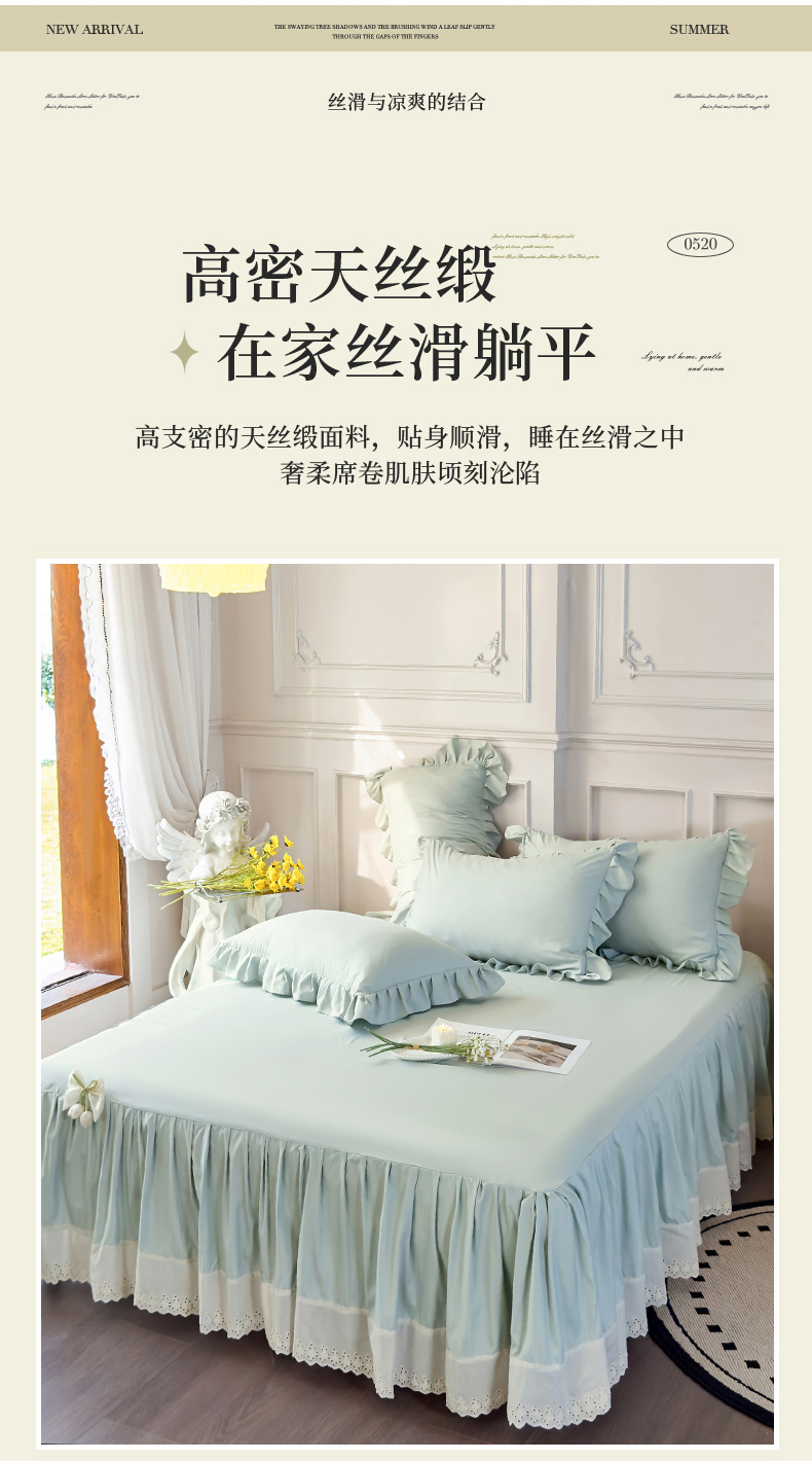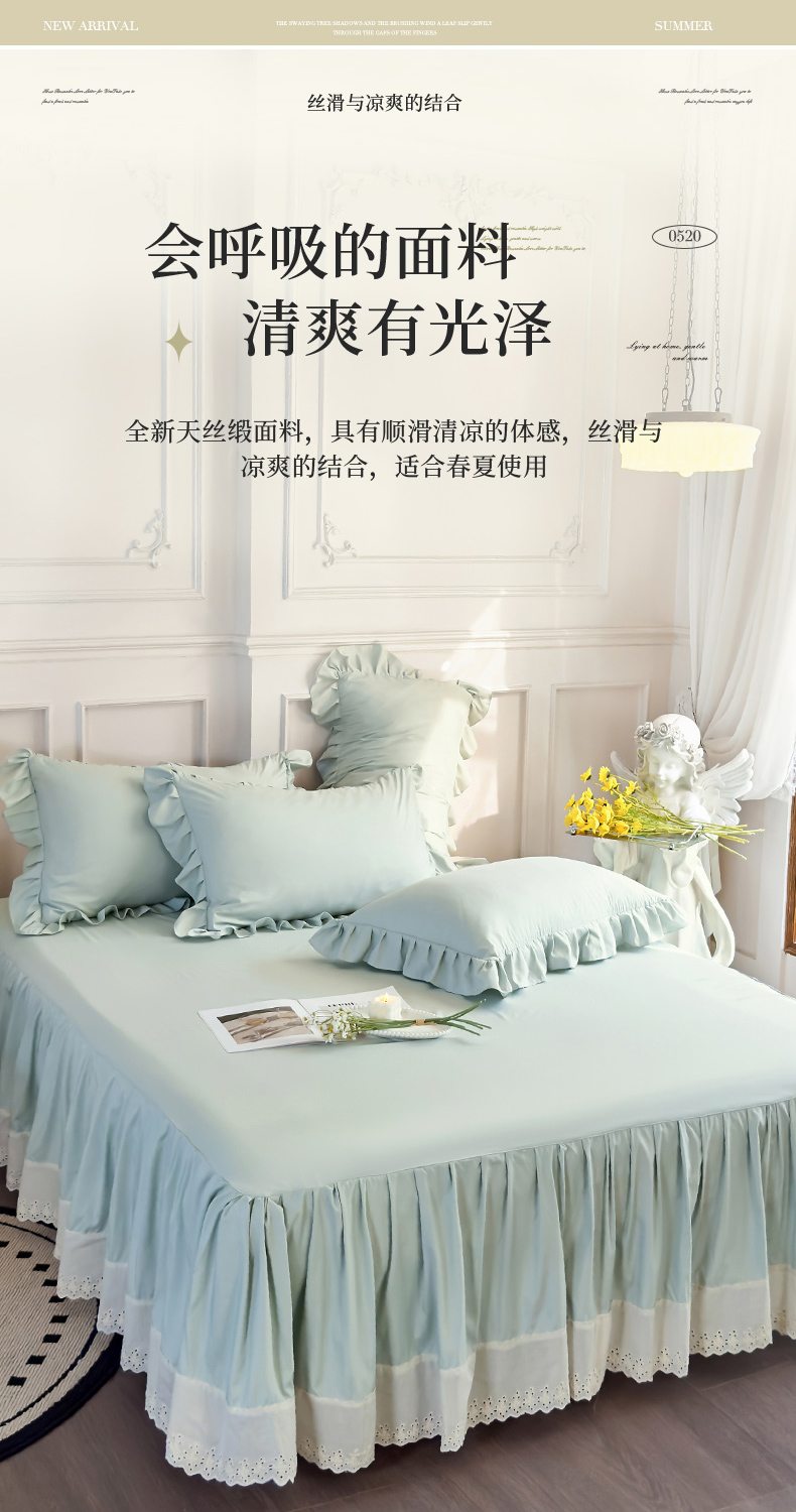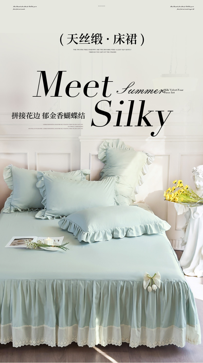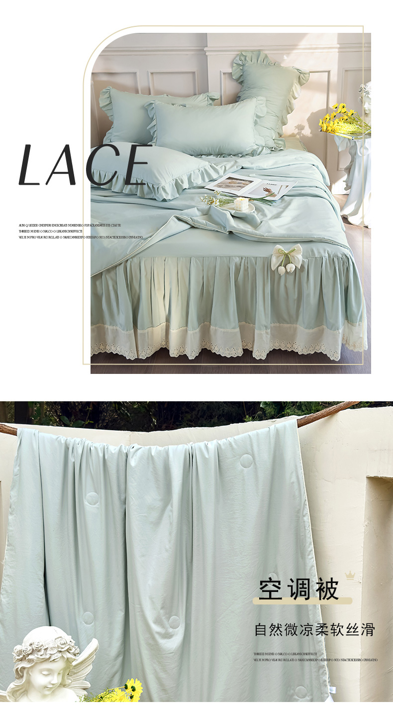 (总)乐朵家居 2026新款 25-3郁金香 天丝缎蕾丝床裙+可配空调被,绿,豆沙,奶白,灰,紫,卡其