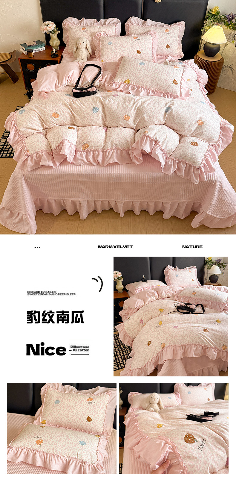 (总)金梦拉家纺 2026新款云感皱皱纱泡泡纱韩式床盖大花边四件套,爱心点点,豹纹南瓜,豹纹小熊,草莓,粉樱浅梦,海棠,咖调,可爱萌物,蓝色蝴蝶结,玫瑰花开,南瓜多多,柠檬蝴蝶结,素韵,甜甜草莓,条纹爱心,小樱桃,紫调草莓,紫韵,包装图仅做展示不可下单