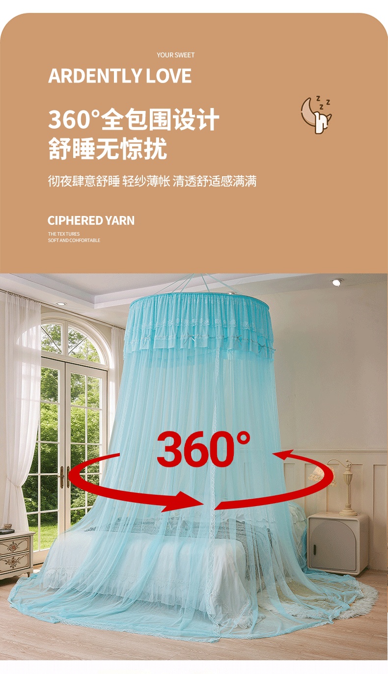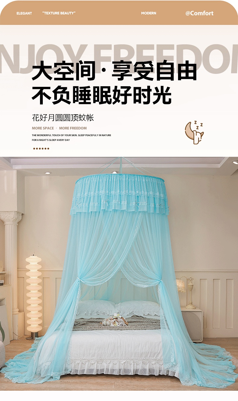 (总)梦尔佳蚊帐 2026新款蕾丝刺绣花好月圆圆顶蚊帐,蓝灰,奶白,奶黄,水蓝,玉色