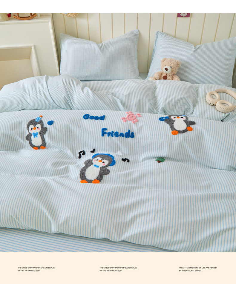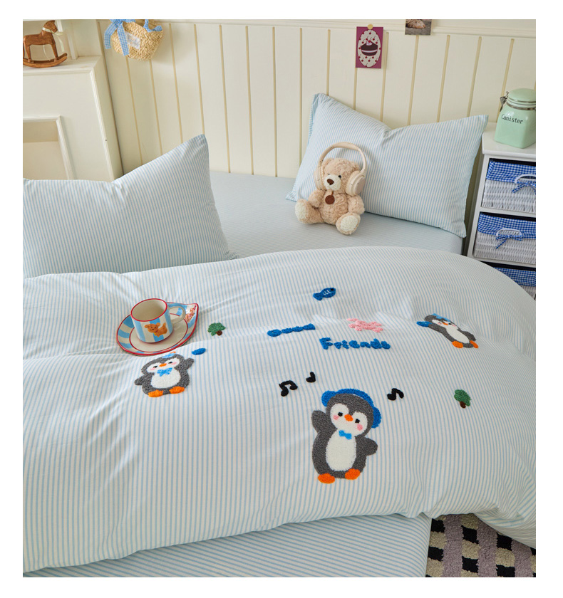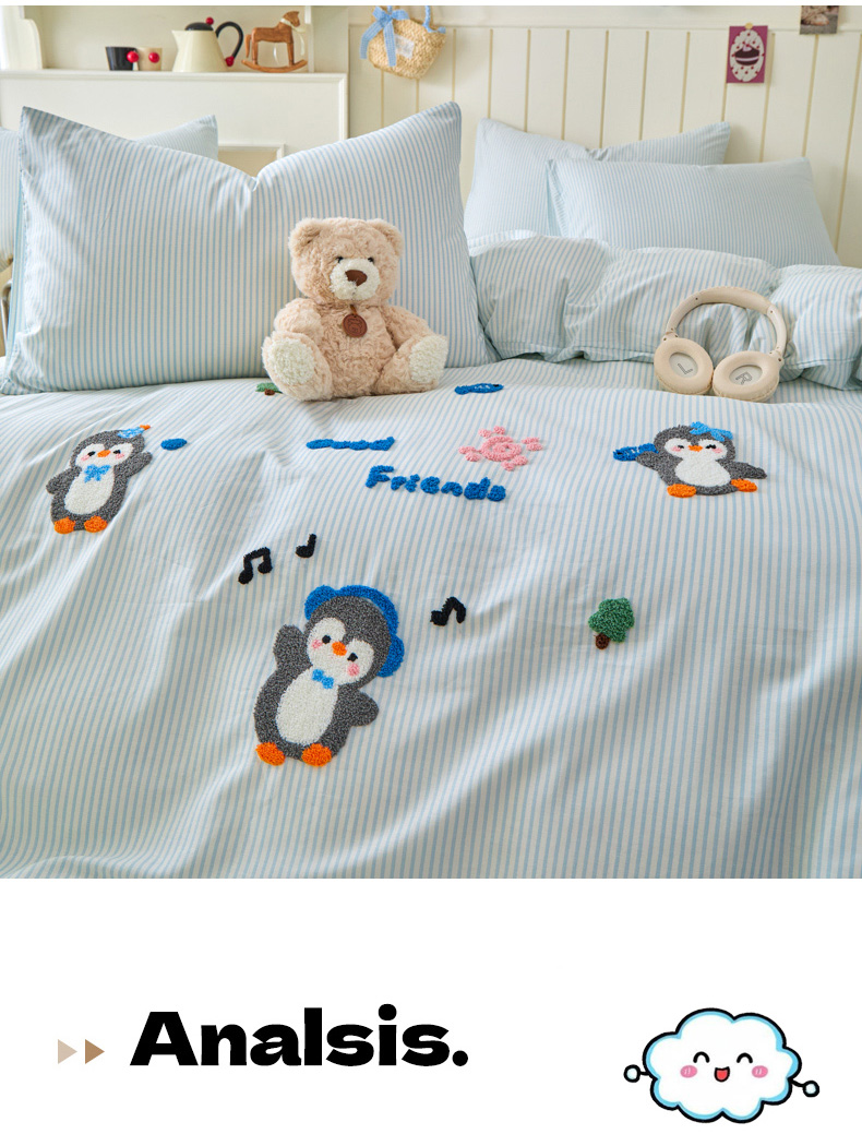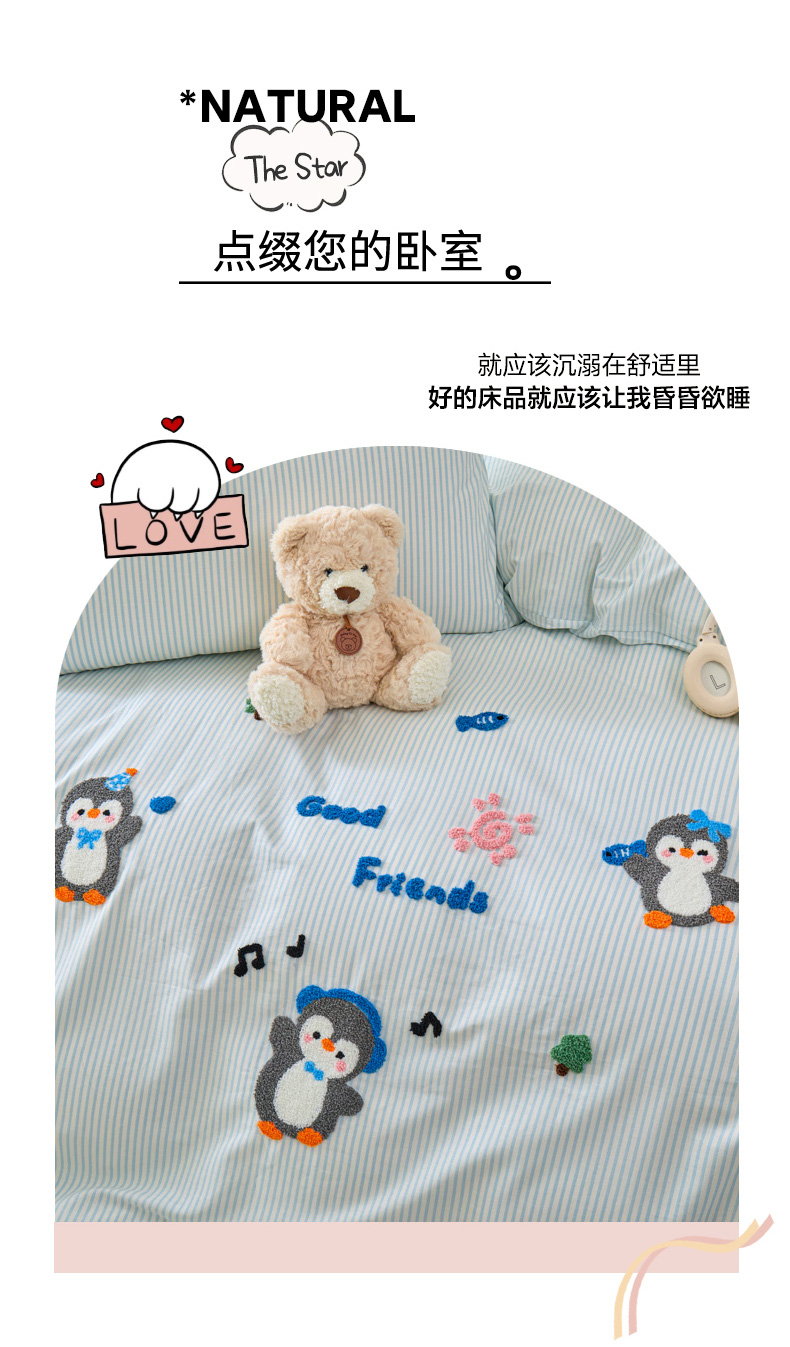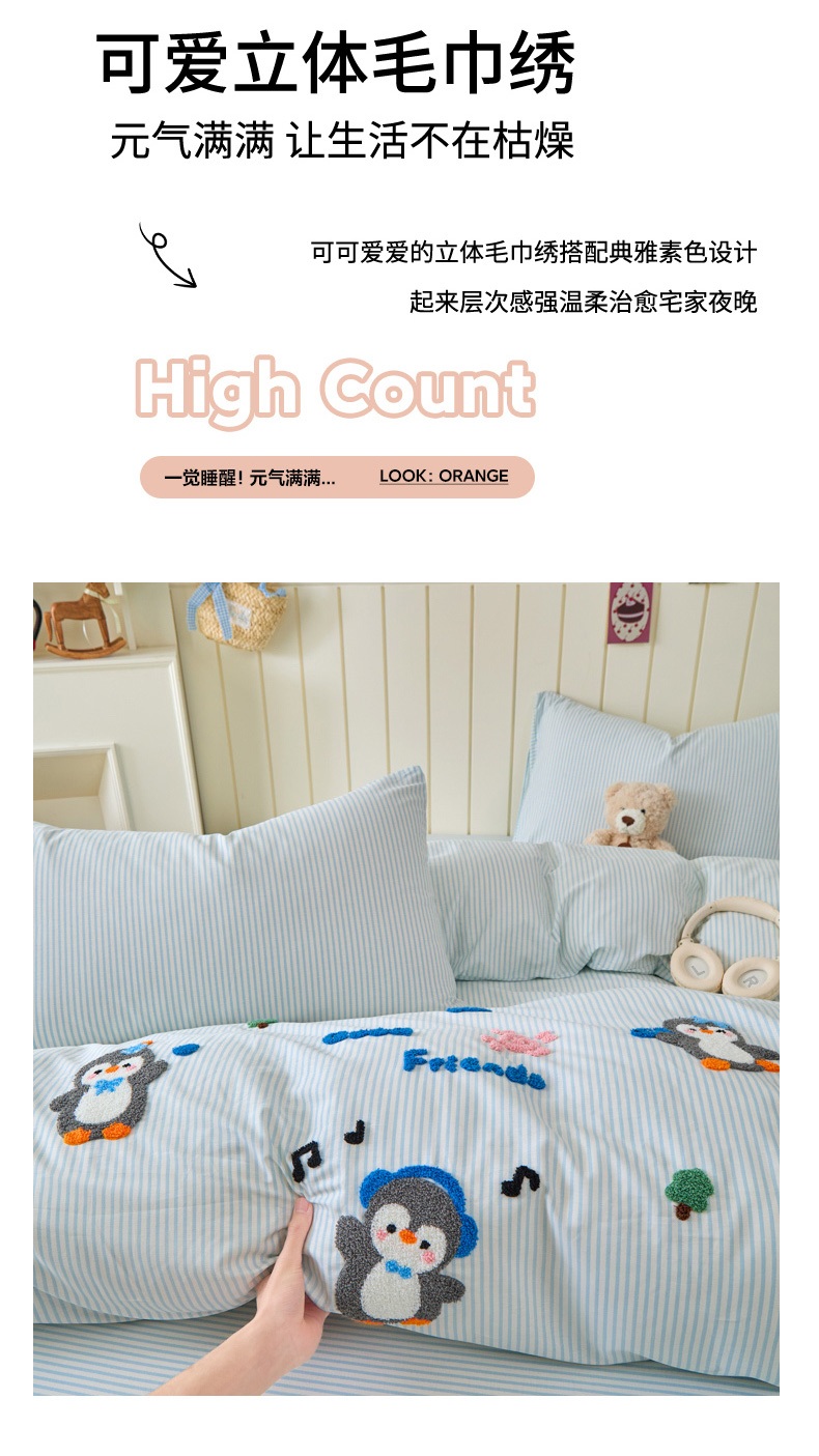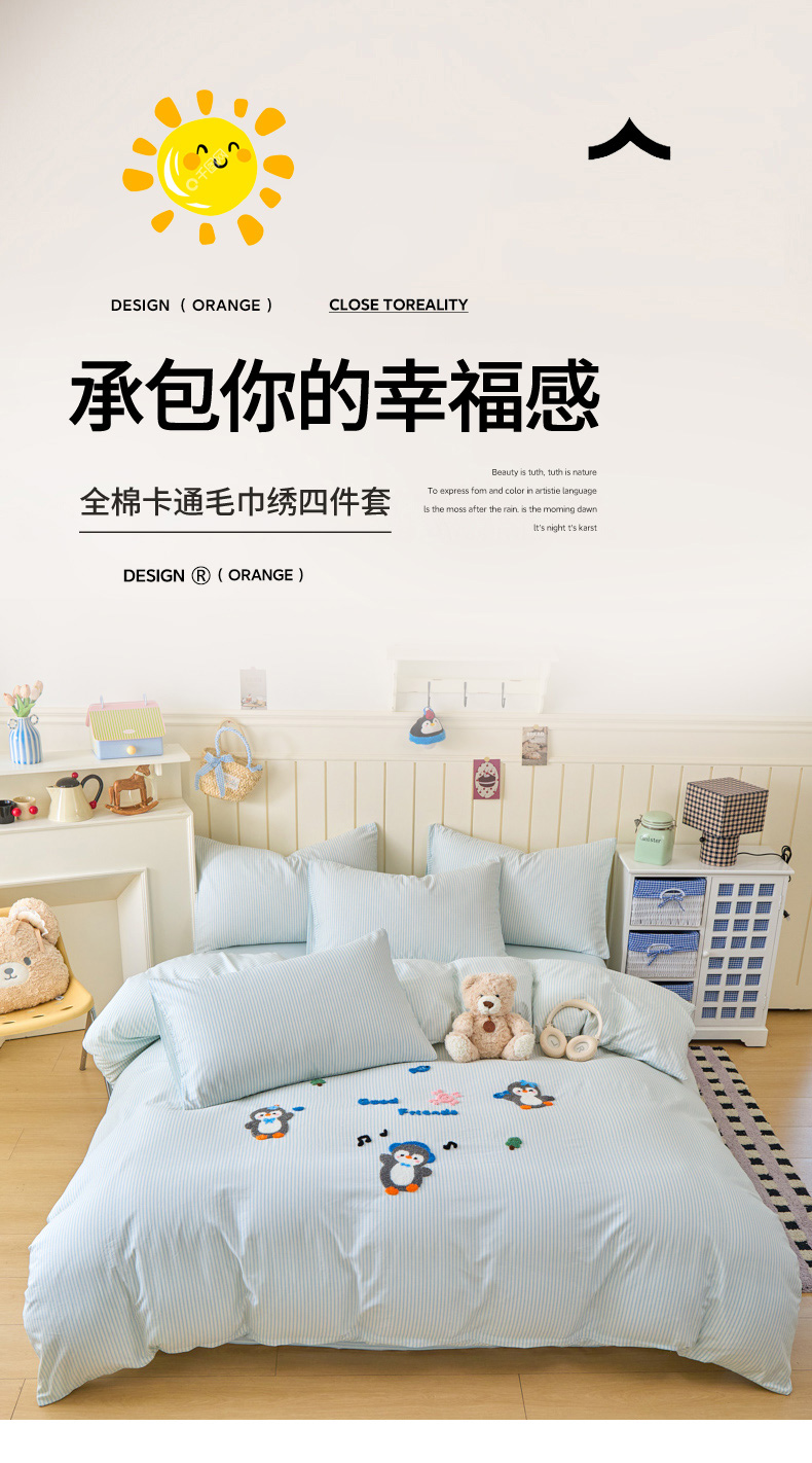 倾慕家纺 2026新款全棉卡通毛巾绣系列四件套 欢乐企鹅