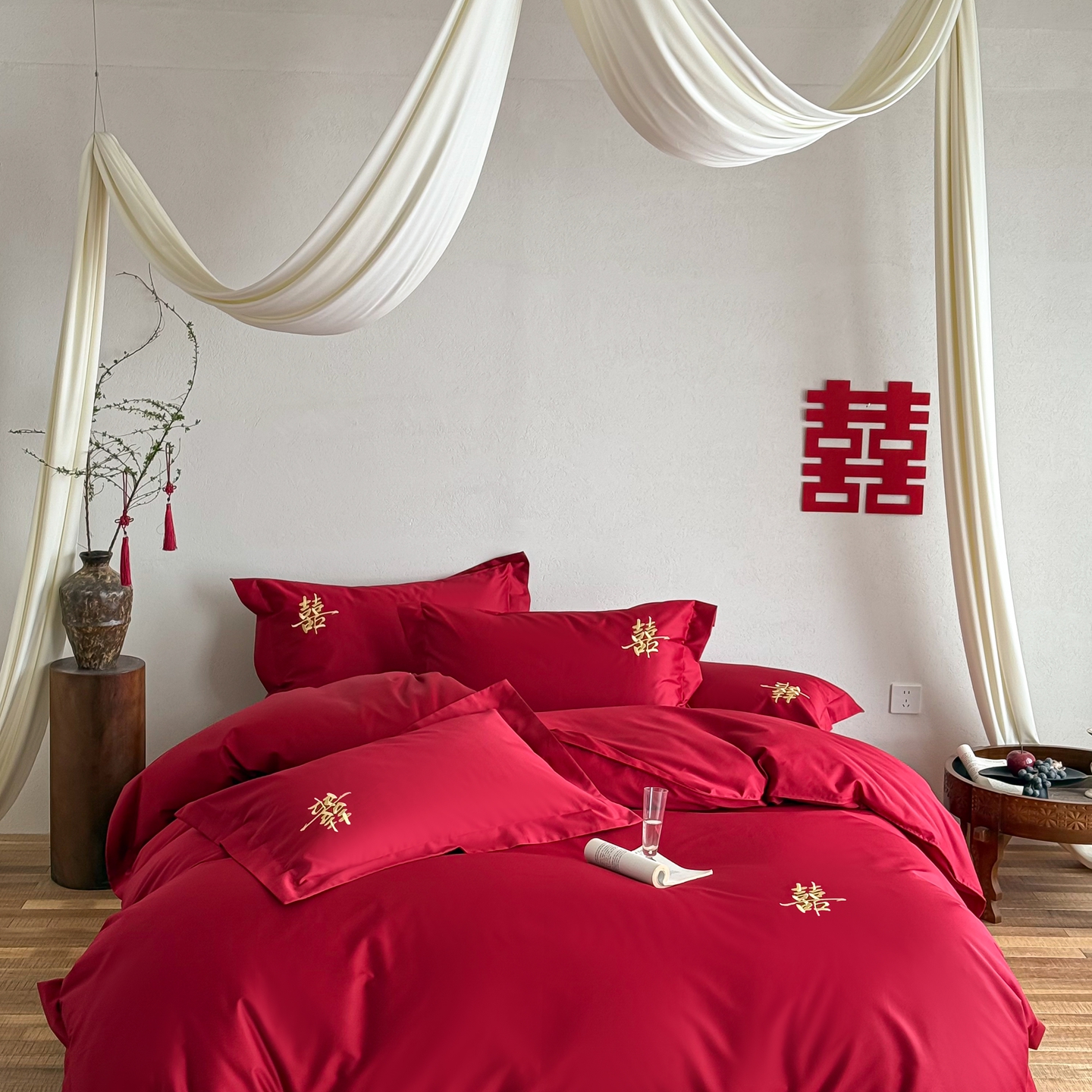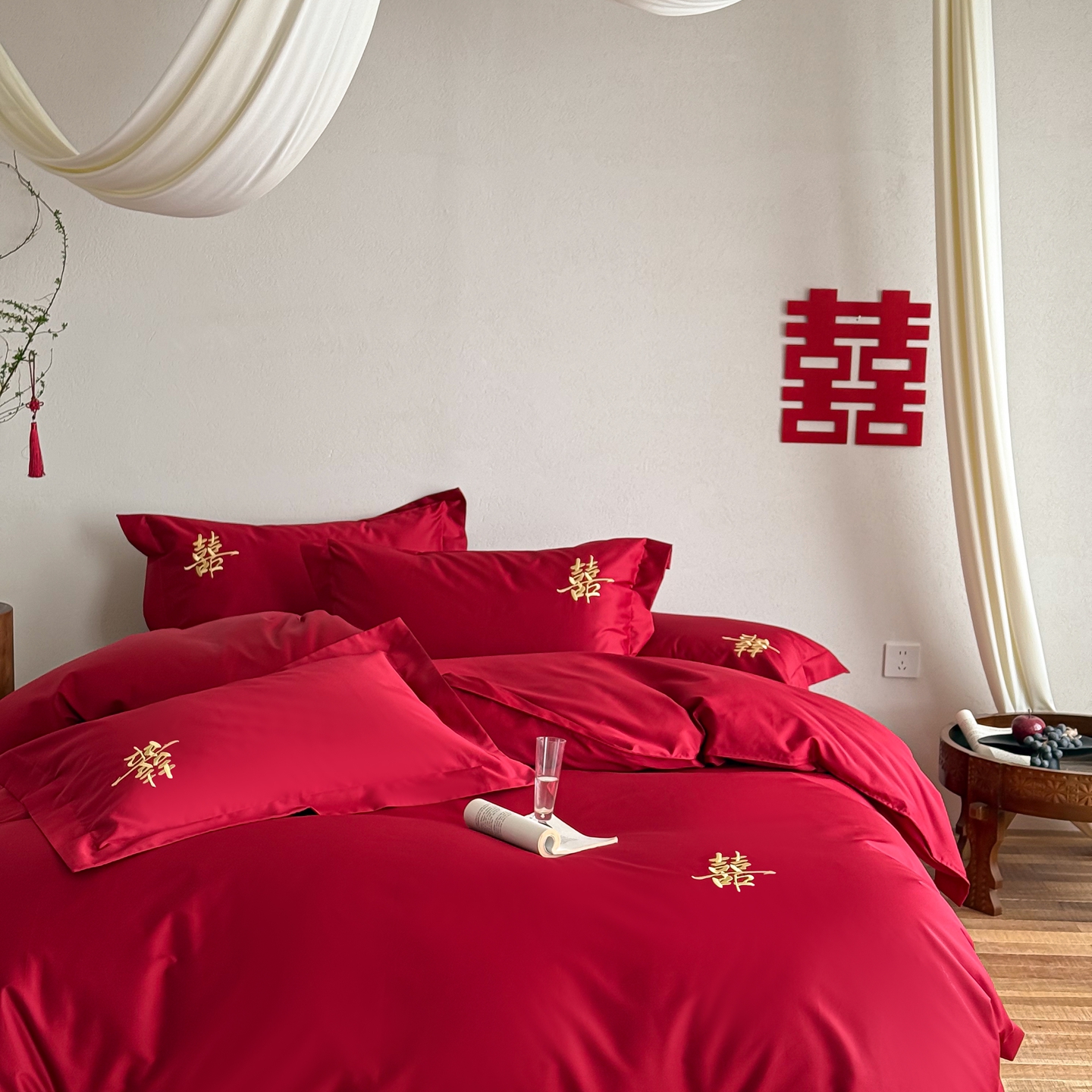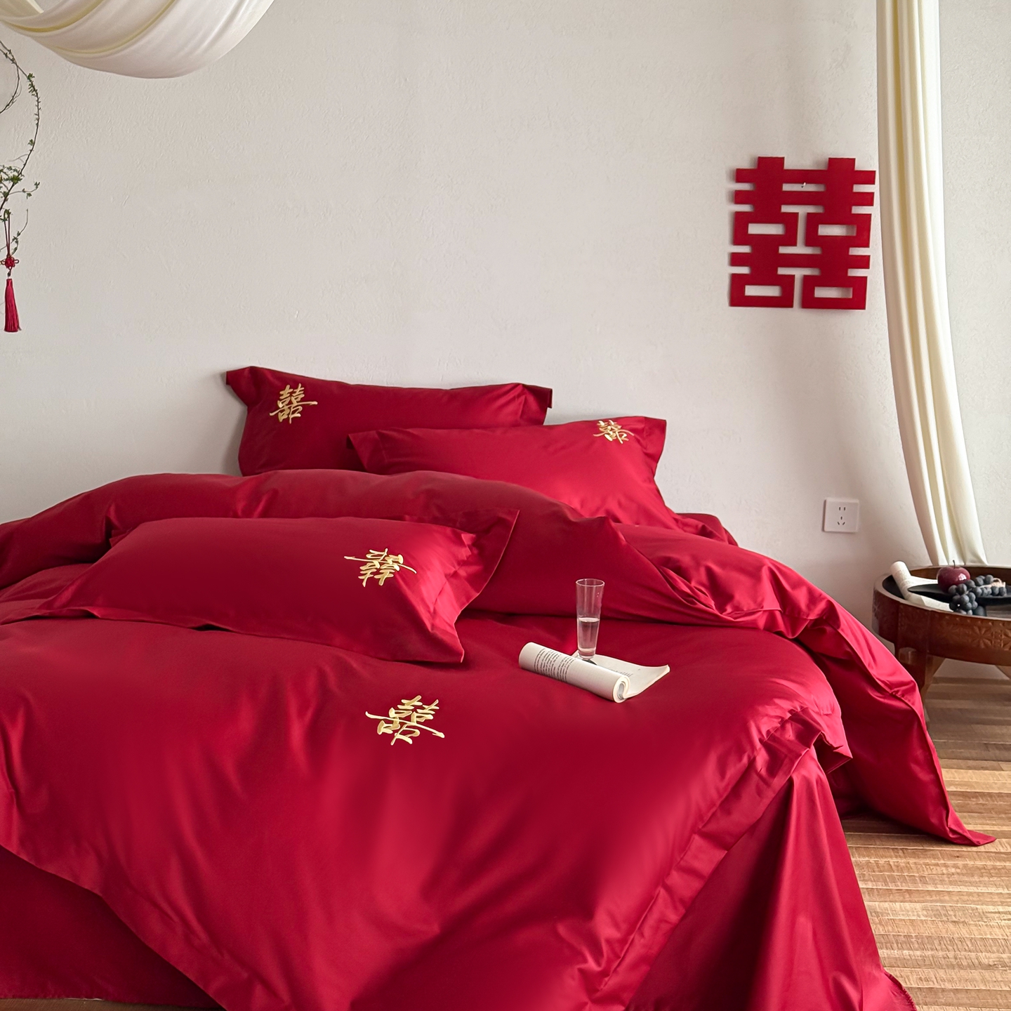 (总)西西家居 2026新款100S长绒棉纯棉刺绣四件套-家有囍事(含精致红色礼盒)