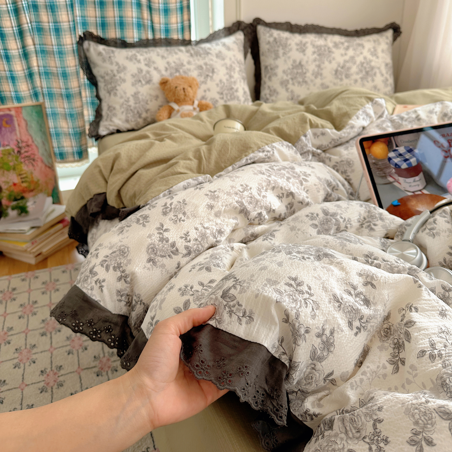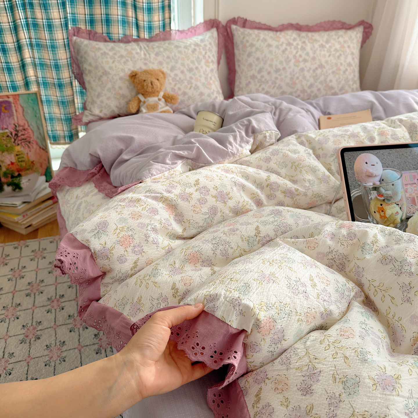 (总)一比一 2026新款云感皱皱双层纱四件套-全棉花边款【控价99元销售】,半夏绿,百福蓝,薄荷微凉,春风里,春晓,豆蔻,蝴蝶梦,可颂,兰黛,山野栀子,素颜,太妃糖,心动,遇见,芝士奶酪,紫爱心,紫苏,花园兔,蜡笔画,小黑兔,白茶-绿,初恋,莱茵河畔,桃花诺