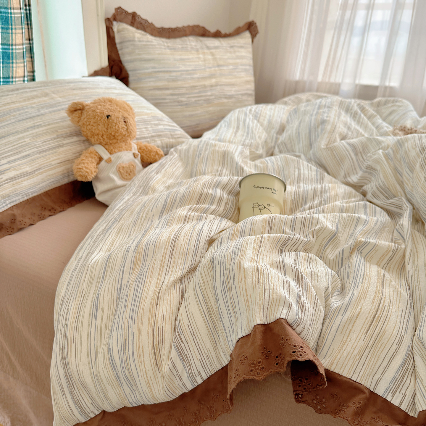 一比一家纺 2026新款彩色花边木棉皱皱纱四件套 扶摇