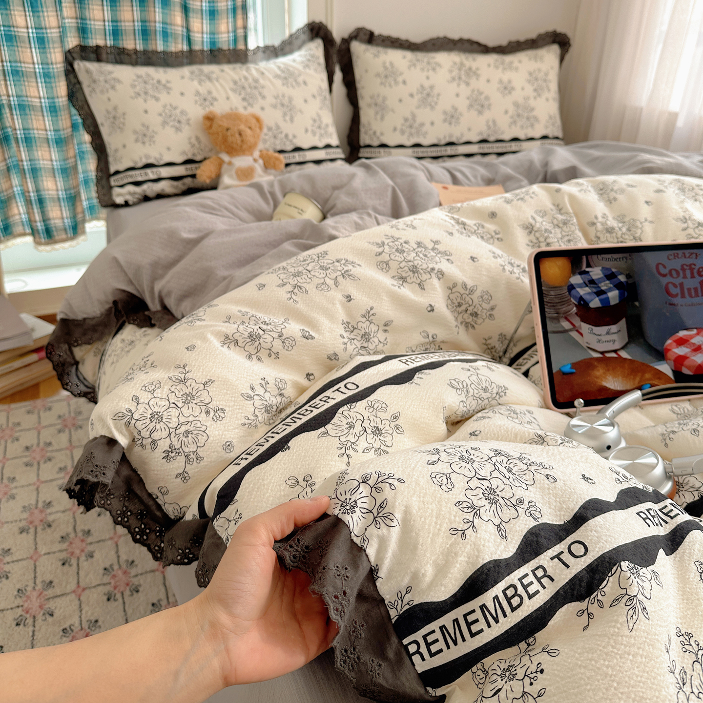 (总)一比一家纺 2026新款云感泡芙棉小清新印花贝壳边四件套,豹纹凯蒂,蛋糕星人,费尔岛小狗,哈喽星人,黑白蝴蝶,萌趣小马,萌趣小熊,青涩樱桃,诗意柔,小汽车,摇摇星人,樱桃波点
