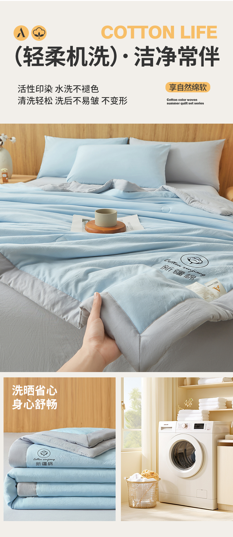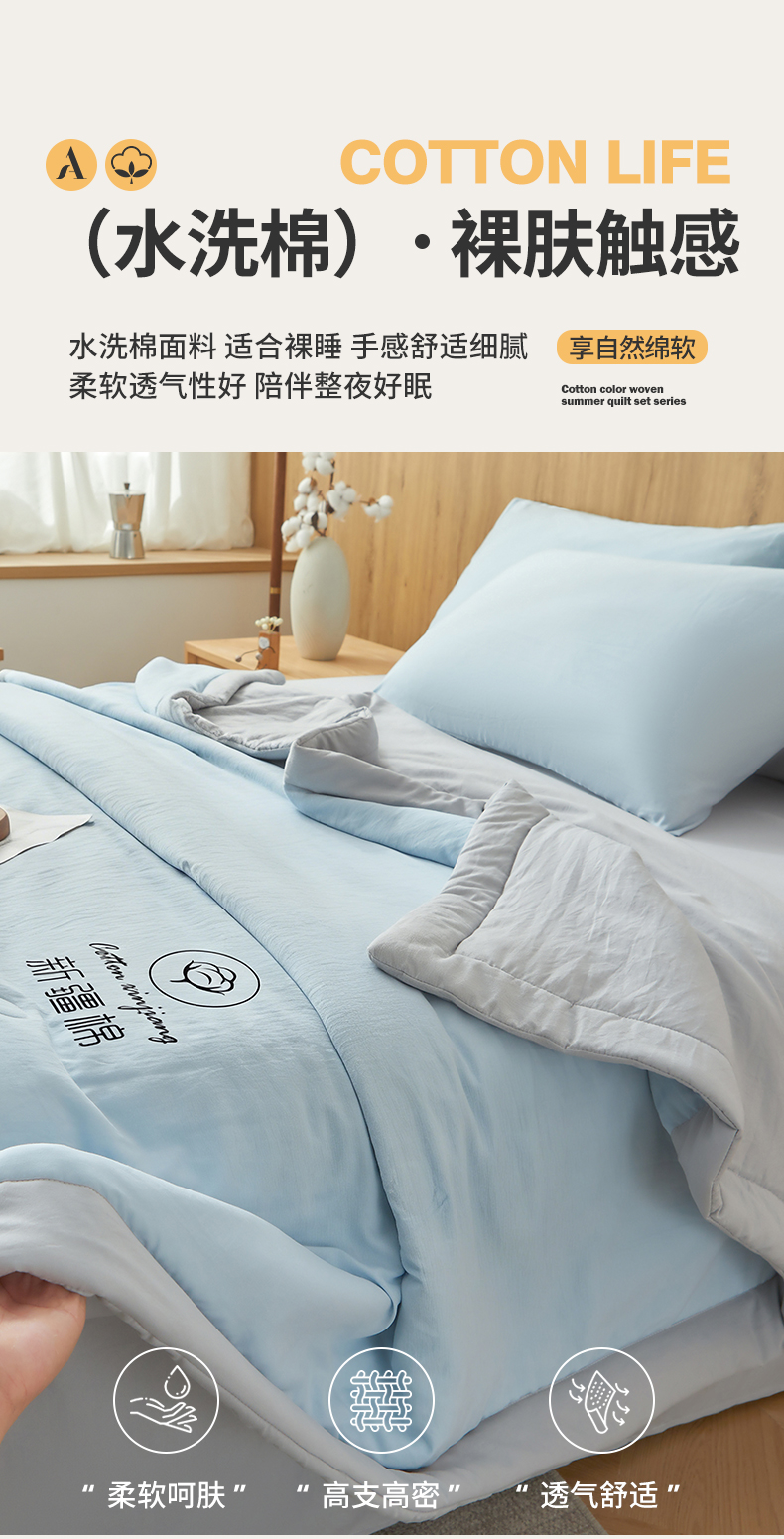 商品名称:晓时候 2026春夏新款纯色水洗棉双拼夏被新疆棉花被夏凉被空调被被子被芯-素夏 素夏-蓝灰