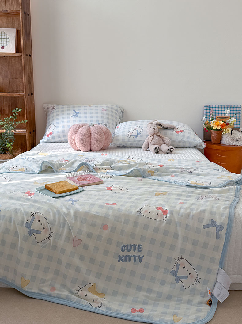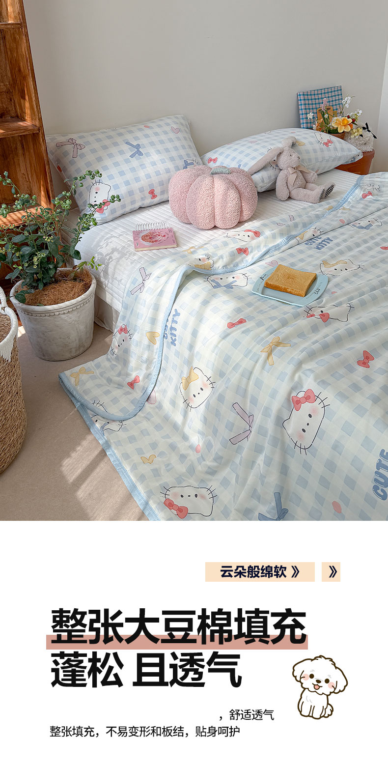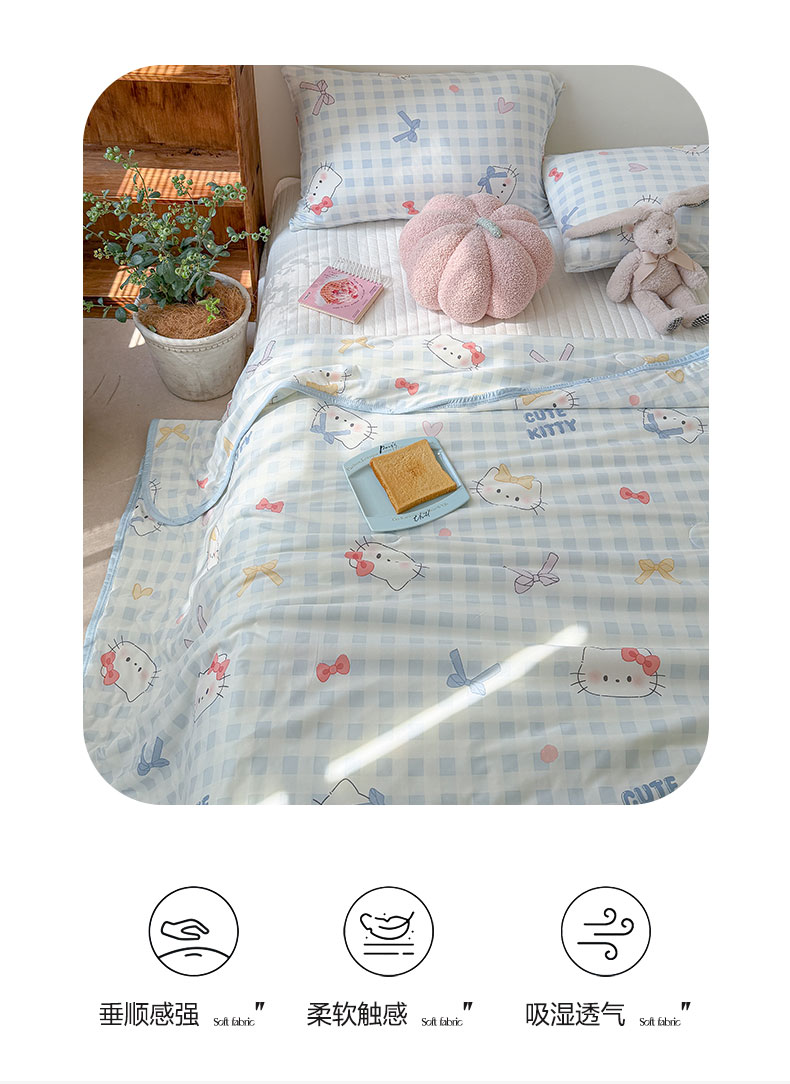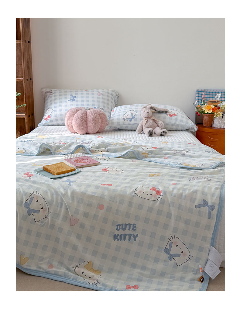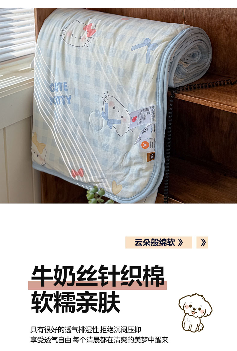 商品名称:桃子家居 2026新款A类卡通小清新印花高品质牛奶丝软糯针织棉包边夏被系列 针织棉-蓝格喵喵
