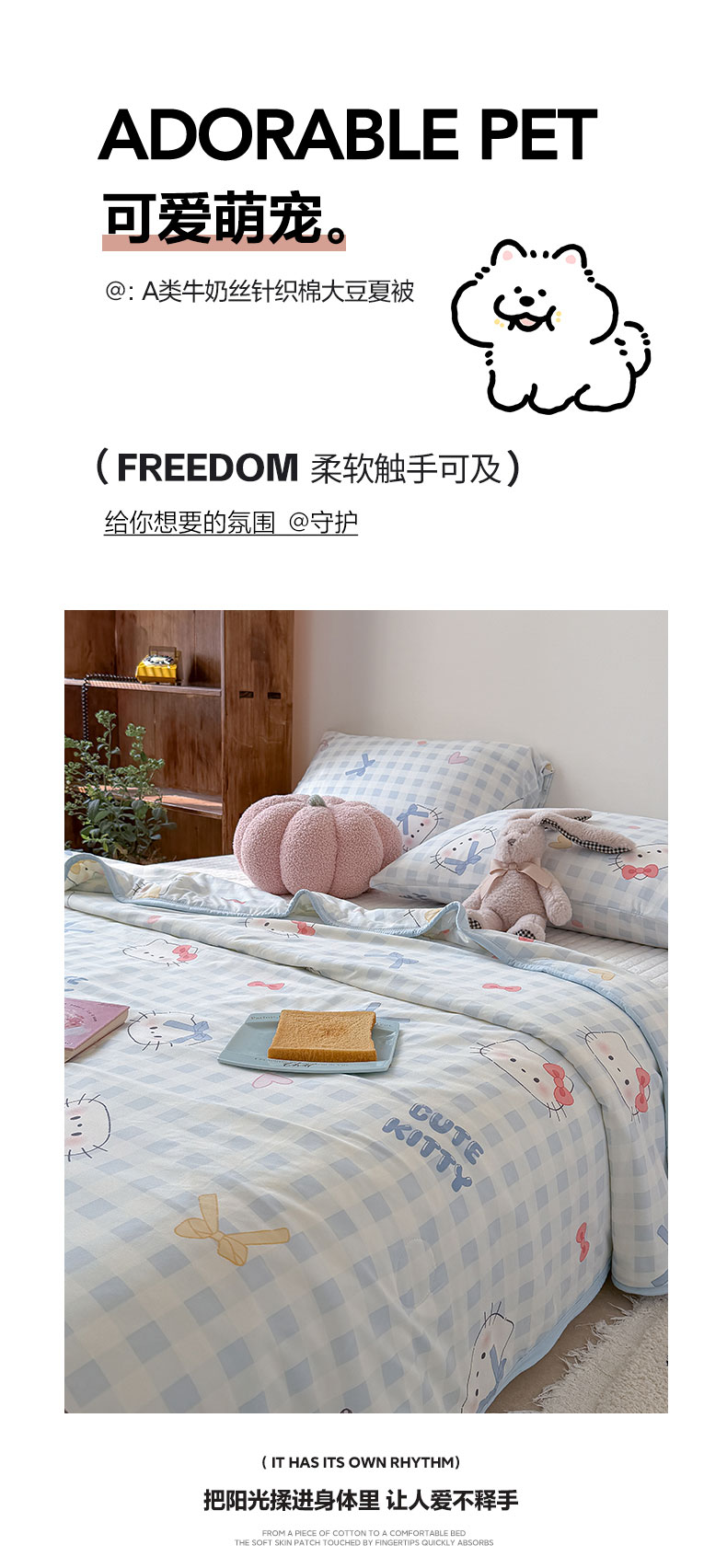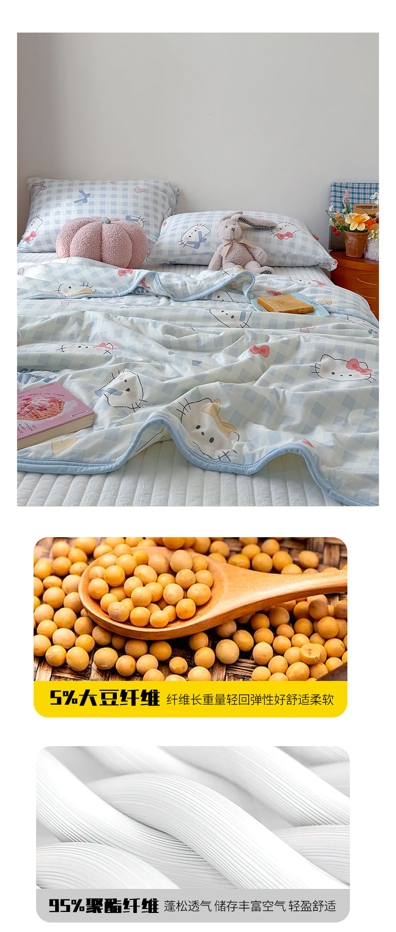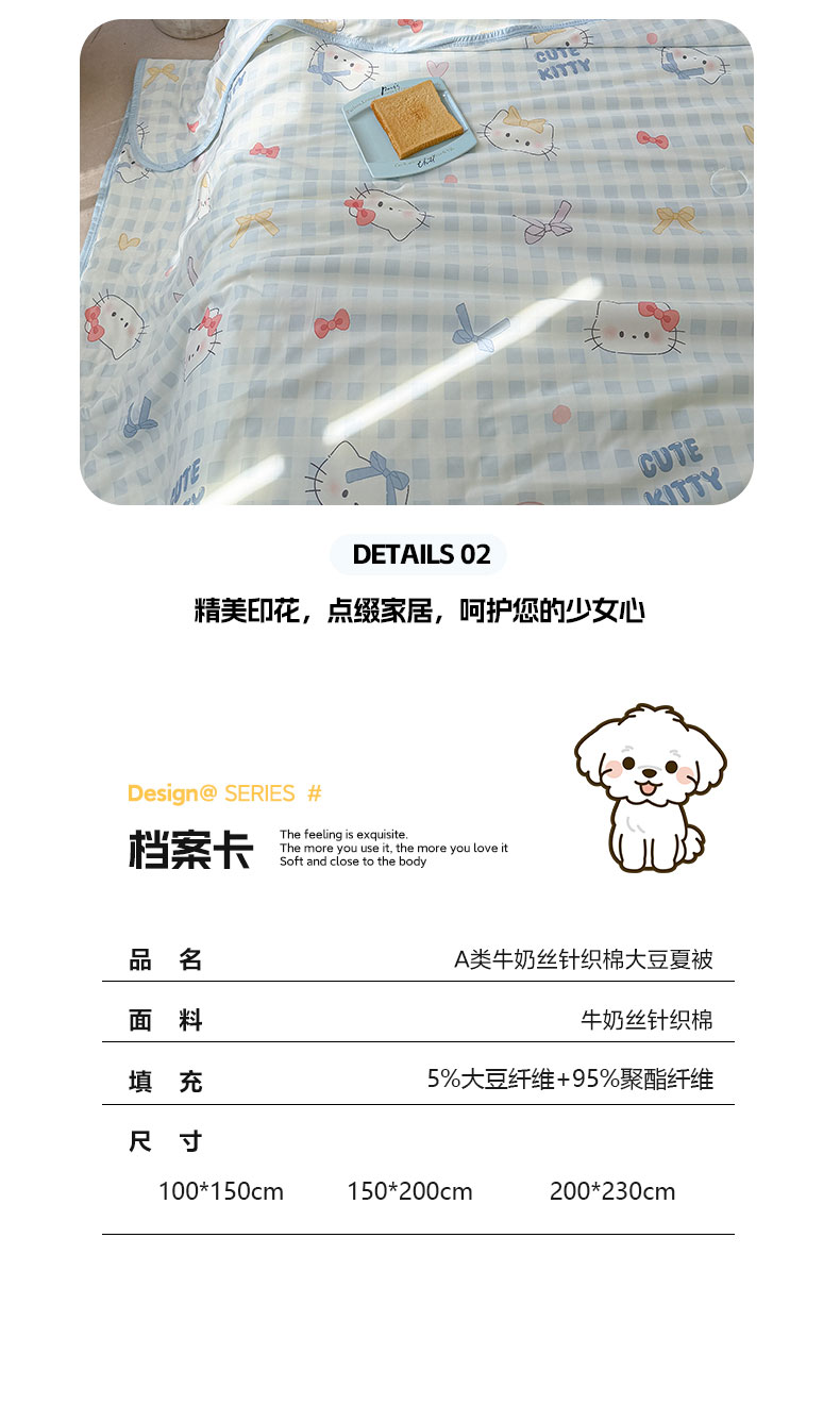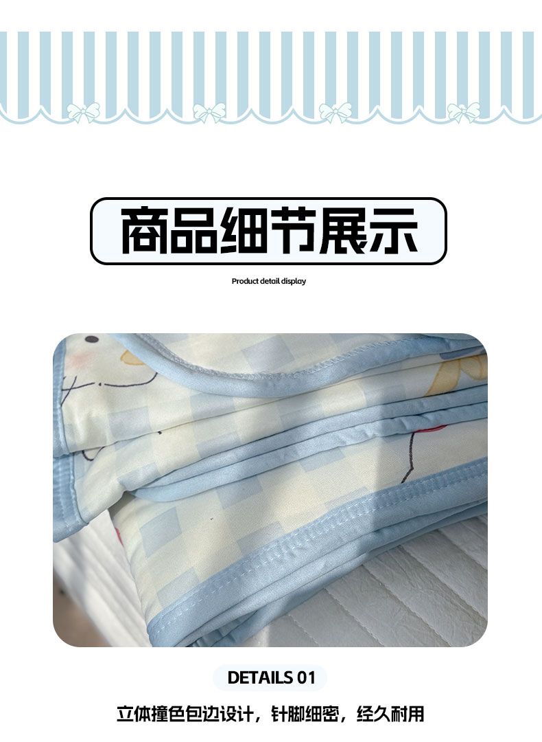 商品名称:桃子家居 2026新款A类卡通小清新印花高品质牛奶丝软糯针织棉包边夏被系列 针织棉-蓝格喵喵